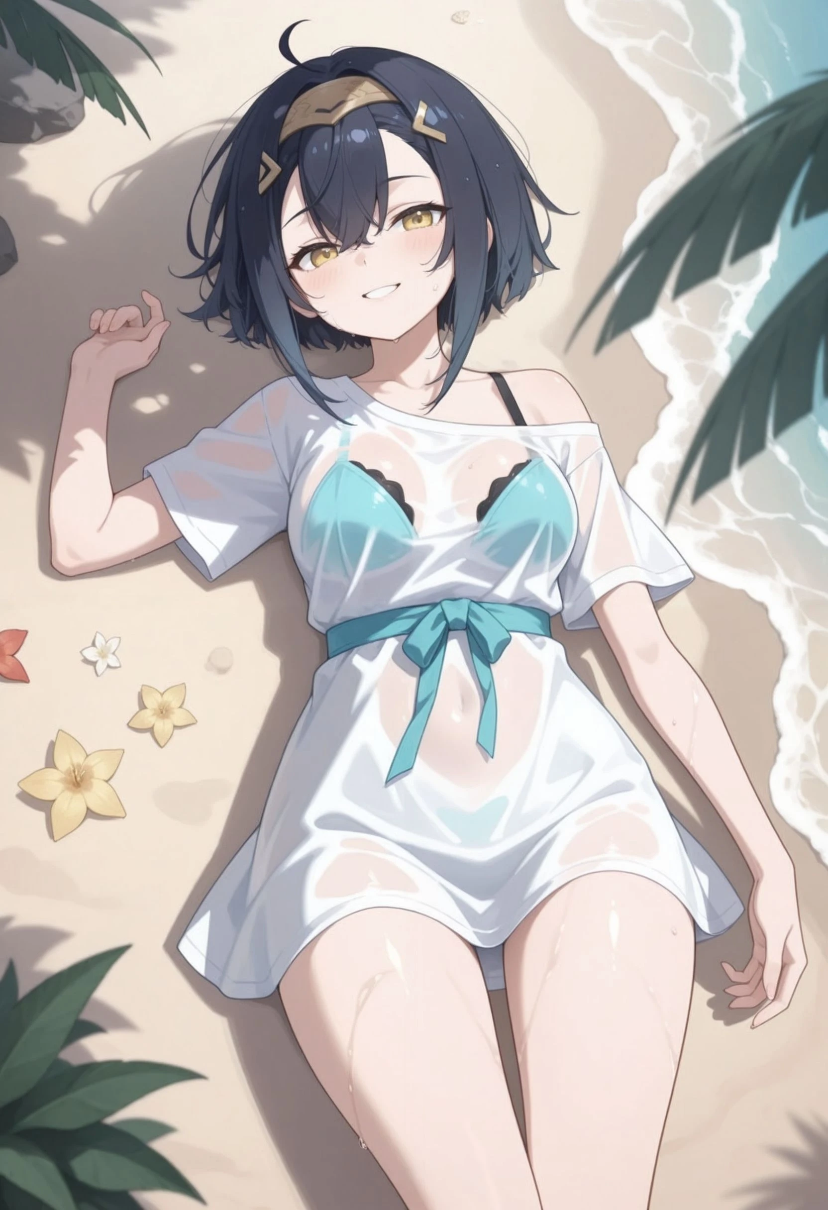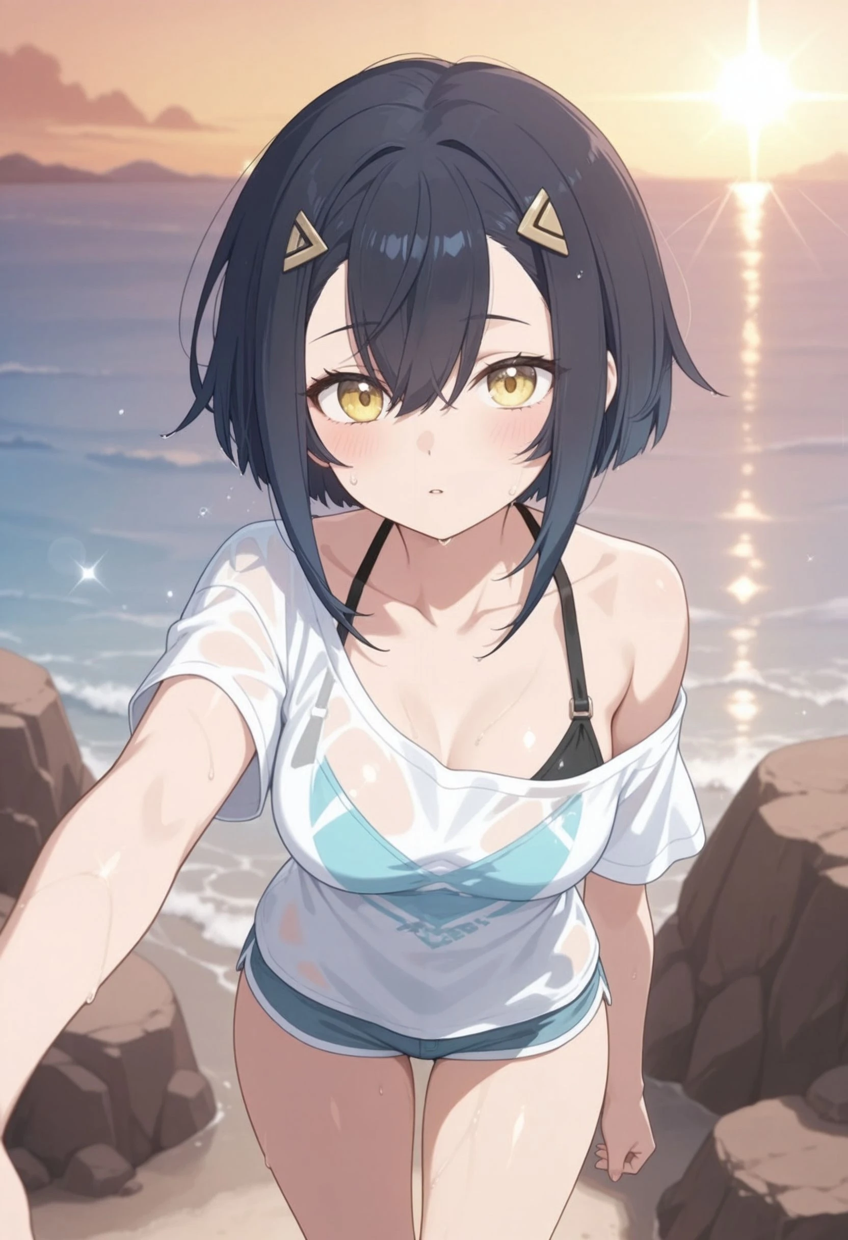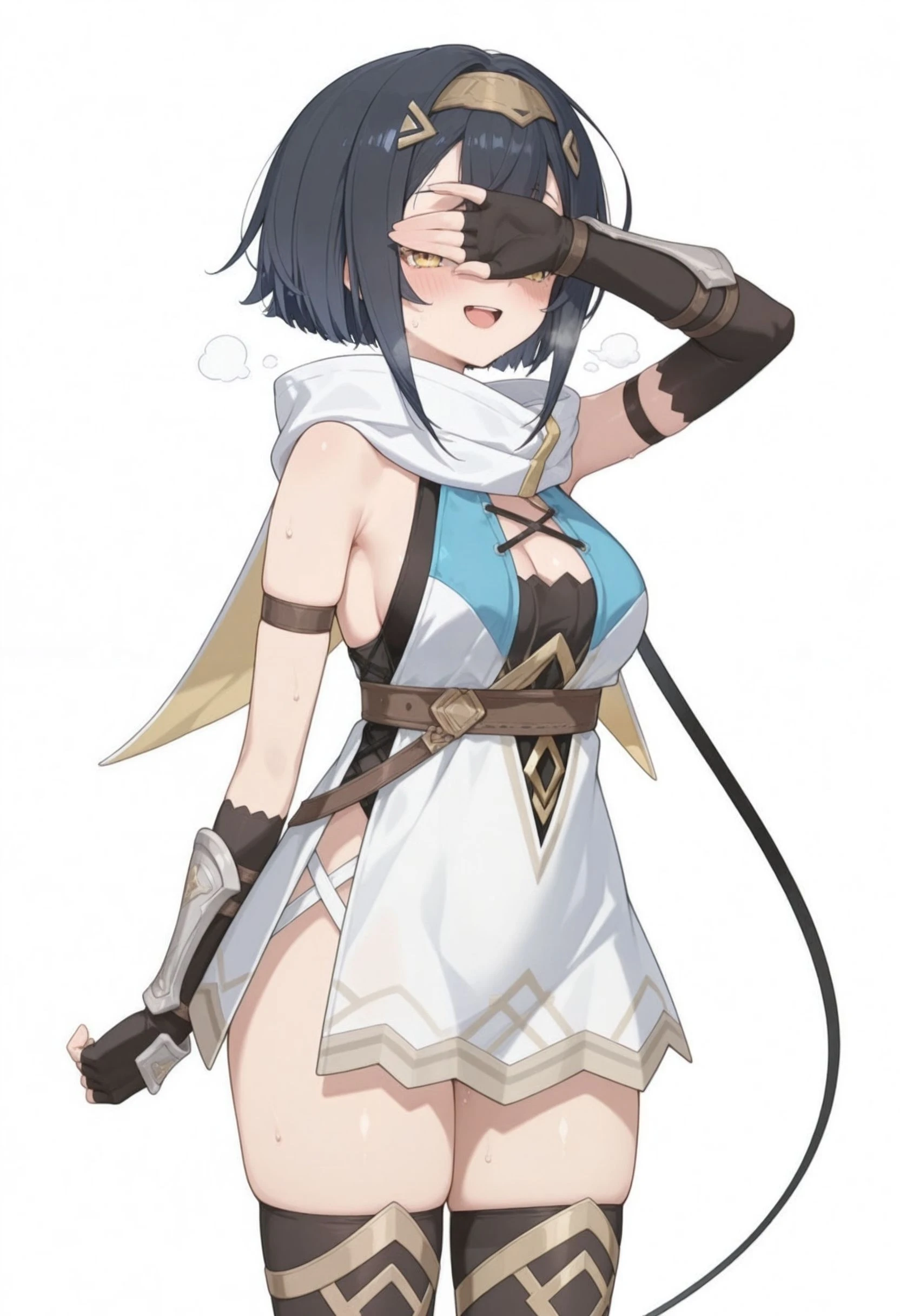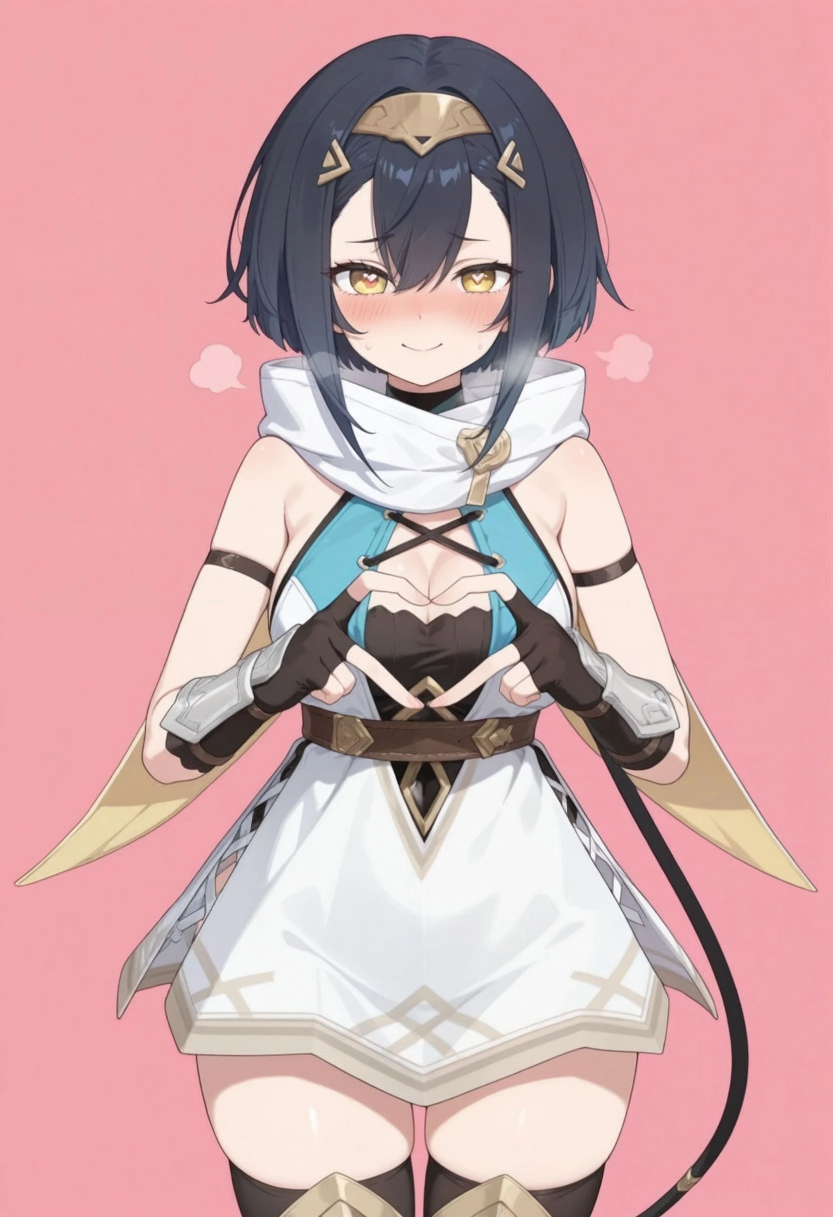 amber_\(stella_sora\), stllsrmbr, black hair, ???????, crossed bangs, hair between eyes, ??????????????, short dress, short hair, sidelocks, yellow eyes, bangs, <lora:stella_sora_amber_illustrious:0.8>Description