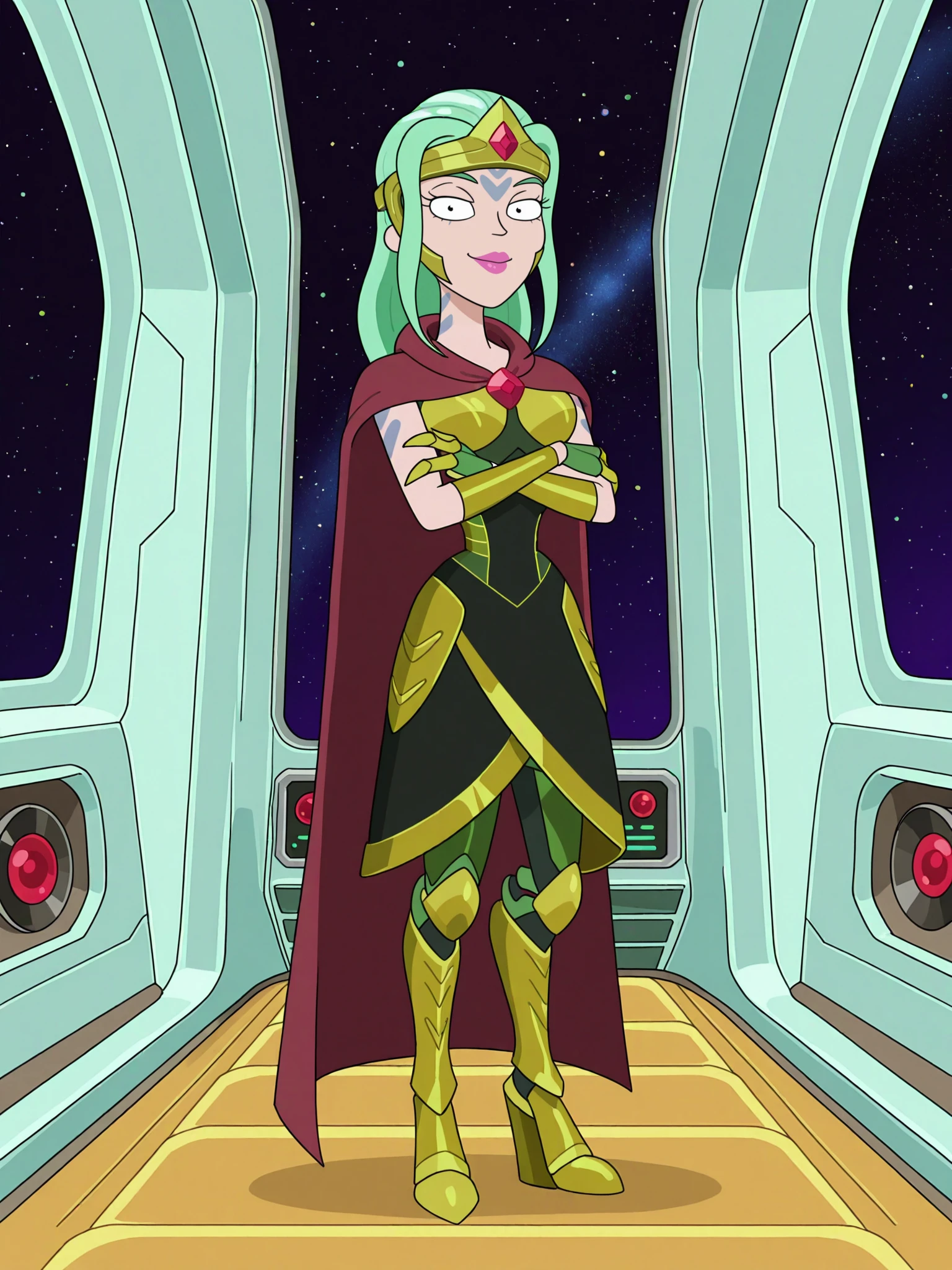 Armor Outift: rnm_buganne, arthropod girl, colored skin, fewer digits, facial mark, body markings, green hair, long hair, sidelocks, lipstick, crown, armored dress, armored gloves, armored boots, cape