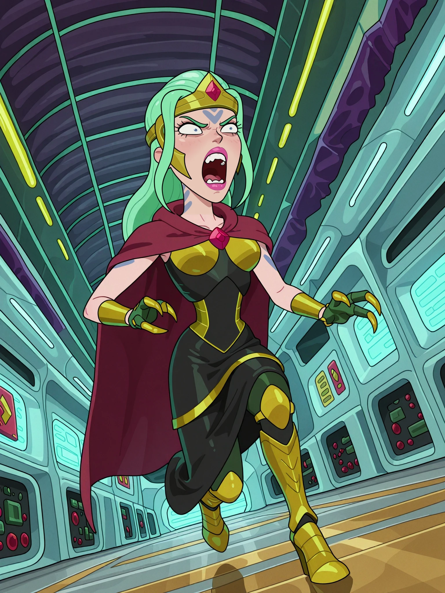 rnm_buganne, arthropod girl, colored skin, fewer digits, facial mark, body markings, green hair, long hair, sidelocks, lipstick, crown, armored dress, armored gloves, armored boots, cape