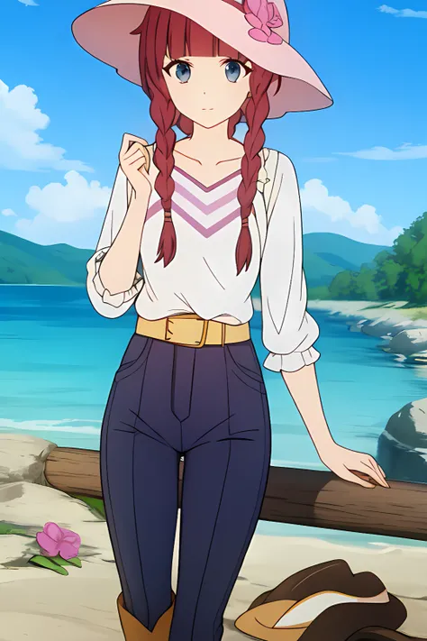hat, sun hat, hat flower, yellow belt, blouse, long sleeves, rolled up sleeves, boots, high waist pants, knee boots, brown footwear