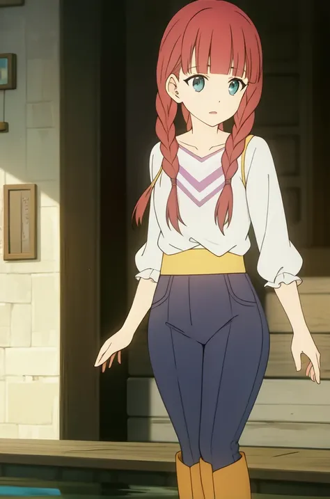 yellow belt, blouse, long sleeves, rolled up sleeves, boots, high waist pants, knee boots, brown footwear