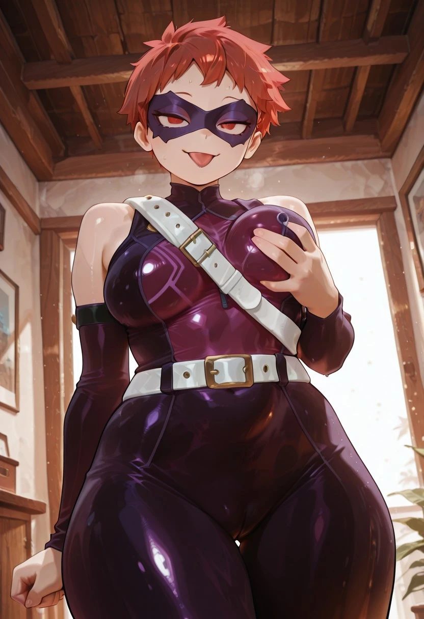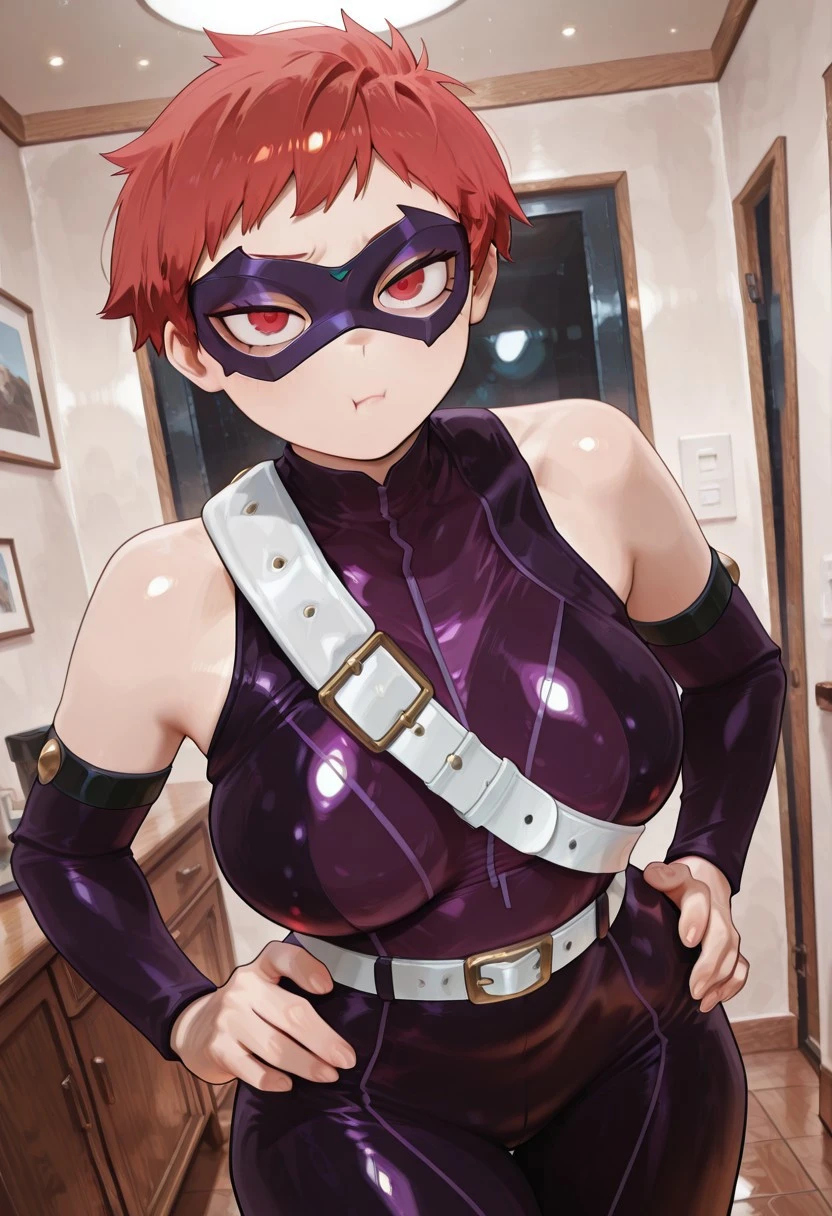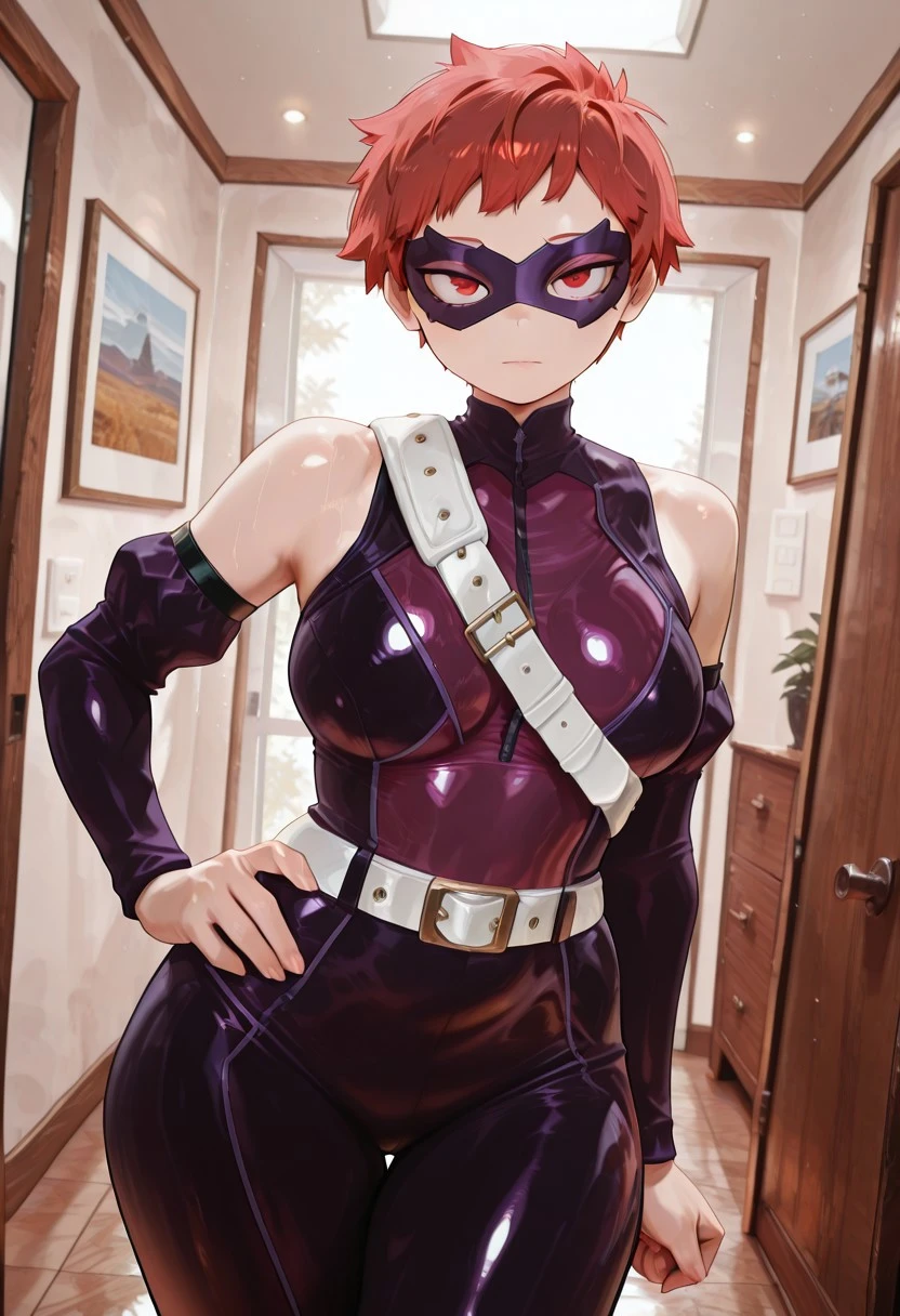yuyumhaherocost ,1girl , red hair, short hair, very-short hair , , red eyes, purple mask, hero mask , black straps, white belt , shoulder blet , , purple , , high-neck , detached sleeves, tight sleeves , arms straps ,black straps
