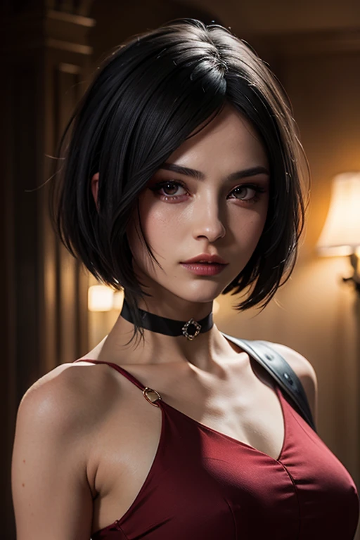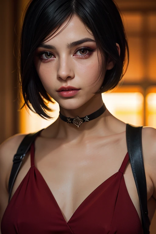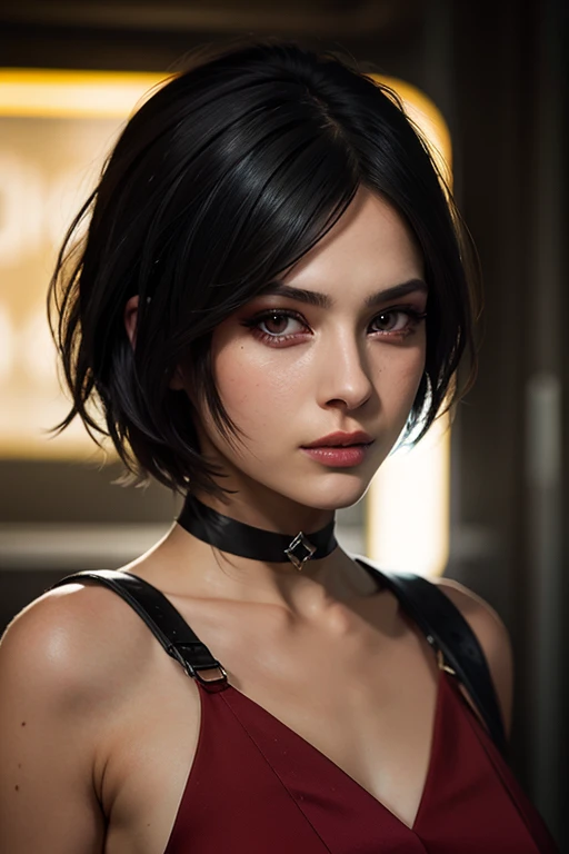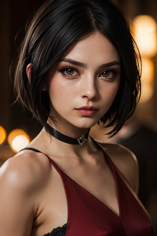prompt: A stunning full color intricate portrait in Ultra-HD, 24 year old girl, detailed face, short black hair, black eyes, makeup, red dress, neckline, right side sheath, choker, epic character composition. . alessio albi, nina masic, sharp focus, natural lighting, subsurface dispersion, f2, 35mm