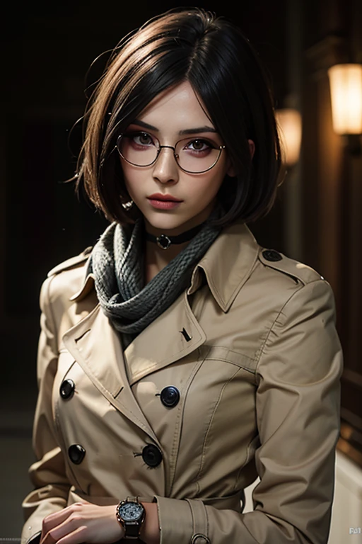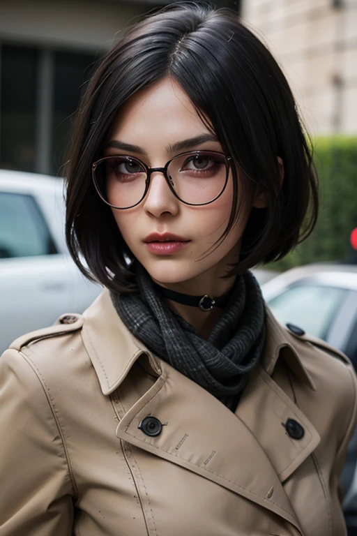 A stunning full color intricate portrait in Ultra-HD, 24 year old girl, detailed face, short black hair, black eyes, makeup, wearing a high collar coat, black sunglasses, a gray scarf around her neck, watch bracelet, case, neckline, choker, epic character composition, alessio albi, nina masic, sharp focus, natural lighting, subsurface dispersion, f2, 35mm,