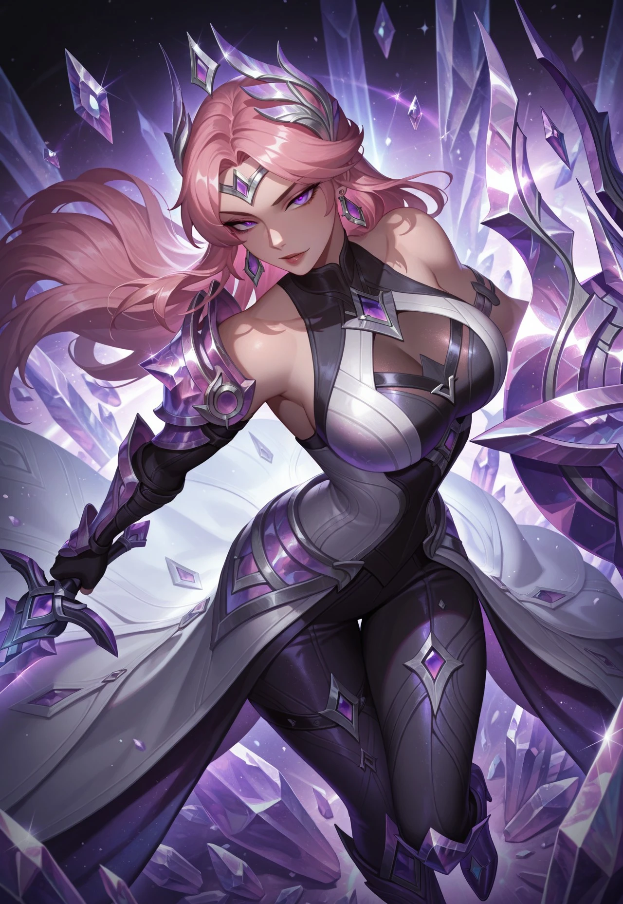 CMleona,long hair,hair ornament,asymmetrical clothes, shoulders,multicolored dress,long dress,armor,high heels boots,earrings,purple crystals,crystals,sword,shield,
