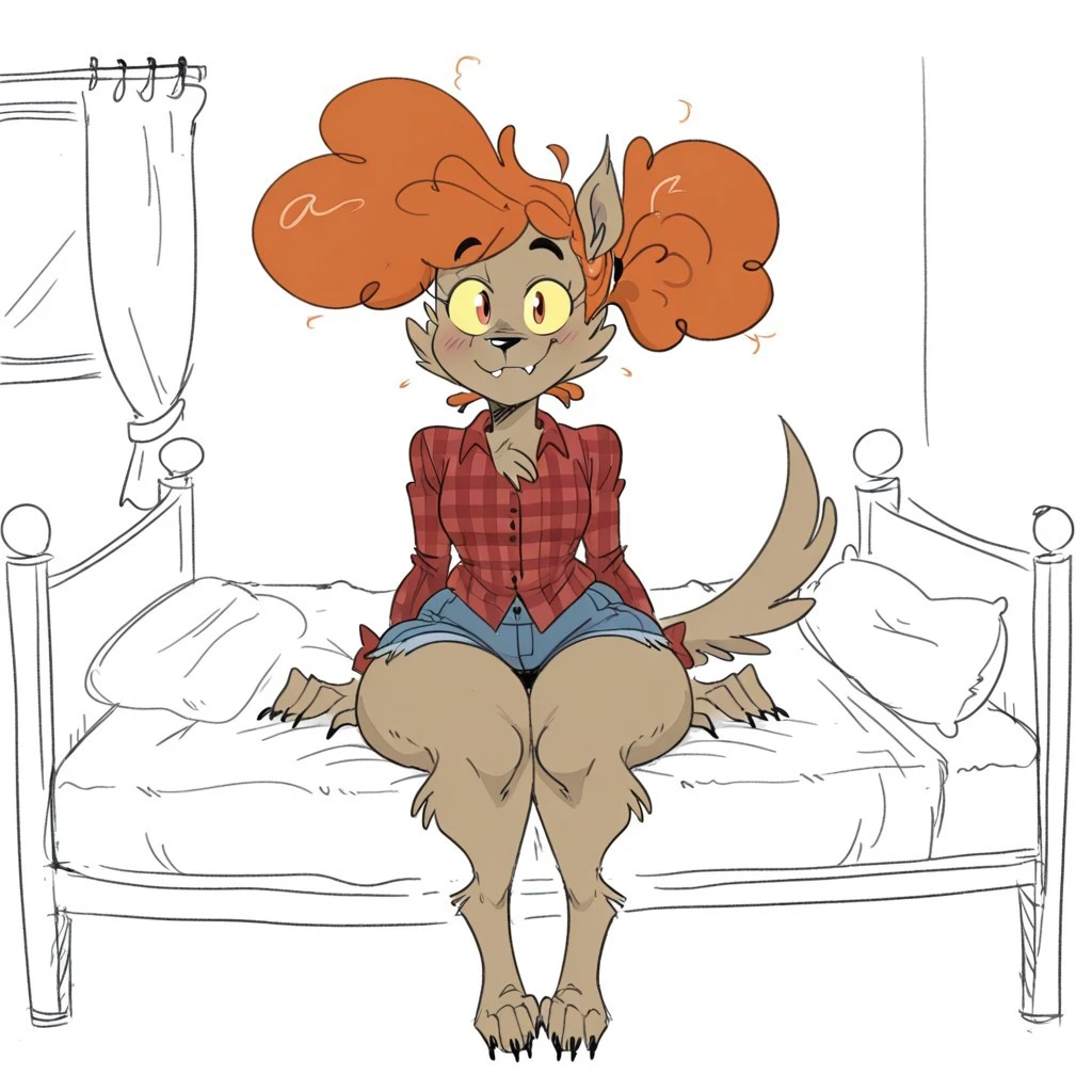 wolf, wolf girl, werewolf, brown fur, orange hair, ponytail, black pupil, yellow sclera, black nose, wolf ears, wolf tail, claws, wide hips, digigrade, small breasts,