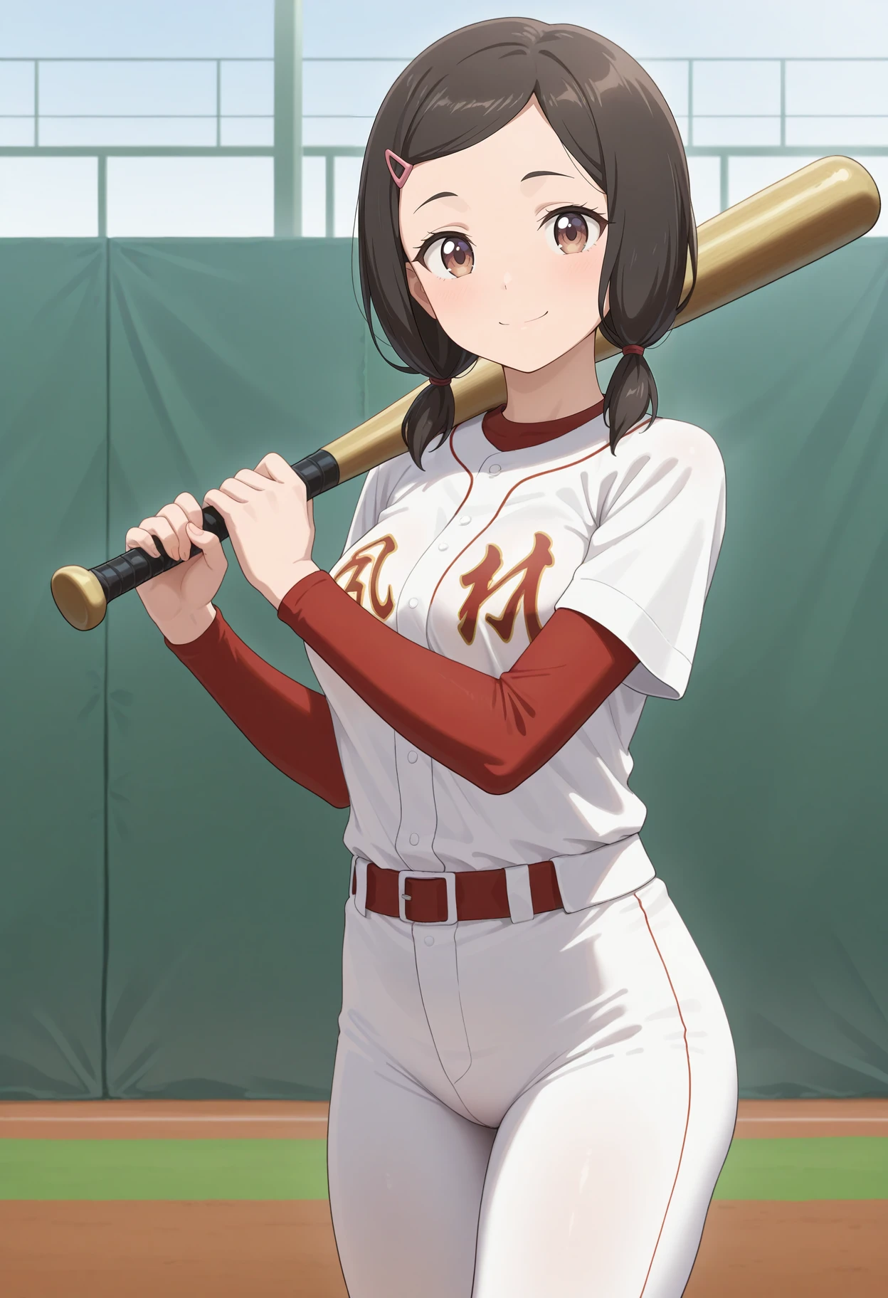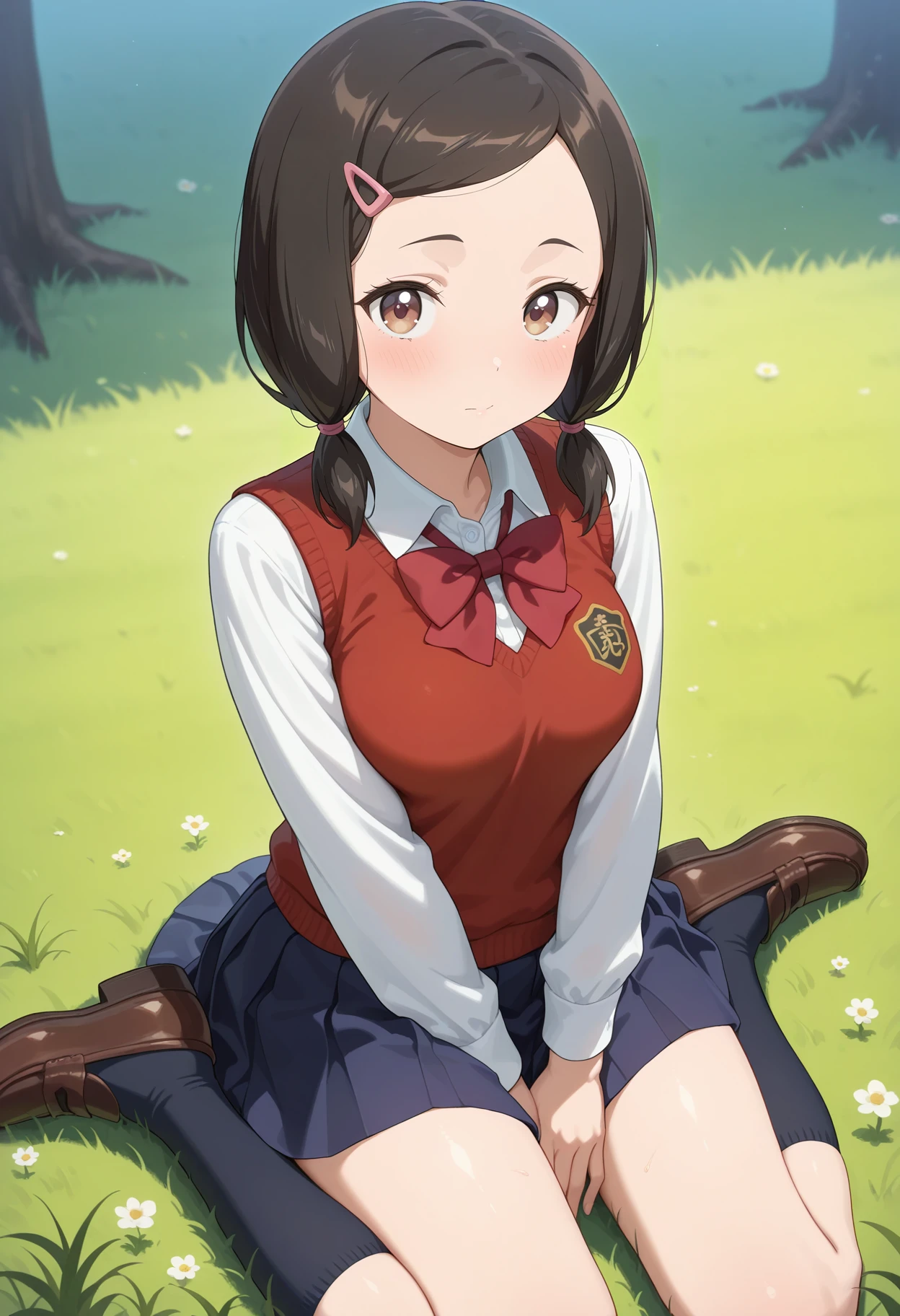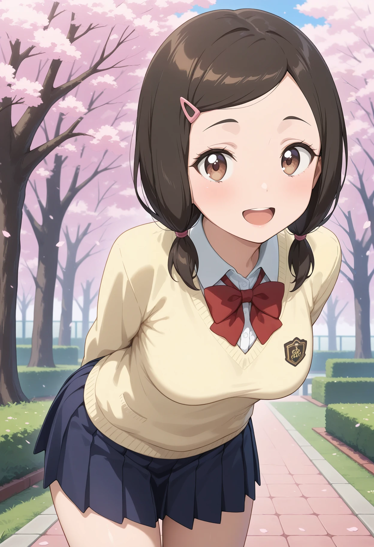 character appearanceaachisato, black hair, short twintails, low twintails, swept bangs, hair ornament, hairclip, brown eyes, medium breasts