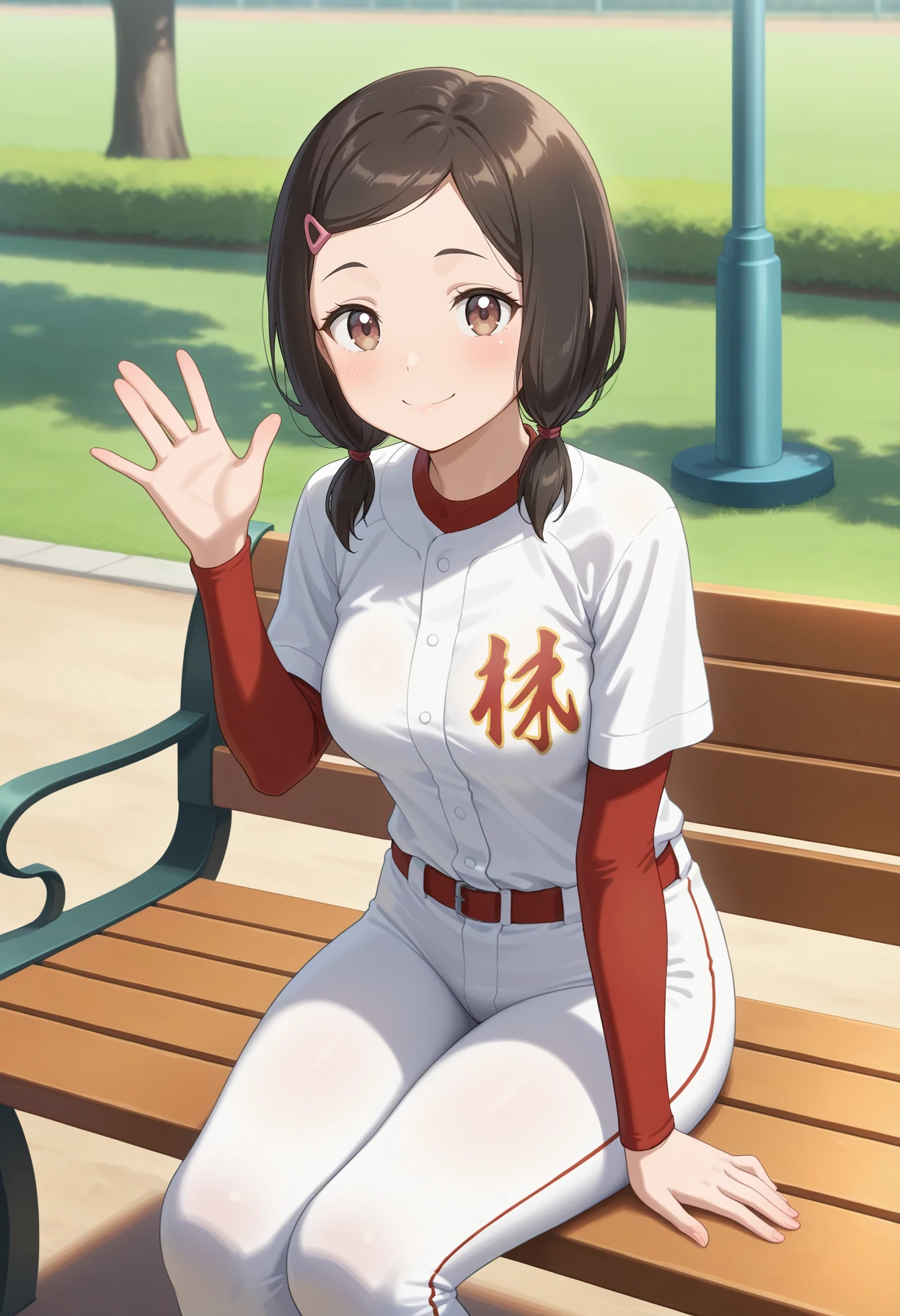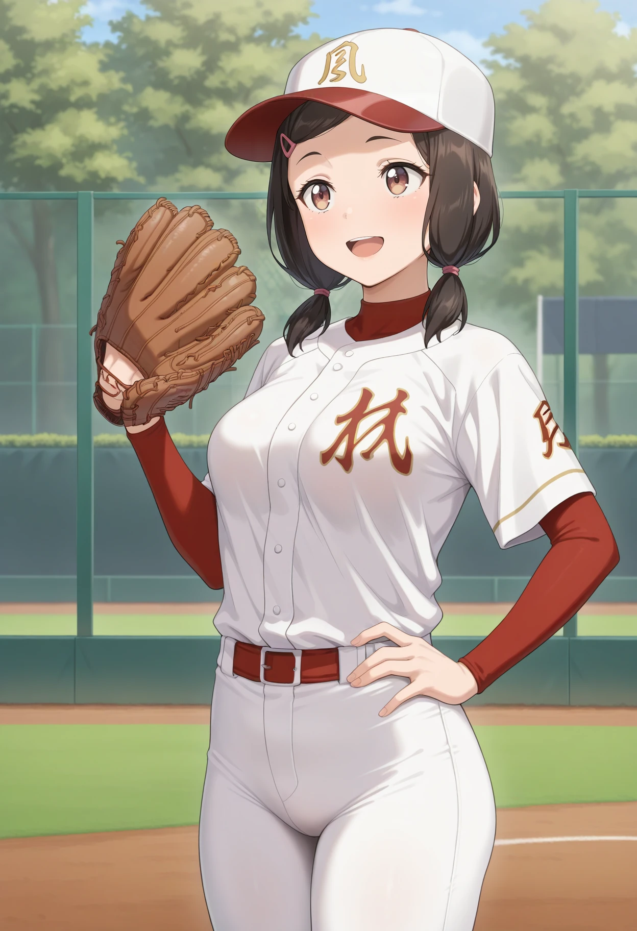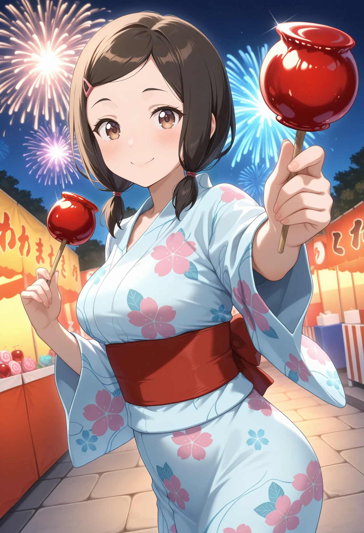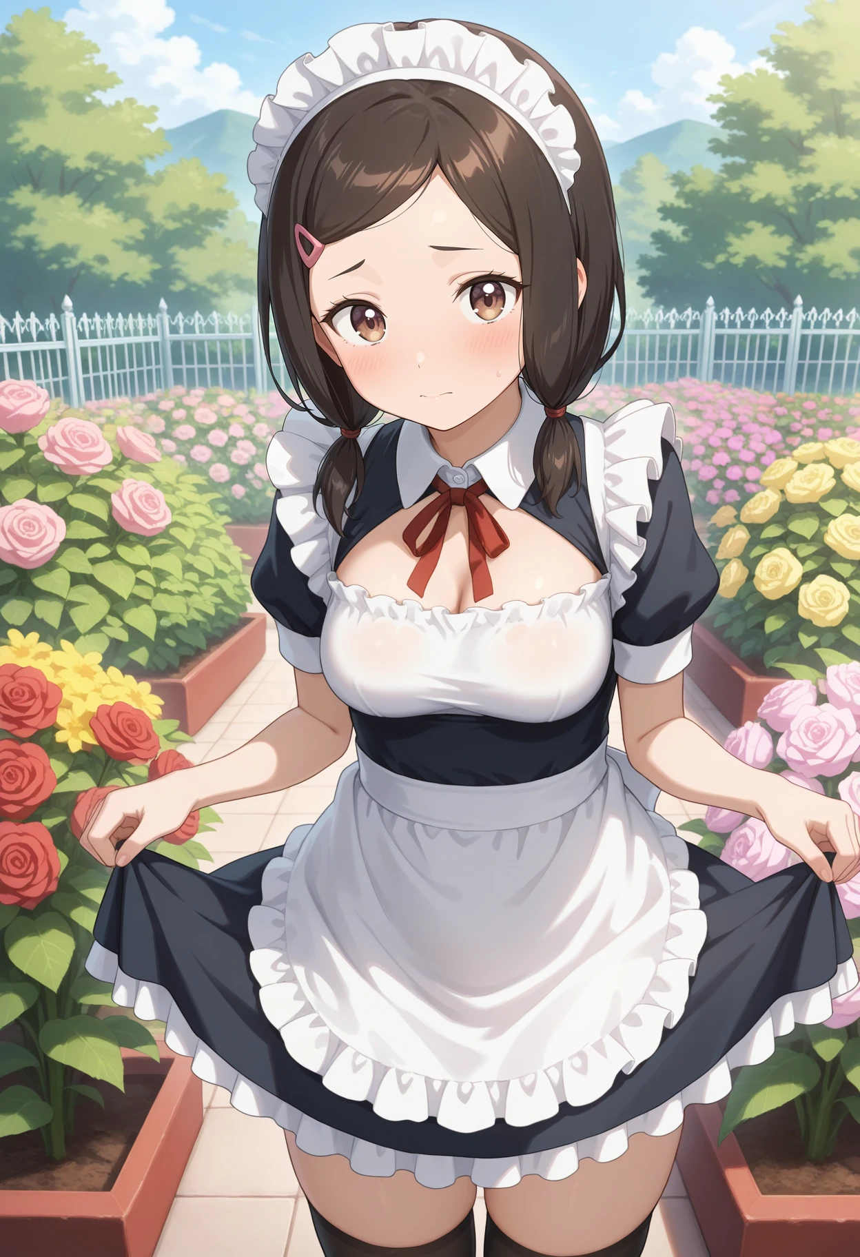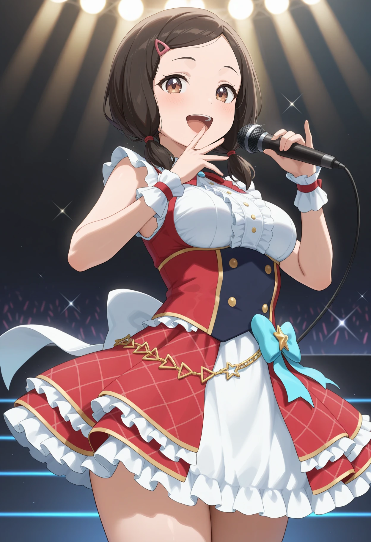 aachisato, black hair, short twintails, low twintails, swept bangs, hair ornament, hairclip, brown eyes, medium breasts