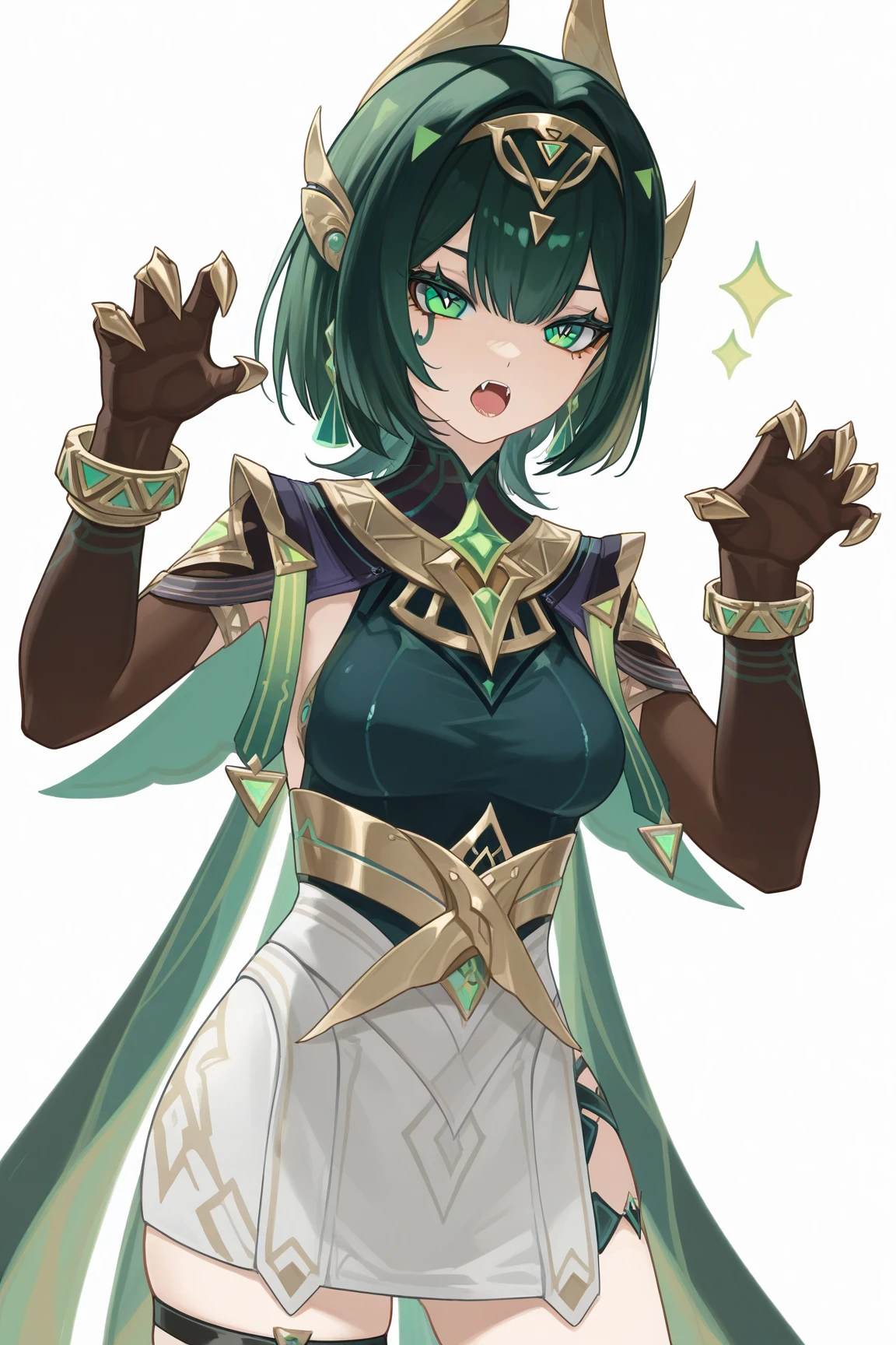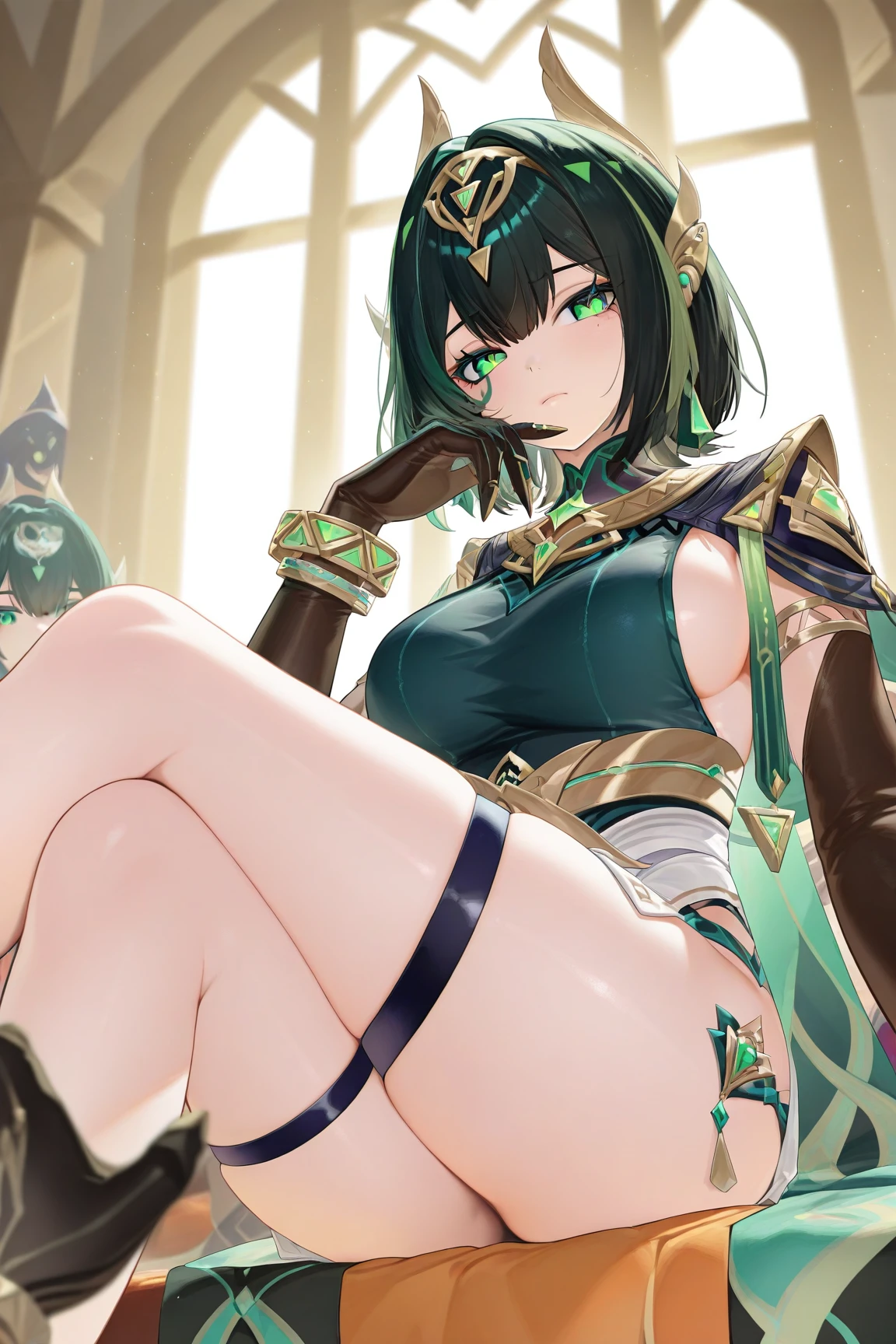 nefer \(genshin impact\), 1girl, green eyes, green hair, short hair, gloves, jewelry, thigh strap, elbow gloves, black gloves, hair ornament, horns, dress, earrings, high heels