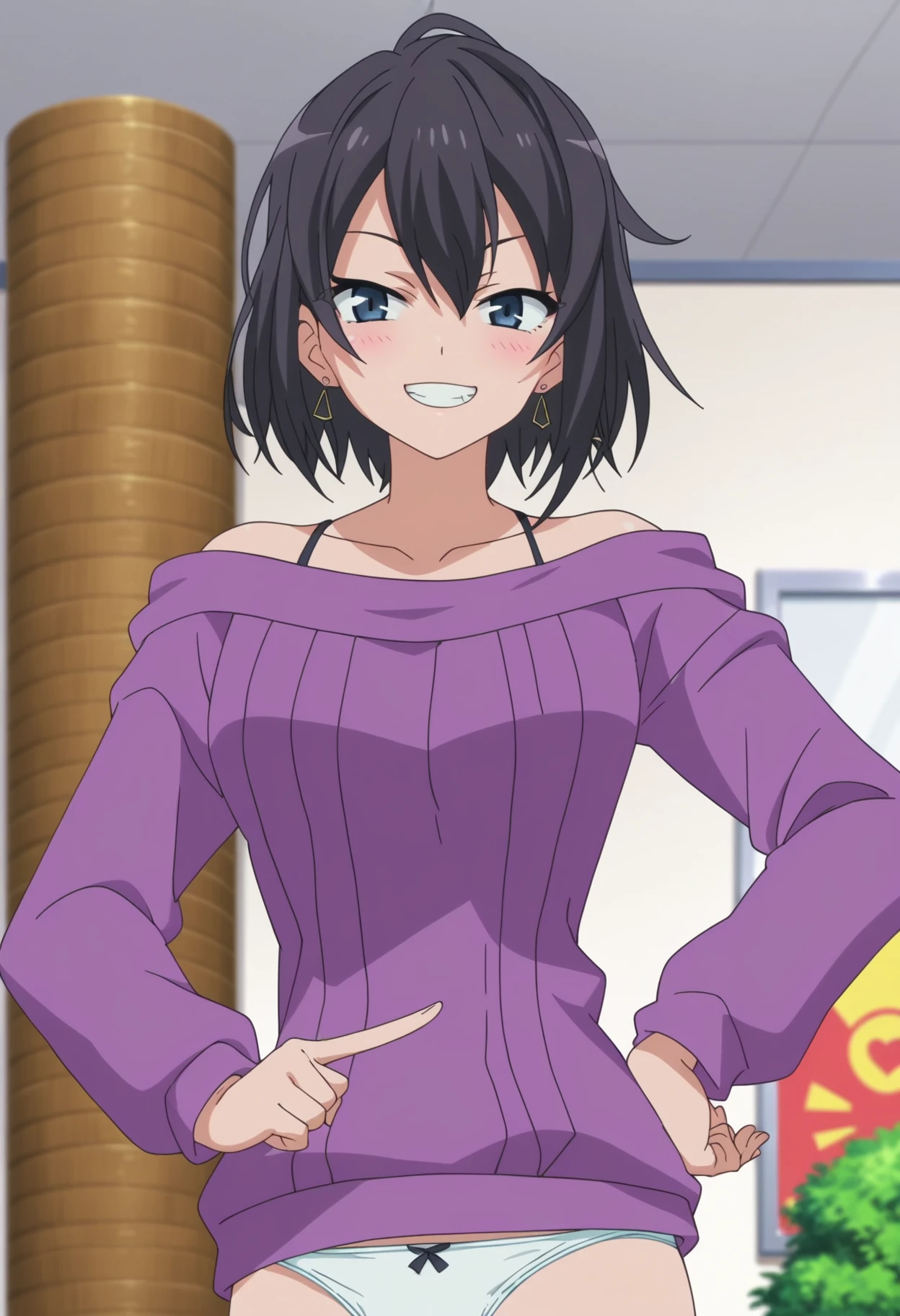 haruple, short hair, black hair, blue eyes, off-shoulder sweater, hair between eyes, jewelry, bare shoulders, collarbone, earrings, purple sweater, white pants,
