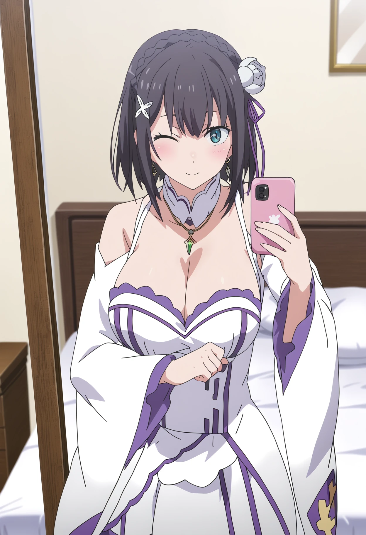 harimono, short hair, black hair, blue eyes, side ponytail, ponytail, medium breasts, cleavage, hair ornament, kimono, sash, yukata, sash, obi, japanese clothes, flower,