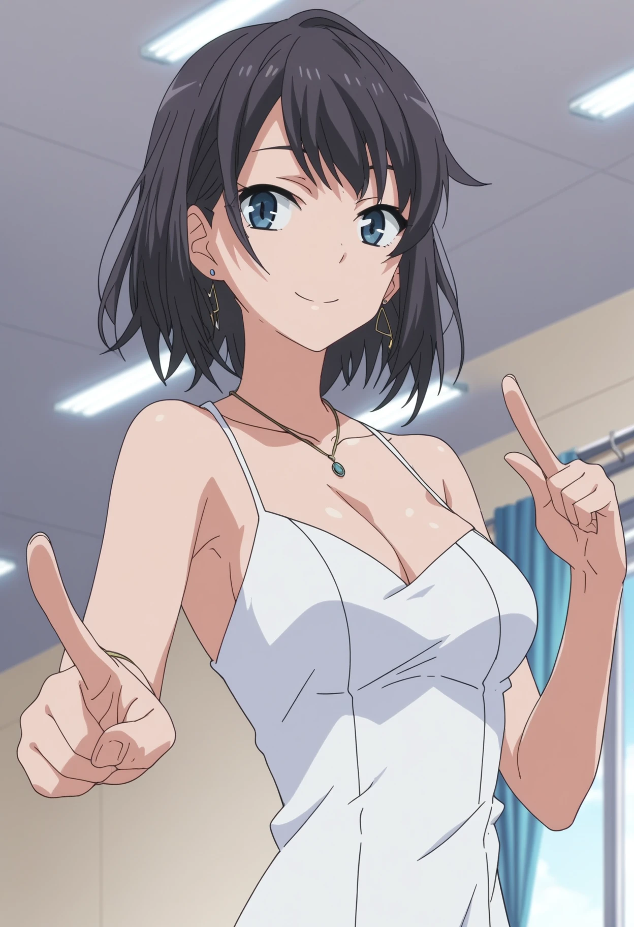 harng, short hair, black hair, blue eyes, earrings, necklace,