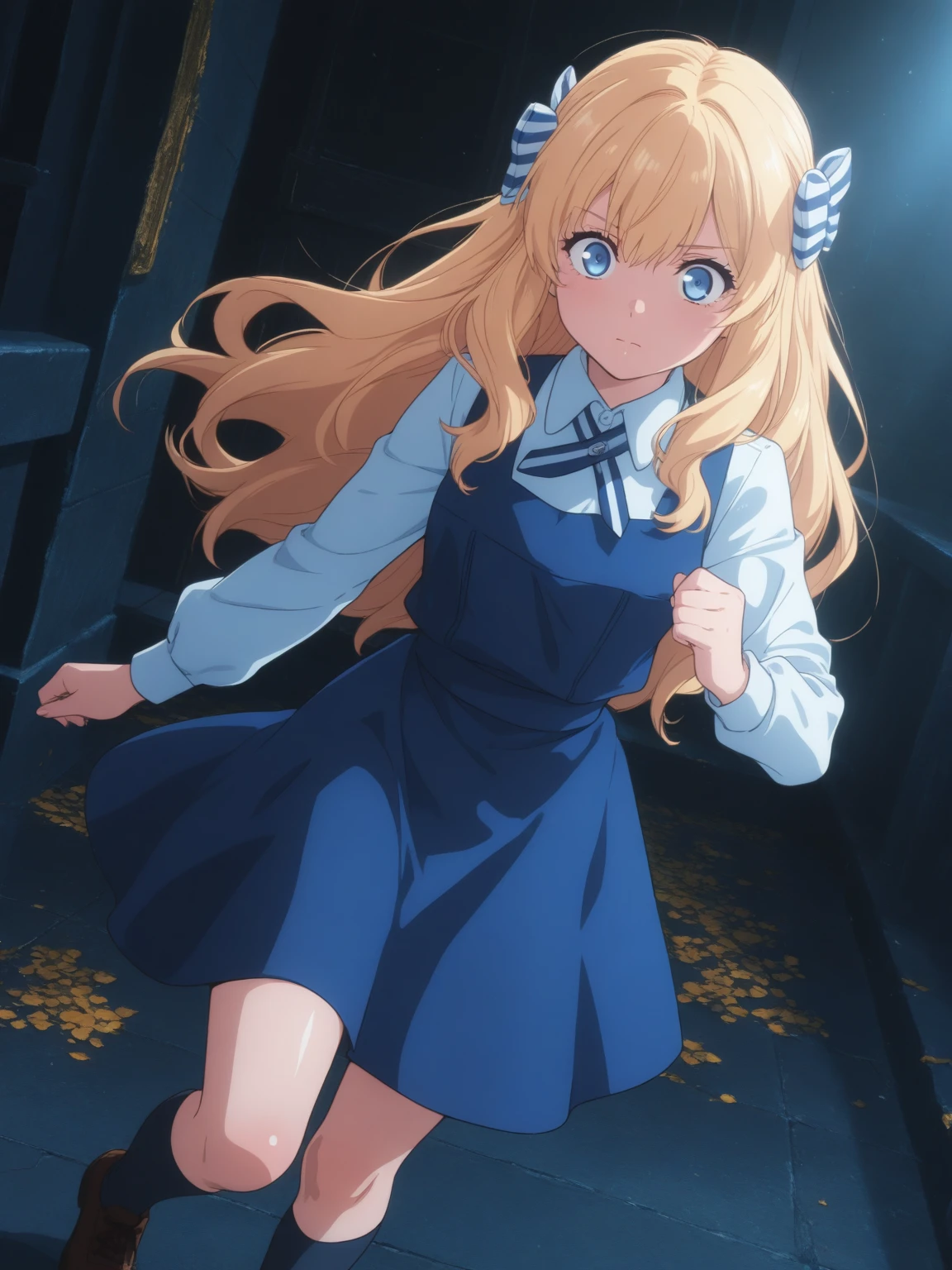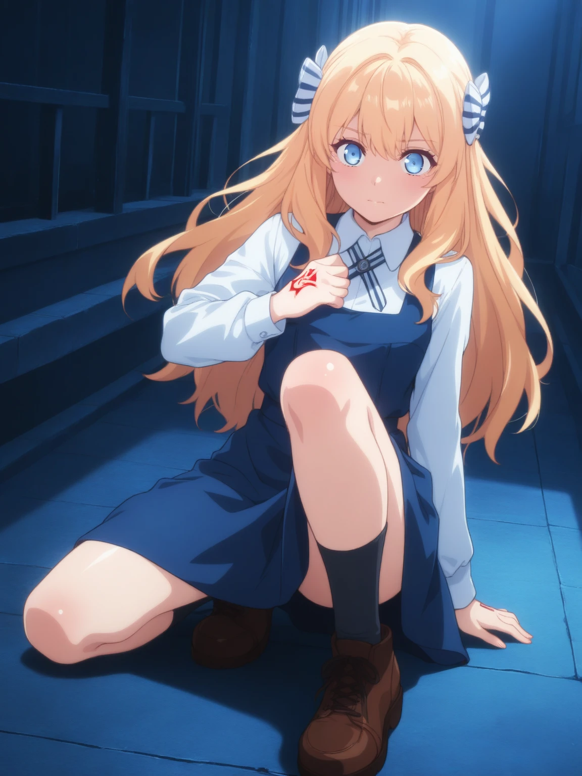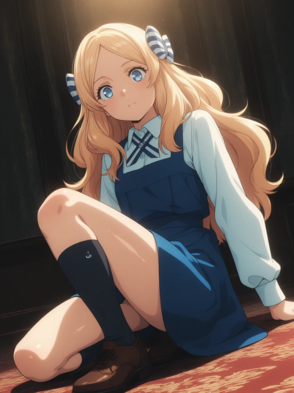 • Clothes: (white collared shirt, long sleeve, blue dress, neck ribbon, knee socks, brown shoes)