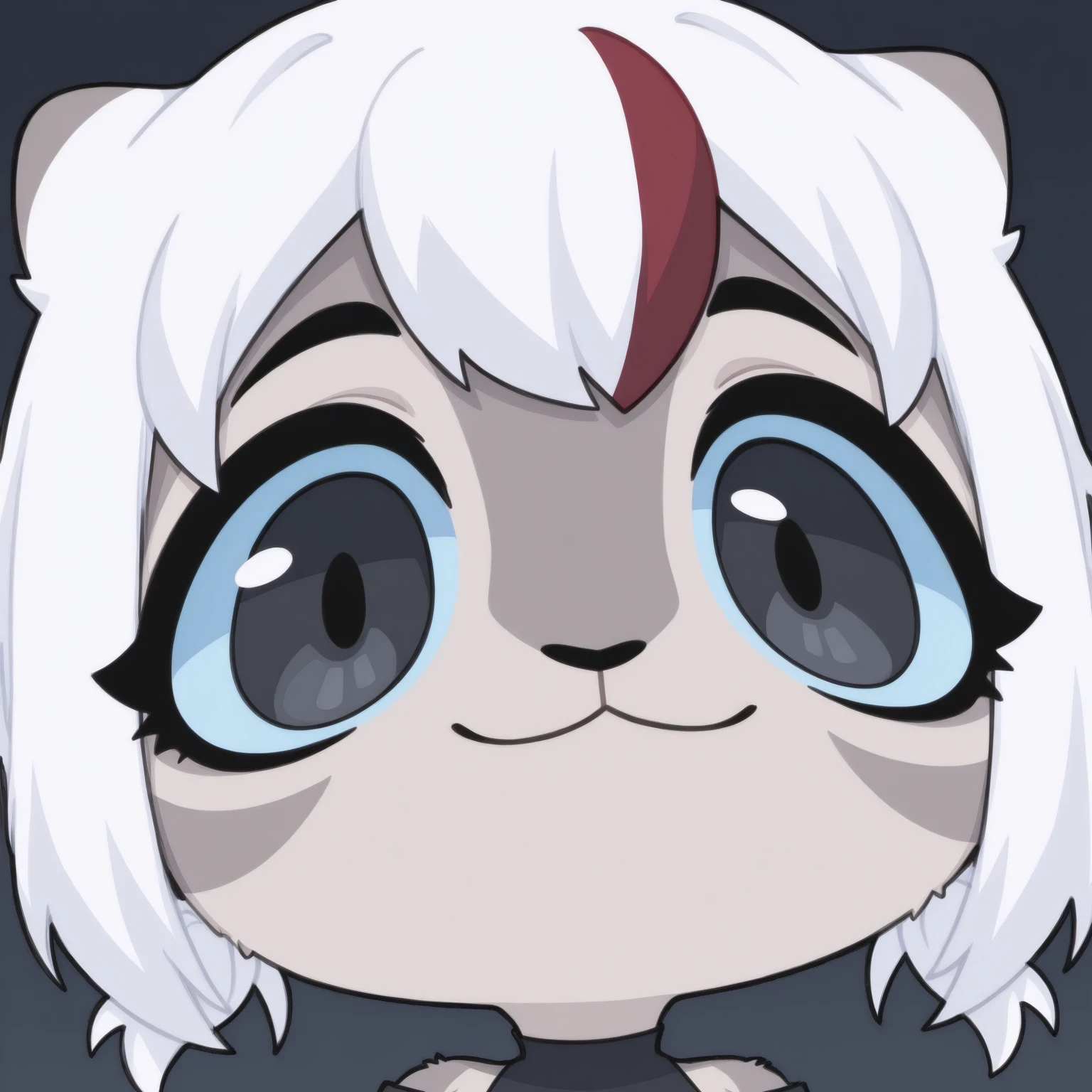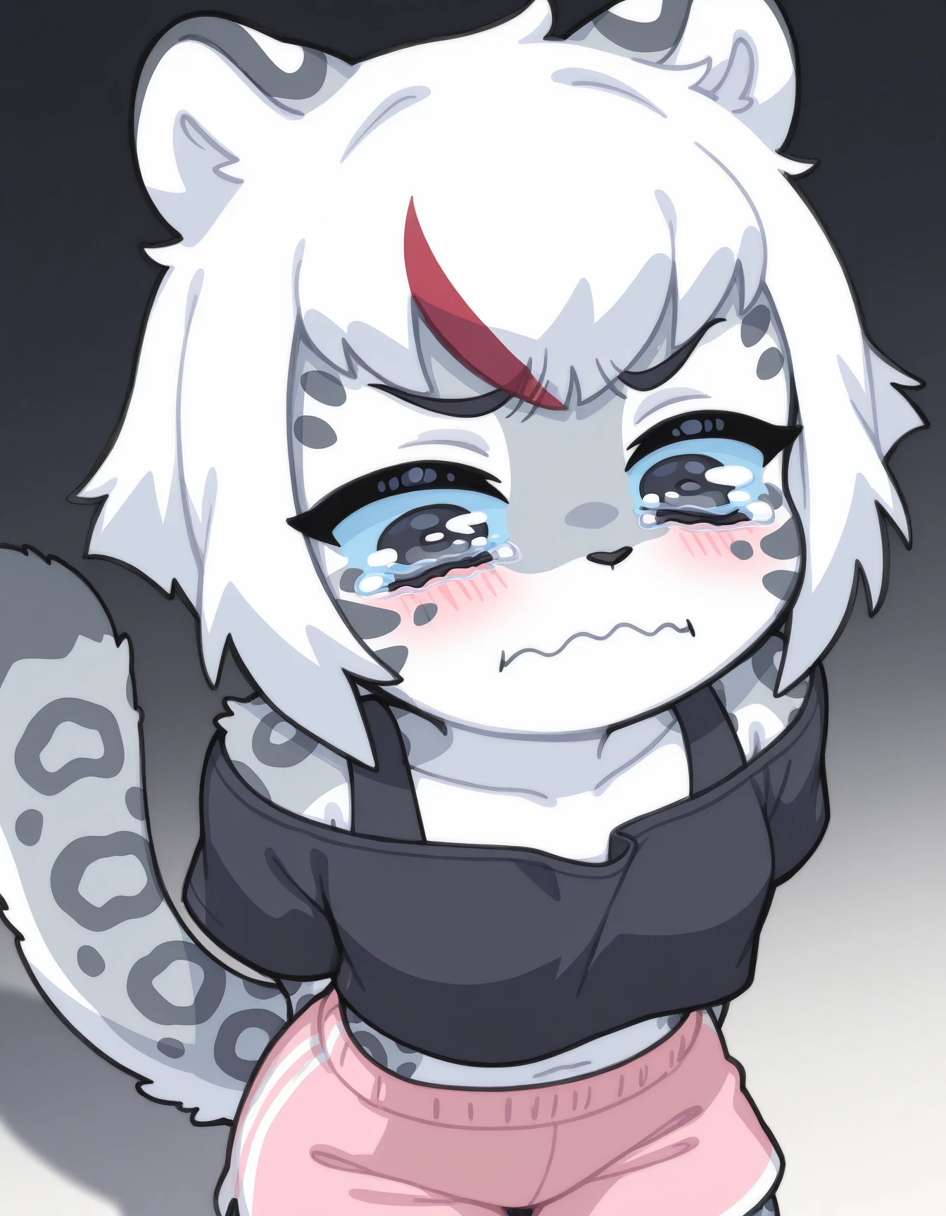 Uma, solo, snow leopard, short white hair, red bangs, black nose, gray fur, pink shorts, black crop top, black eyes, blue sclera, bare neck
