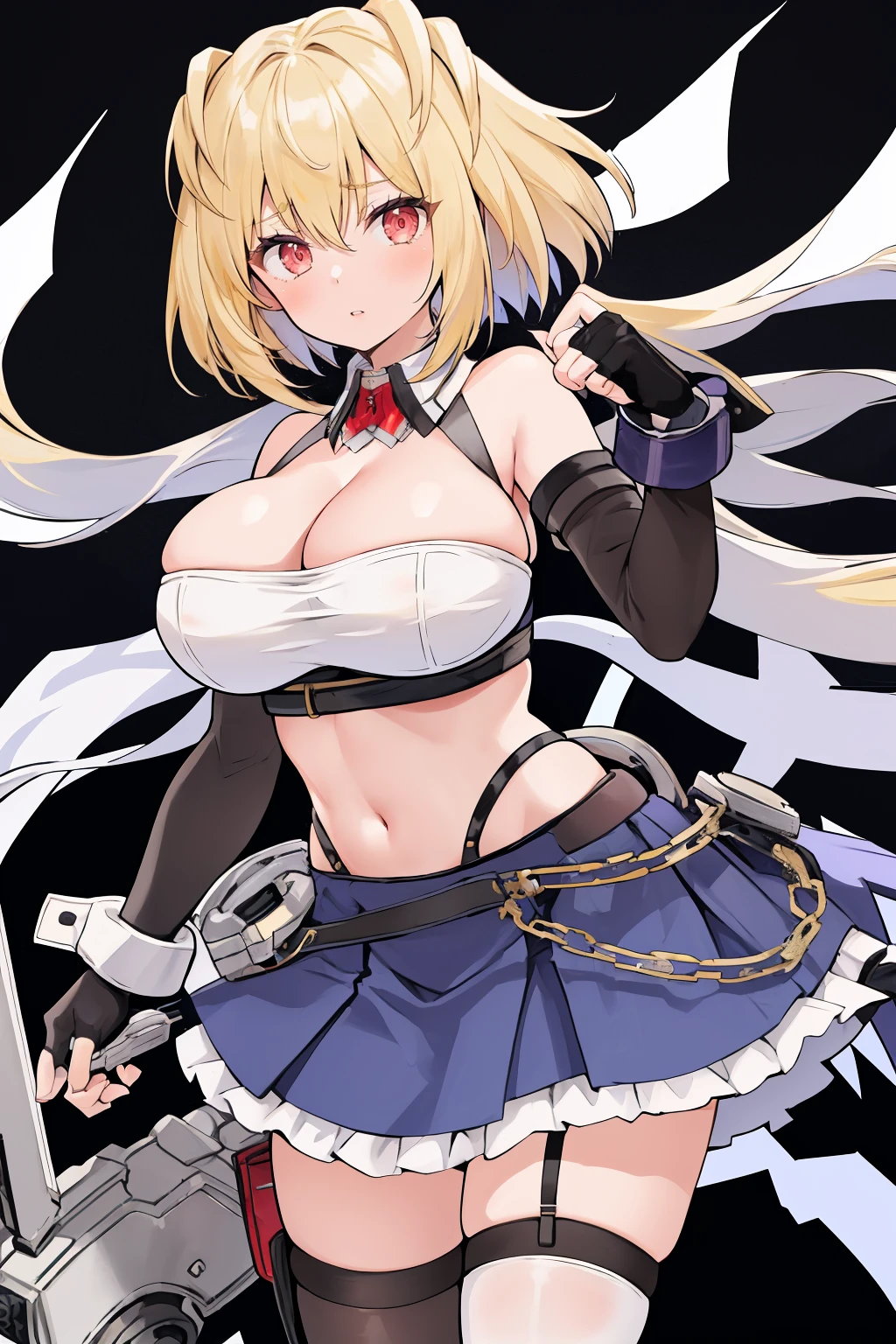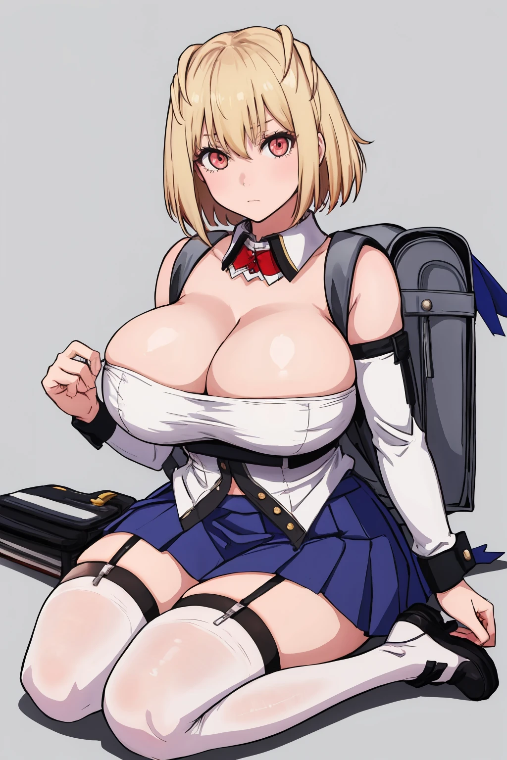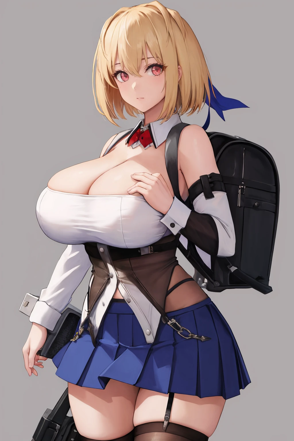claire, bare shoulders, detached collar, cleavage, detached sleeves, skirt, thighhighs, garter straps, backpack