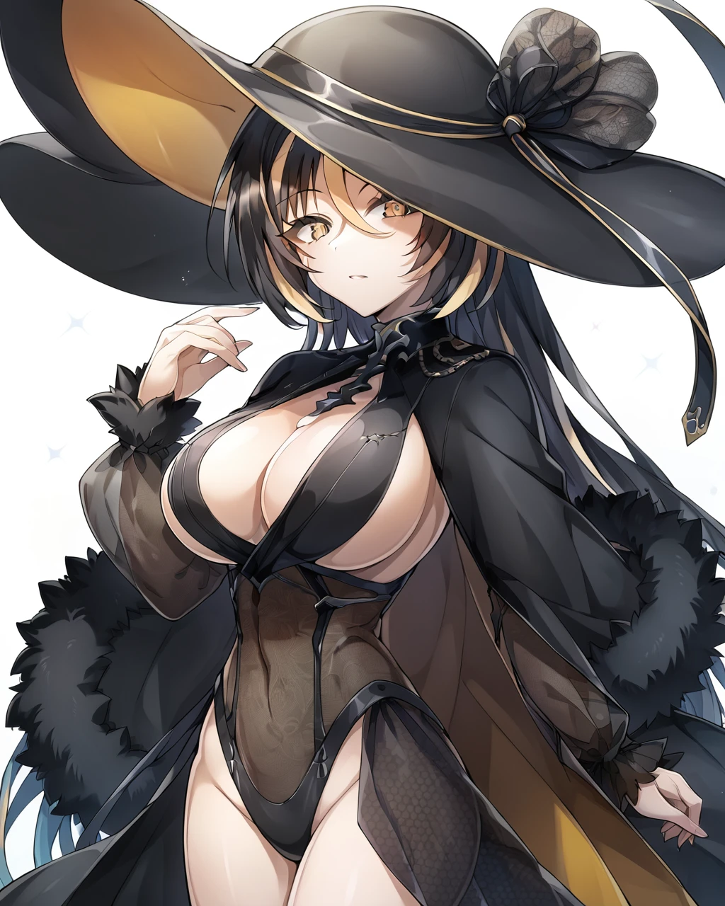 multicolored hair, long hair, hair between eyes, large breastsSome outfit examples: