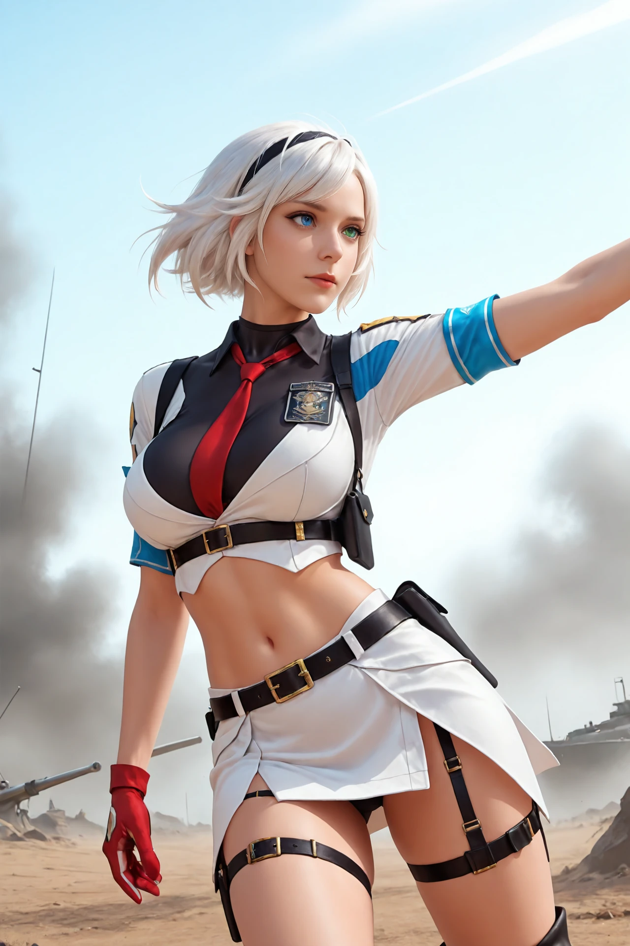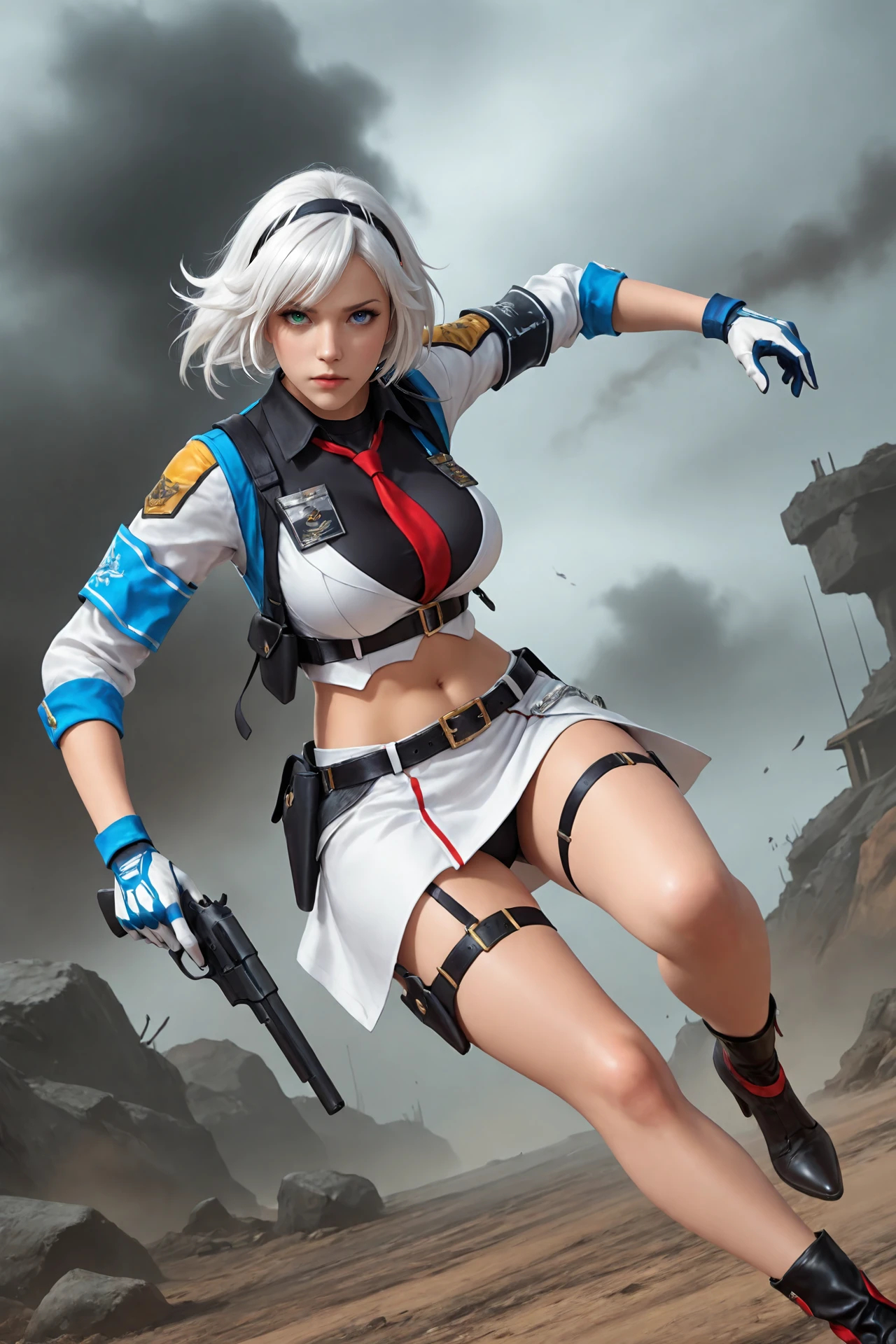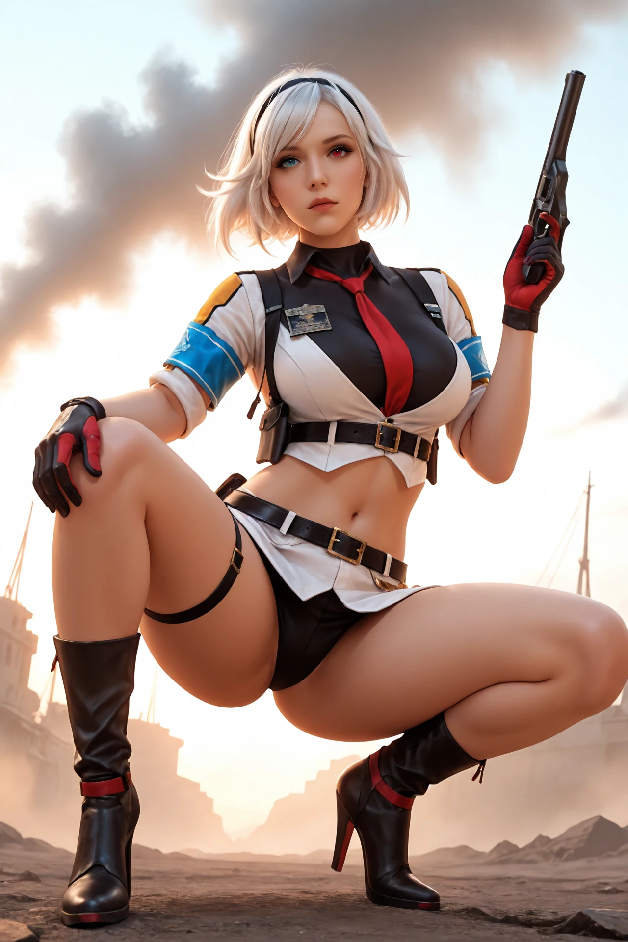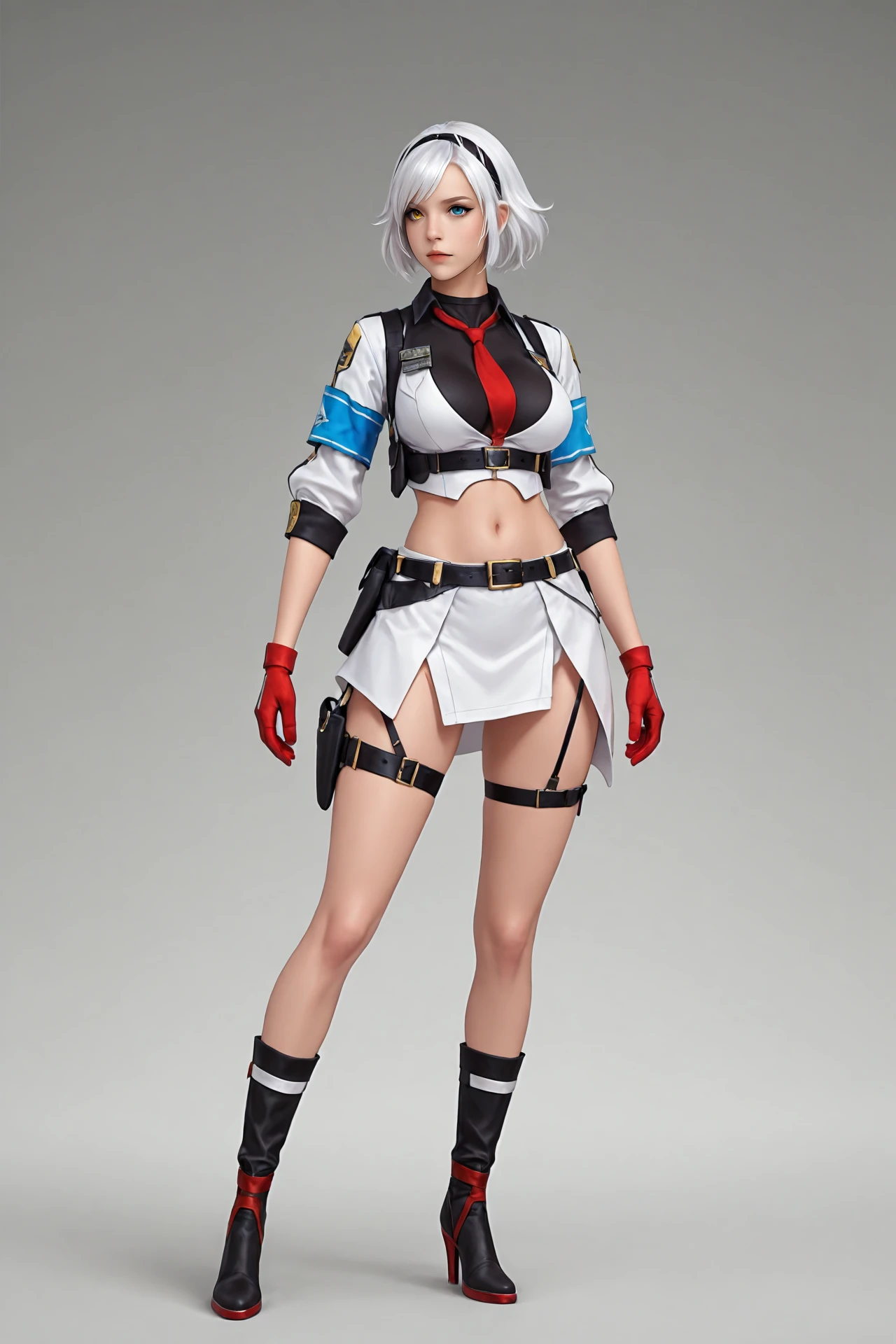 white_hair,short_hair,hairband,heterochromia, large_breasts,navel,midriff,necktie,covered_collarbone, uniform,skirt,belt_buckle,armband,gloves,holster,belt,thigh_strap, ankle_boots,high_heels,