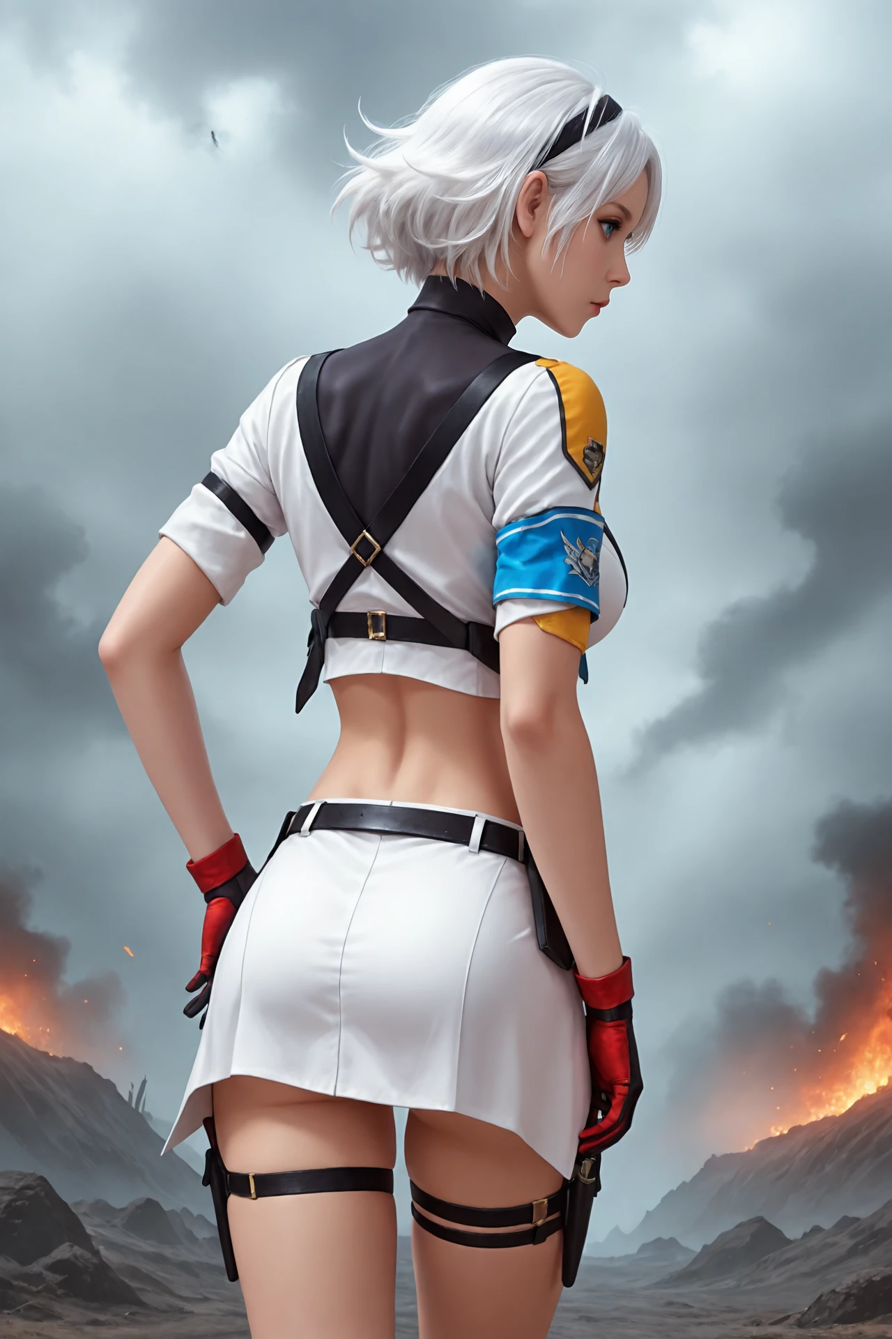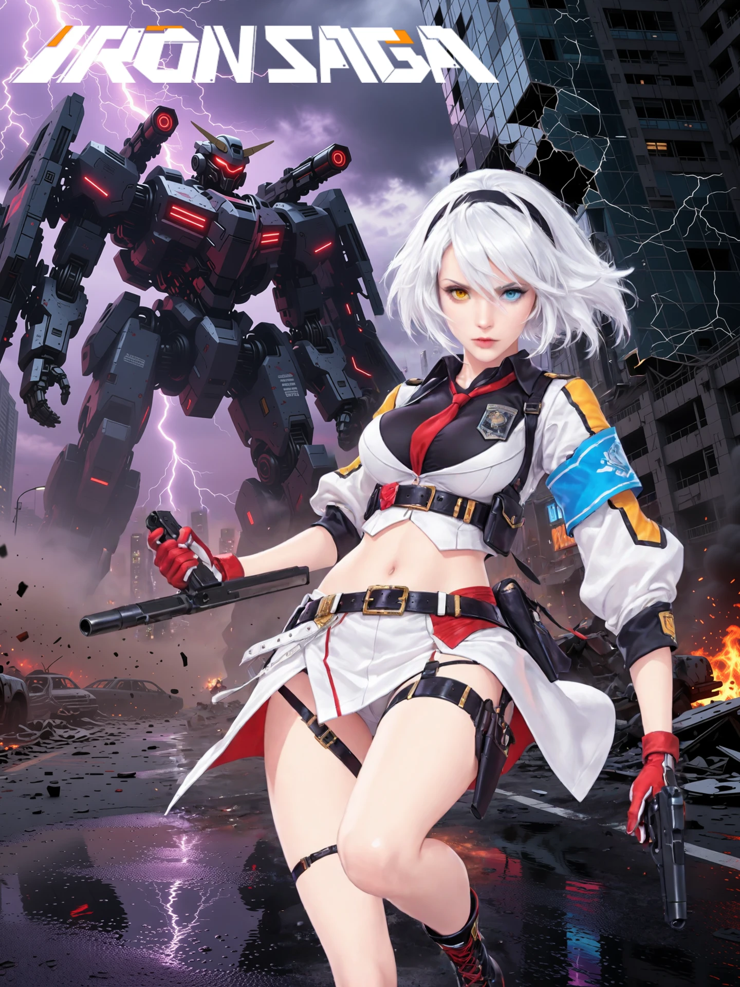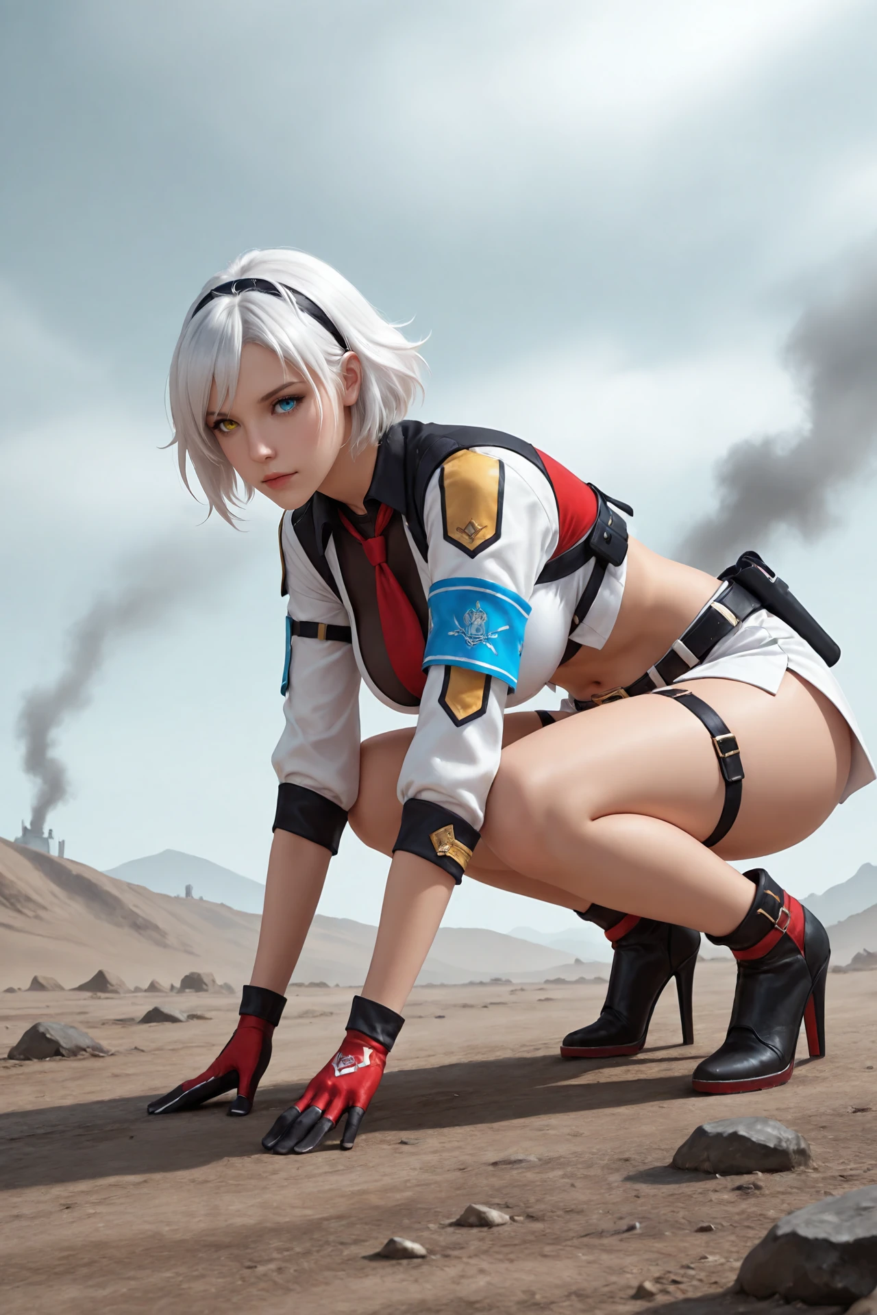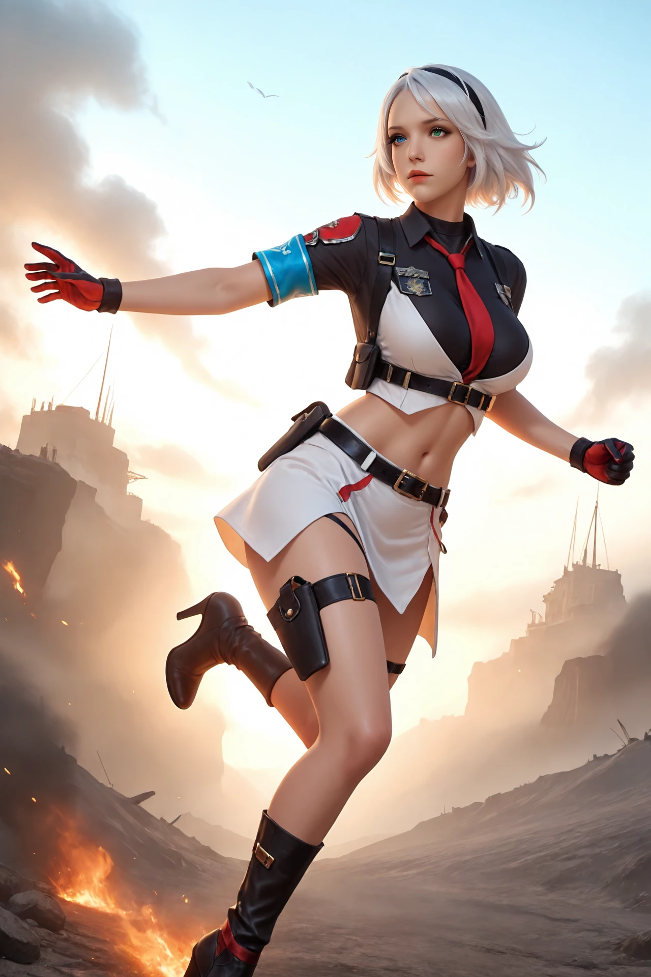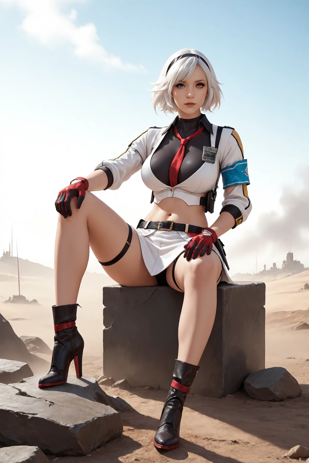 white_hair,short_hair,hairband,heterochromia, large_breasts,navel,midriff,necktie,covered_collarbone, uniform,skirt,belt_buckle,armband,gloves,holster,belt,thigh_strap, ankle_boots,high_heels,