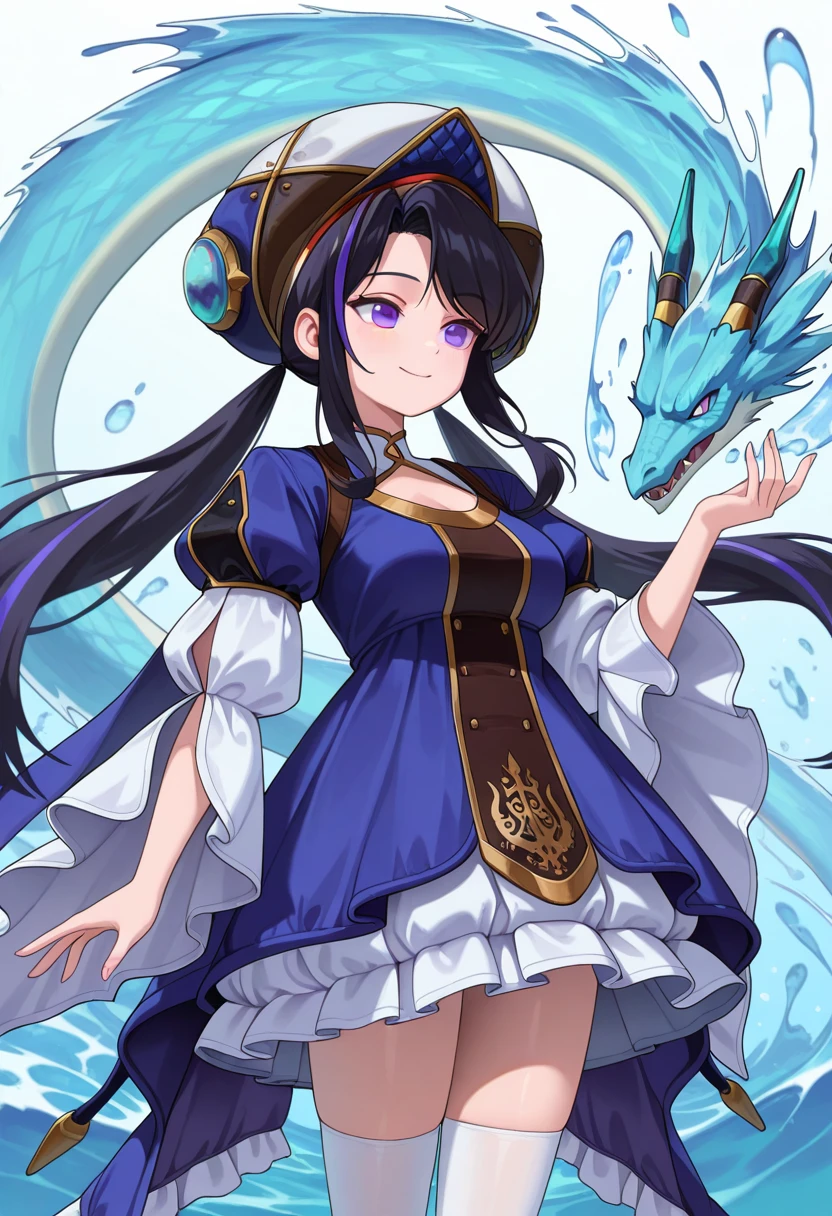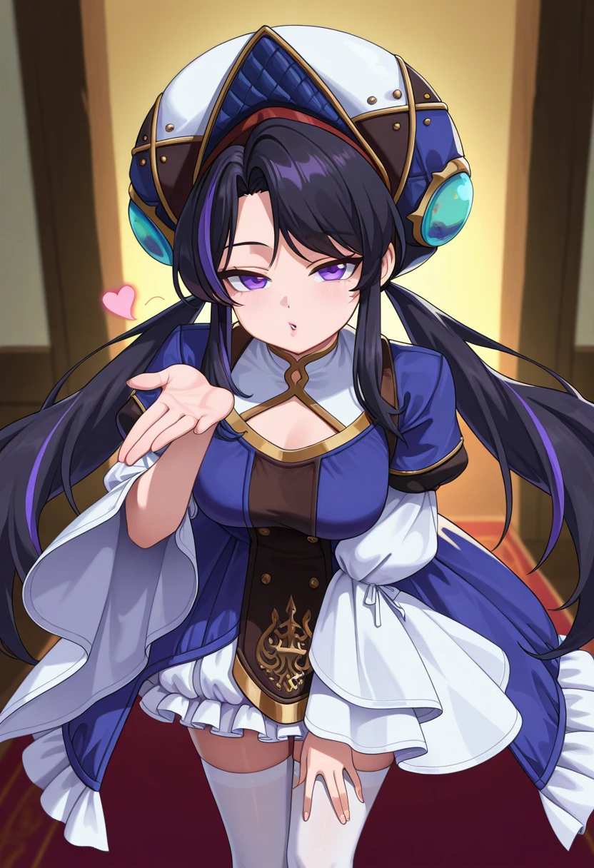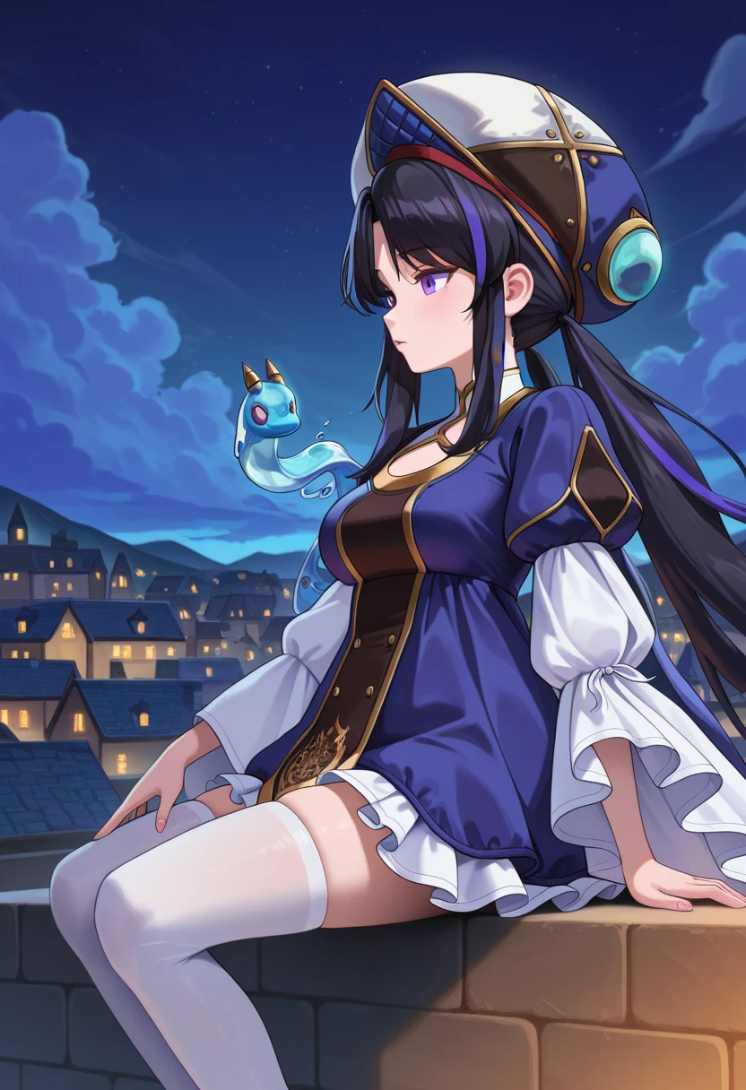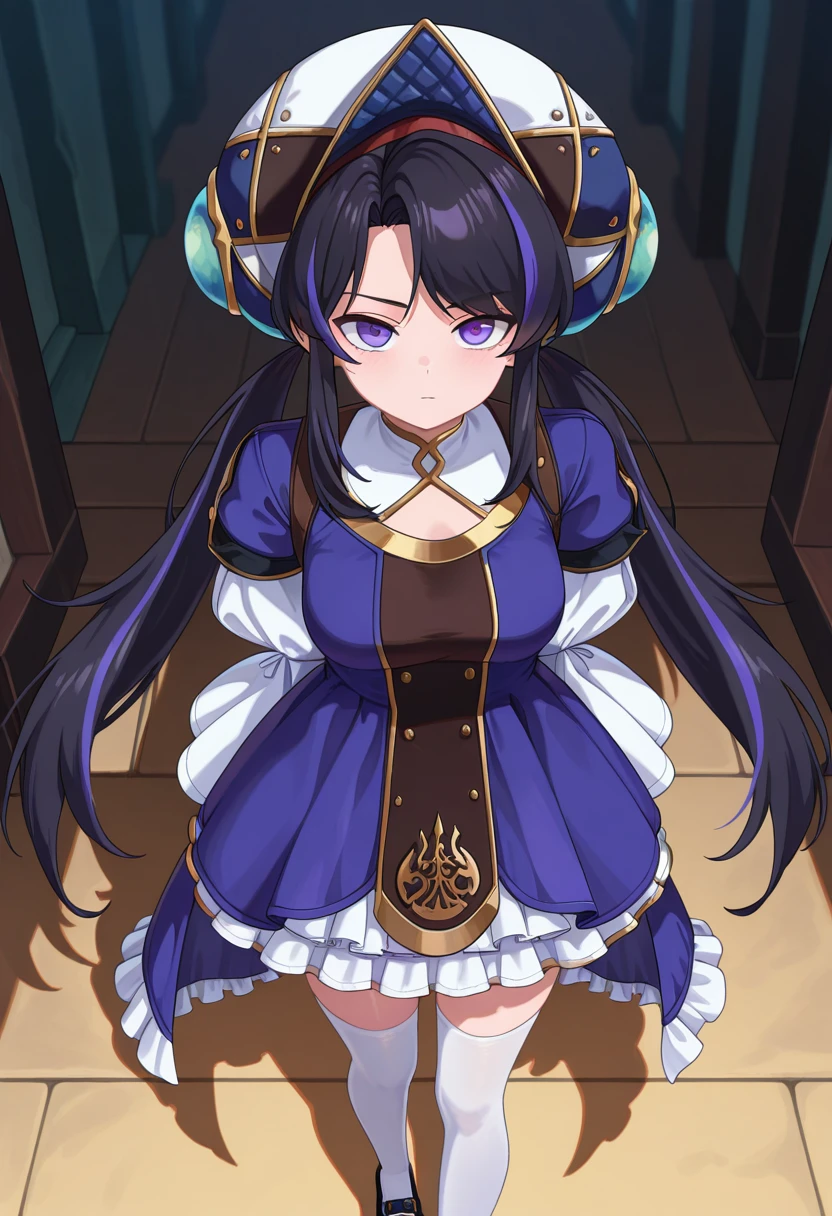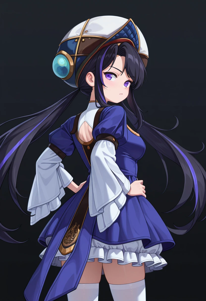 dnf_Erlich, 1girl, solo, black hair, long hair, streaked hair, twintails, purple eyes, , hat, dress, frills, long sleeves, wide sleeves, puffy sleeves, white thighhighs, shoes, black footwear