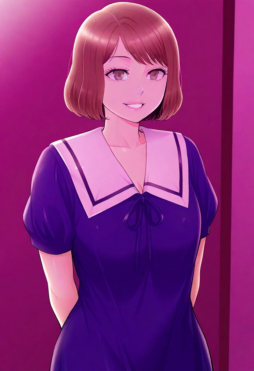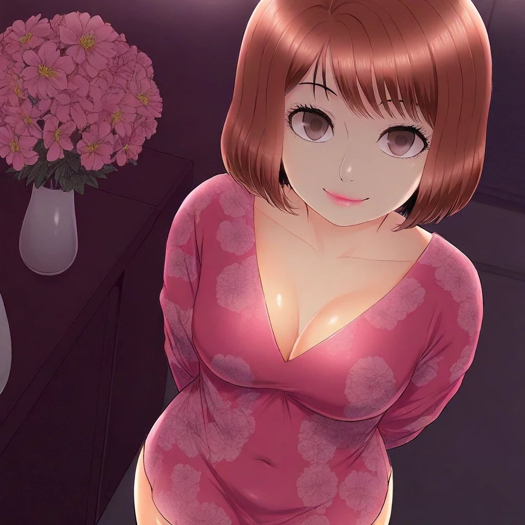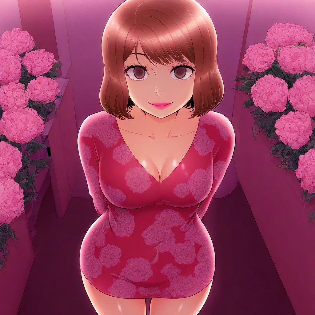 2. ((beautiful long-sleeves v-neck magenta dress with pink flower print, cleavage, ))