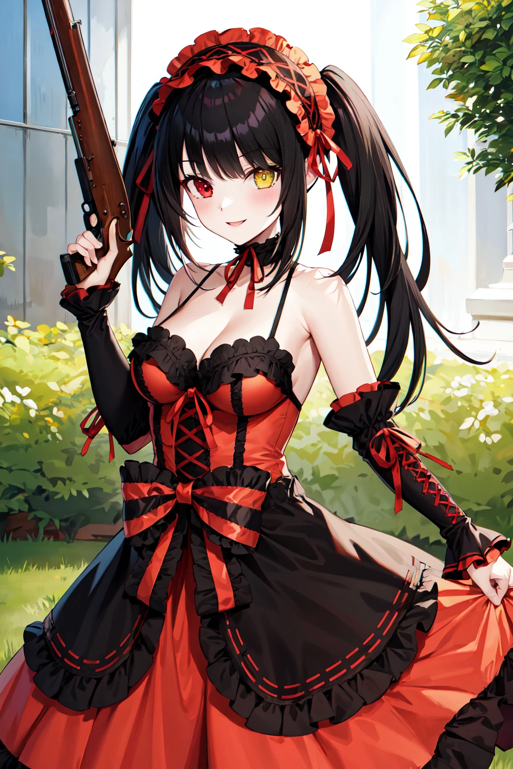 outfit1aakurumi, long hair, twintails, hairband, heterochromia, medium breasts, cleavage, black choker, red ribbon, bare shoulders, gothic, red dress, red bow, detached sleeves