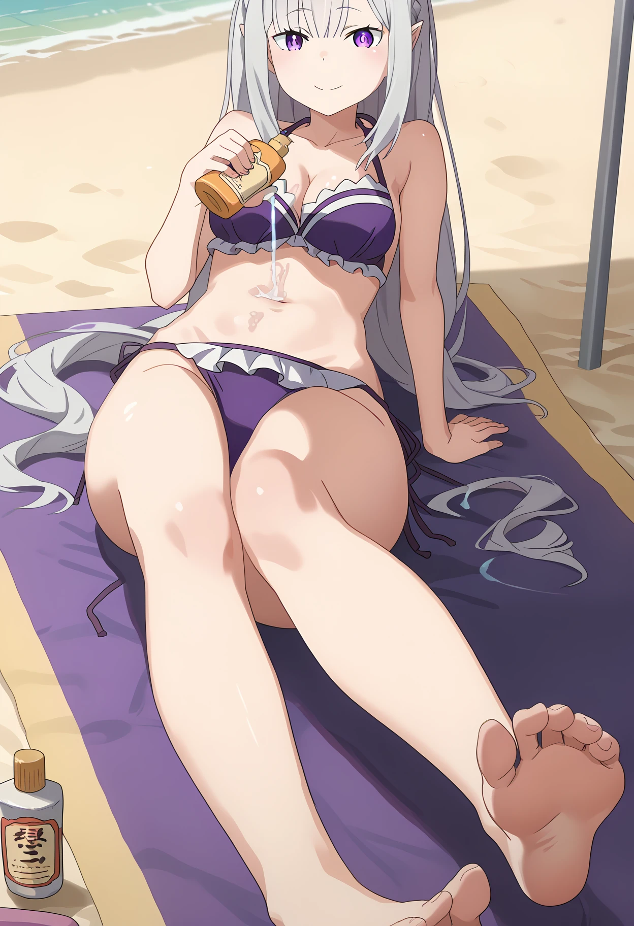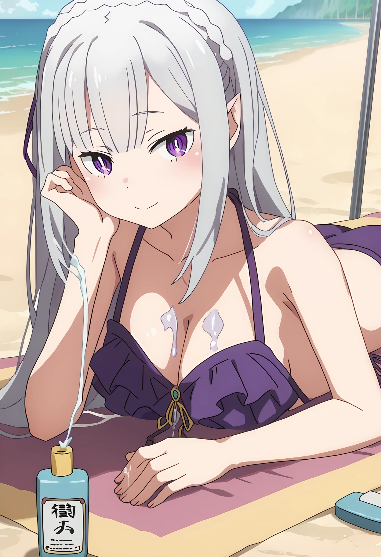 shiapplyother, applying sunscreen, sunscreen, multiple girls, on stomach, drooling, sand, holding bottle, beach towel,