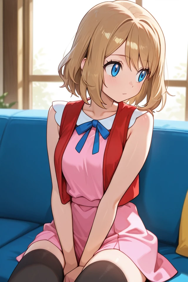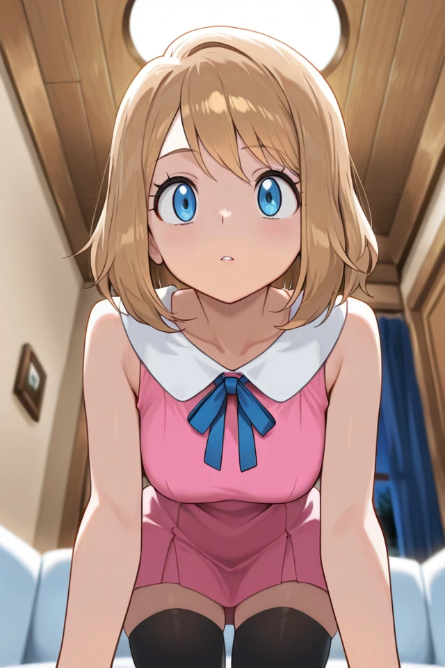 serena, 1girl, blonde hair, medium hair, black thighhighs, blue eyes, blue ribbon, neck ribbon, pink dress, eyelashes, sleeveless, bangs, collarbone, ???? arms