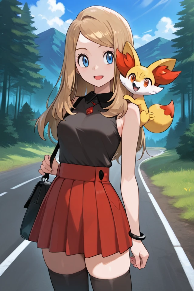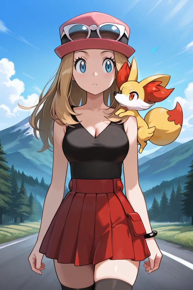 serena, 1girl, sleeveless shirt, bracelet, jewelry, blonde hair, long hair, bag, red skirt, eyewear on headwear, pleated skirt, sunglasses, eyelashes, black thighhighs, hat, skirt