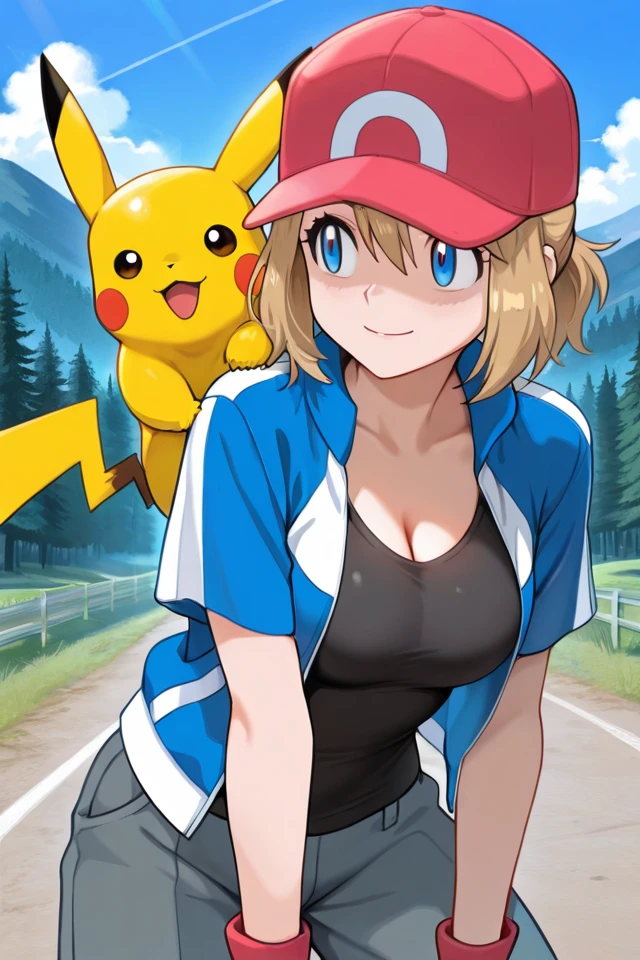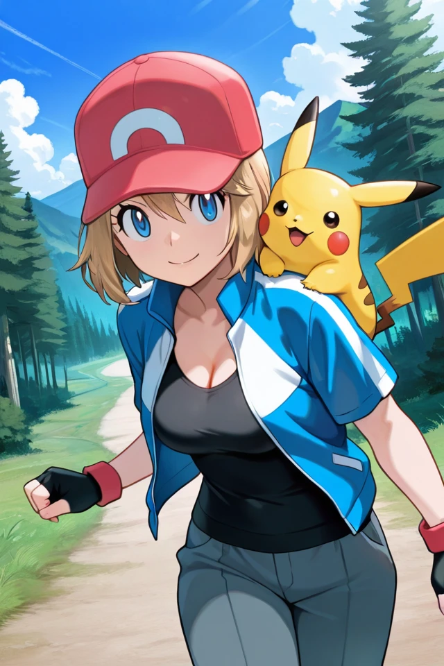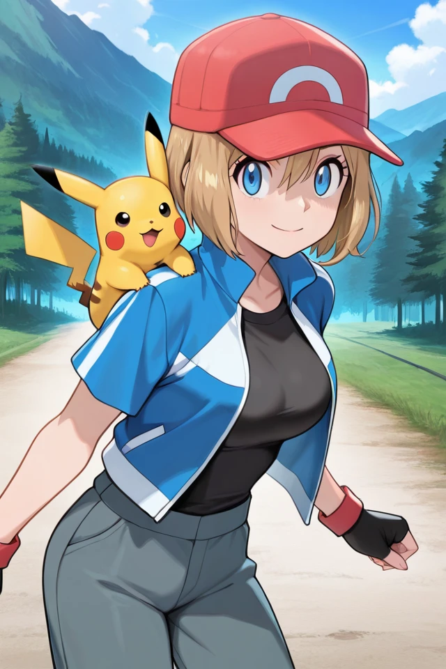 serena, 1girl, solo, cosplay, fingerless gloves, blue eyes, blonde hair, medium hair, baseball cap, smile, grey pants, black shirt, short sleeves, hair between eyes, blue jacket, eyelashes