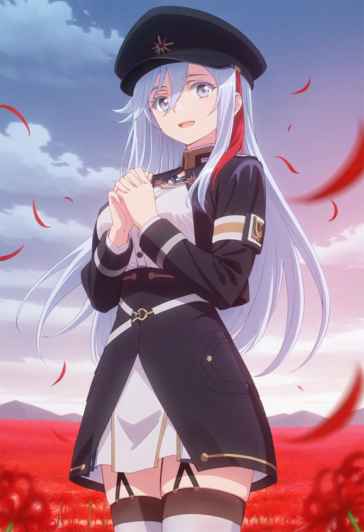 black military uniform, garter straps, thighhighs, high-waist skirt, shirt, long sleeves, cropped jacket, zettai ryouiki, peaked cap, red hair, multicolored hair, streaked hair,
