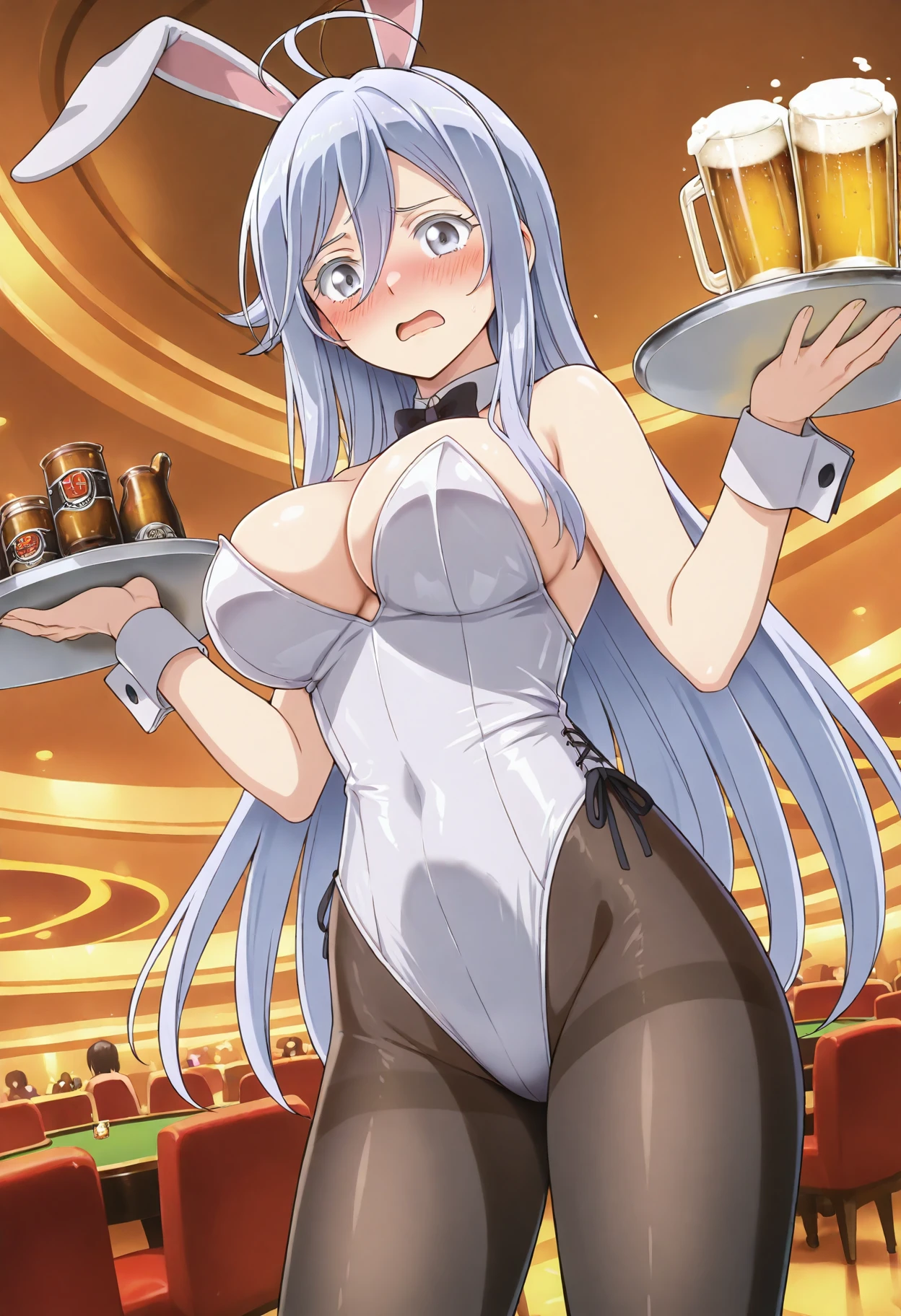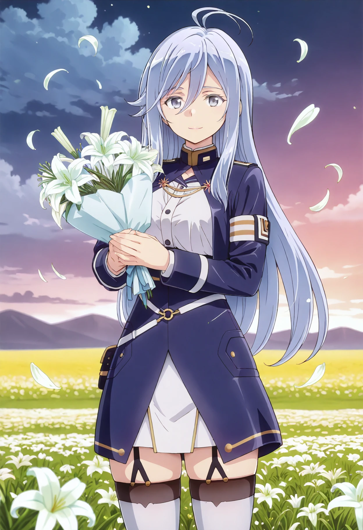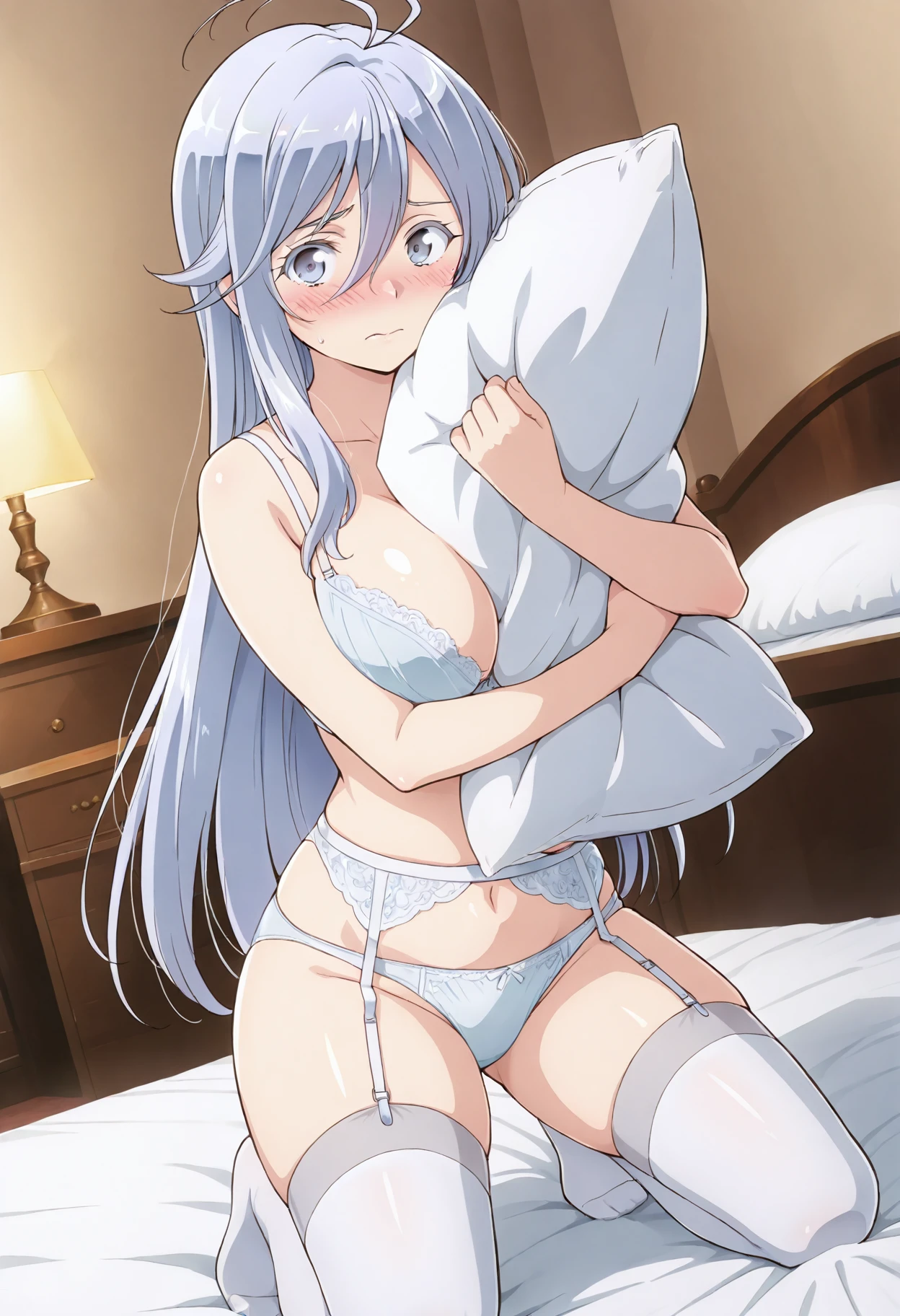 vladilenamilize, very long hair, grey eyes, hair between eyes, bangs, grey hair, ahoge, white eyelashes, large breasts,
