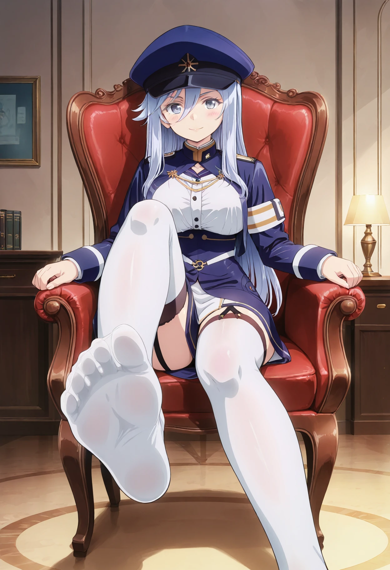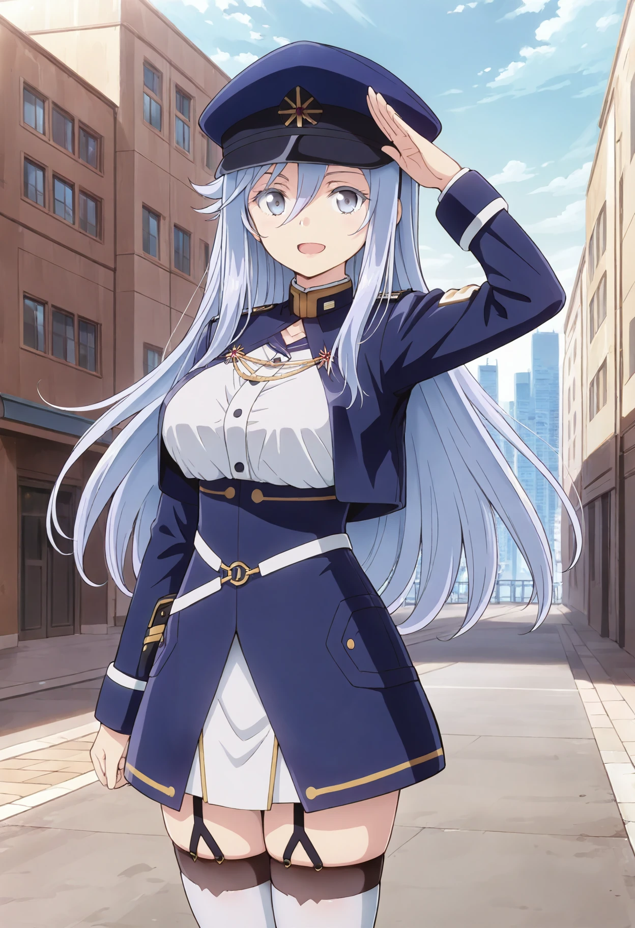 blue military uniform, garter straps, white thighhighs, high-waist skirt, shirt, long sleeves, cropped jacket, zettai ryouiki, peaked cap,For jacket removed, swap to these / ジャケットを脱いだら、これらをに変更します/ 脫外套換這組: