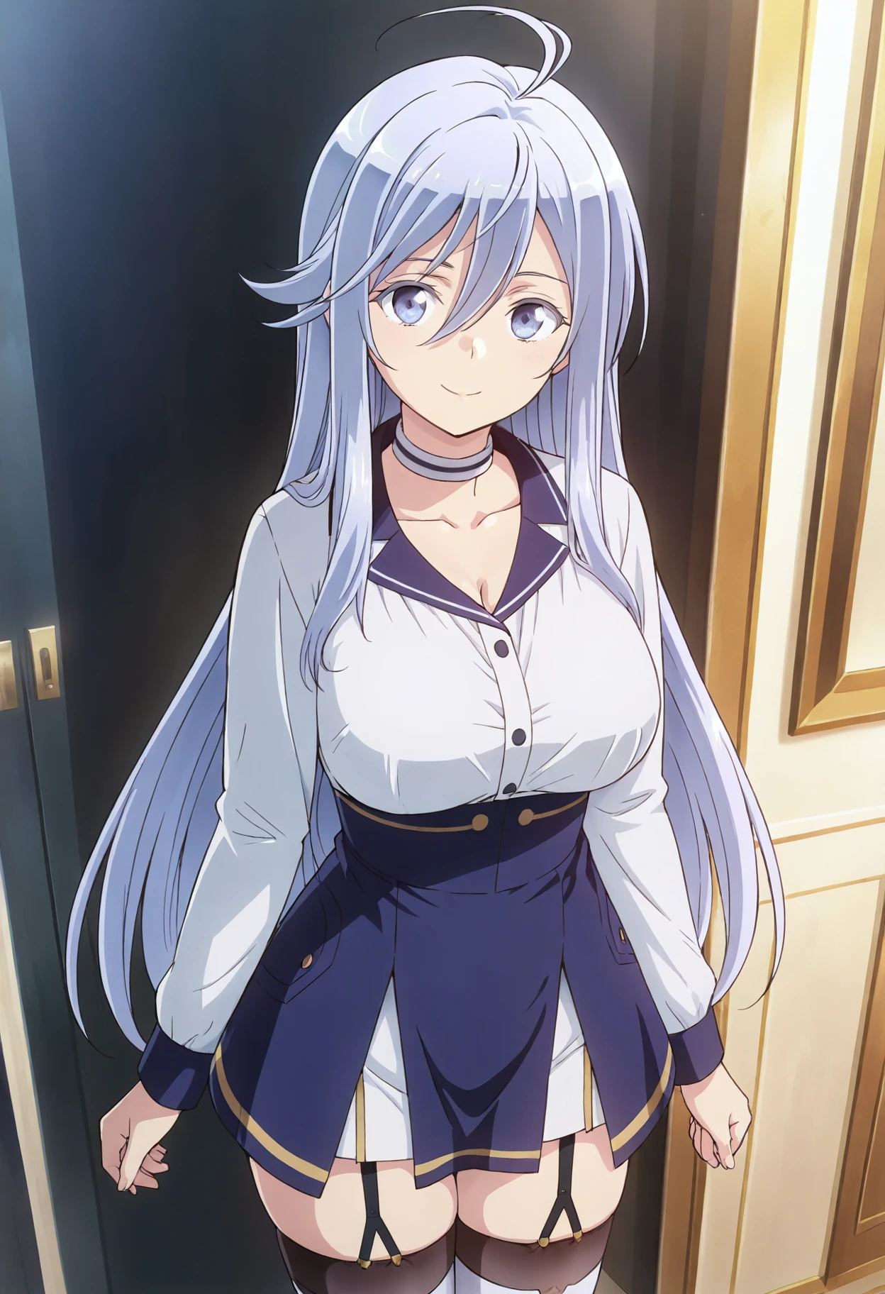 choker, long sleeves, blue skirt, high-waist skirt, garter straps, thighhighs, blouse,