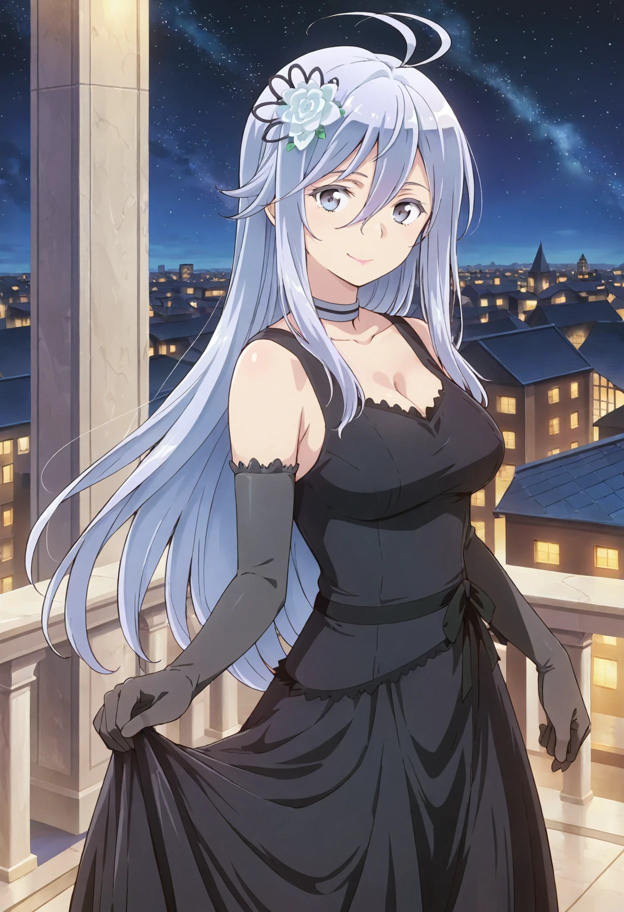 low-cut dress, black dress, head flower, choker, cleavage, hair ornament, elbow gloves, lipstick,