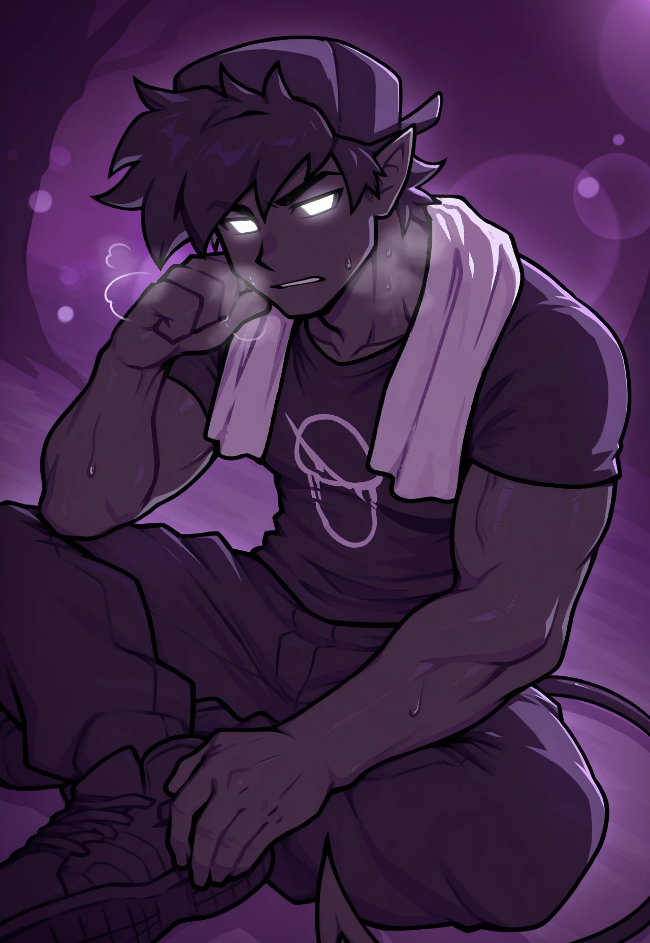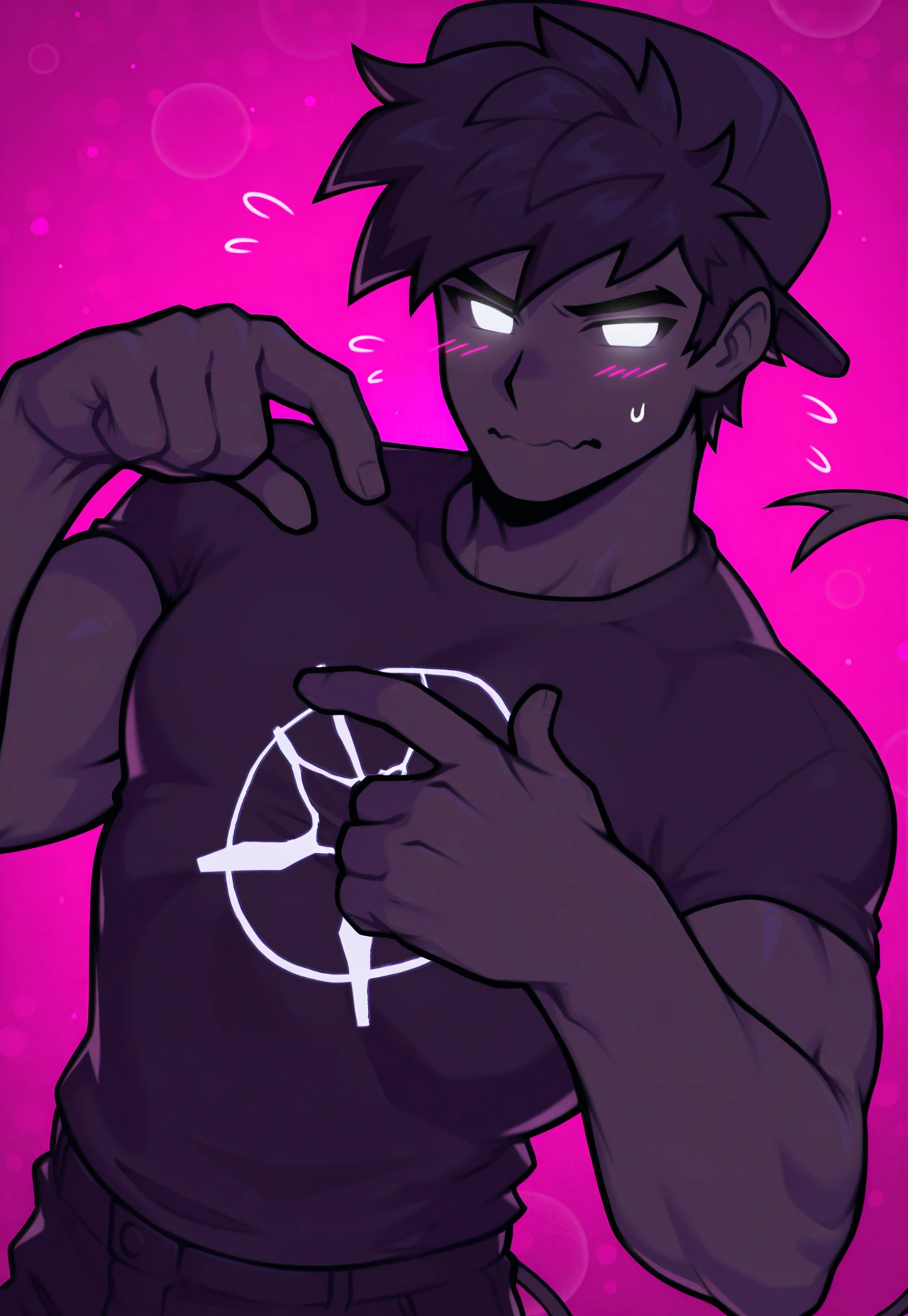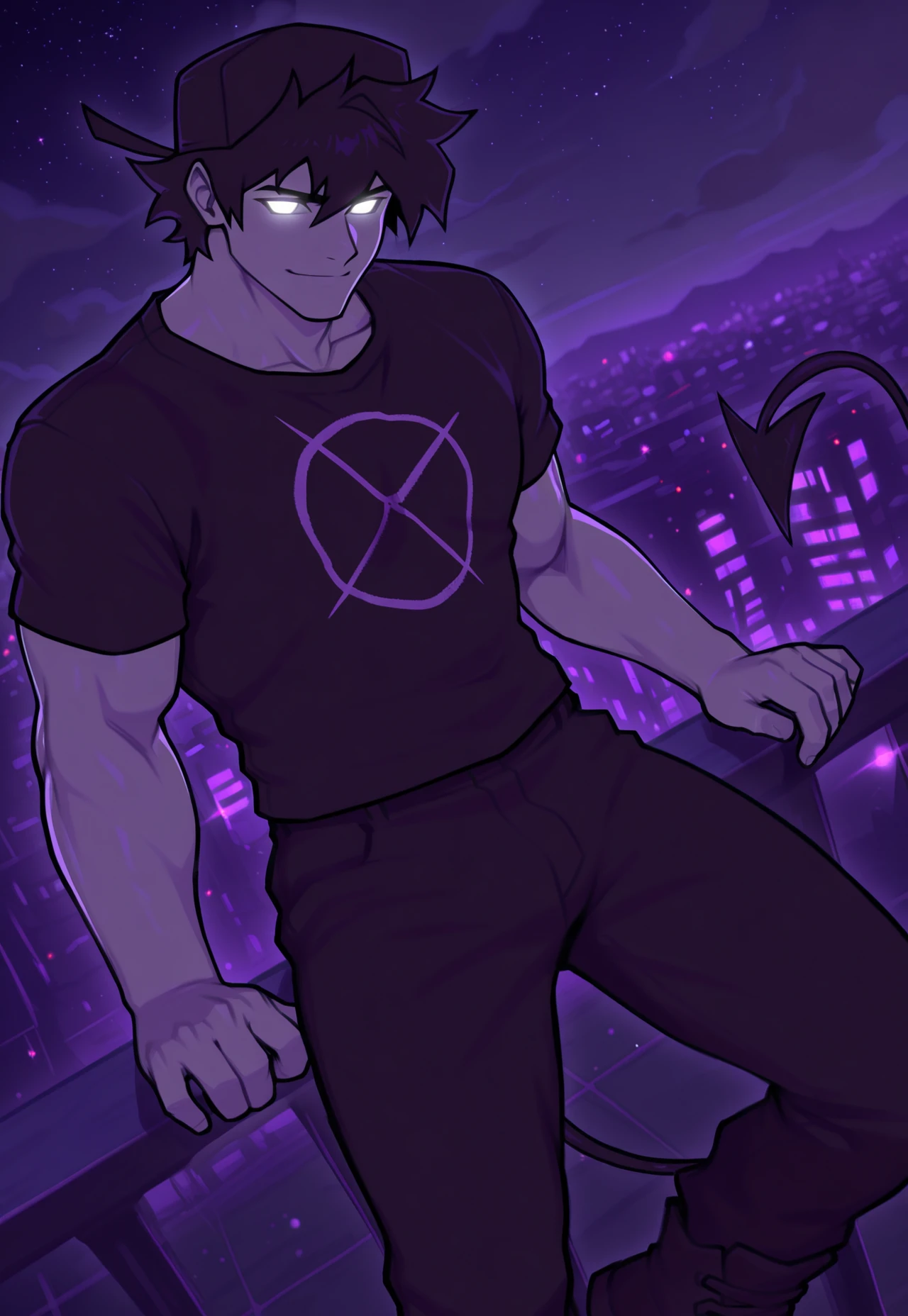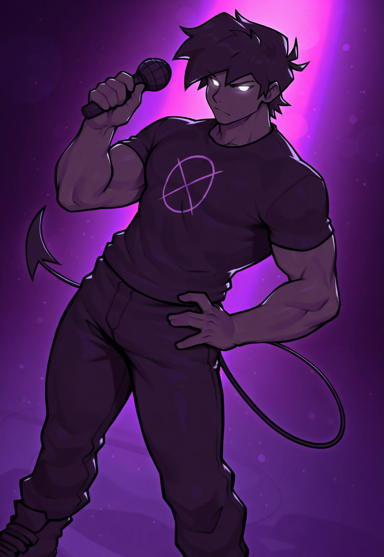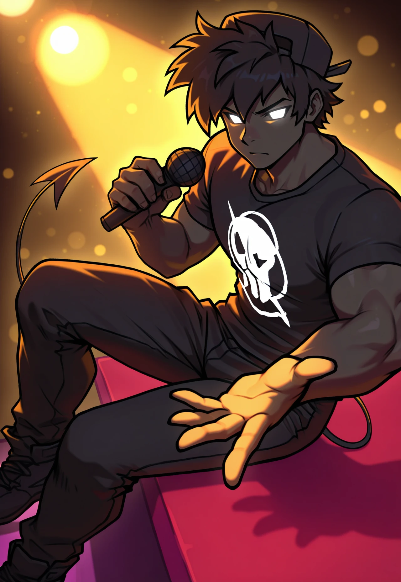 soul boyfriend, fnf, friday night funkin, black cap, male, (white glowing eyes:1.2), black hair, demon tail, (no sclera:1.4), (5 fingers:1.4),