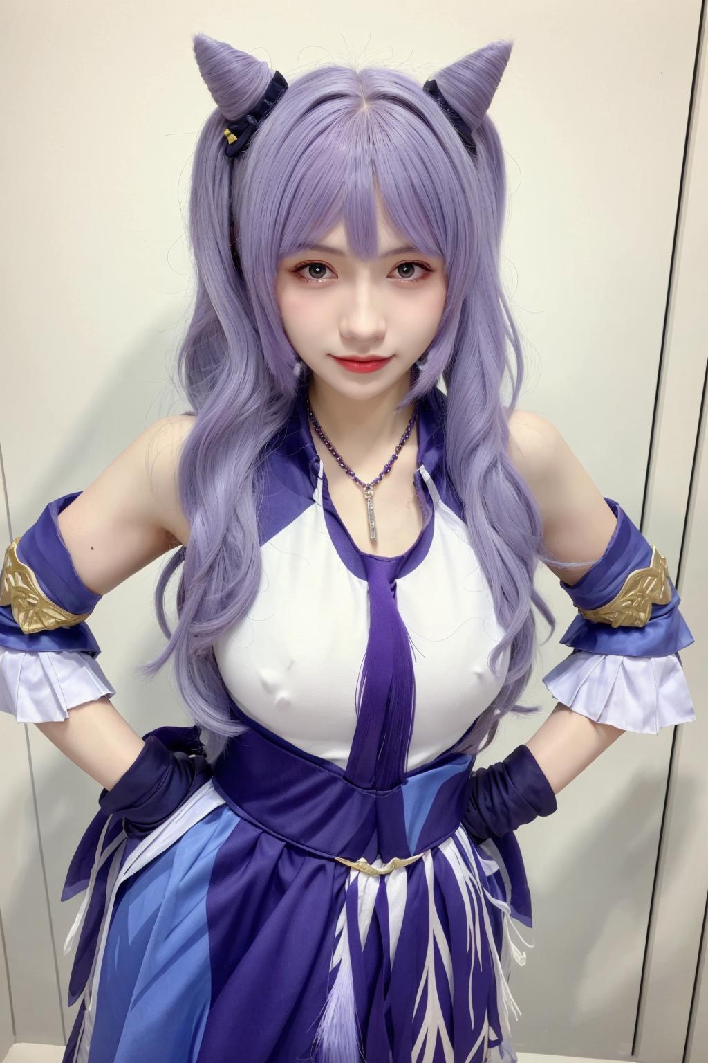 keqing \(genshin impact\), 1girl, solo, cone hair bun, looking at viewer, purple hair, twintails, purple eyes, long hair,hair bun, necklace, jewelry,bangs,hair ornament, lips, double bun,