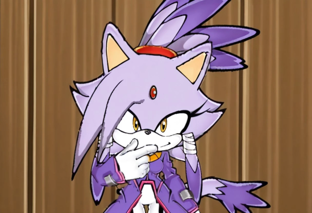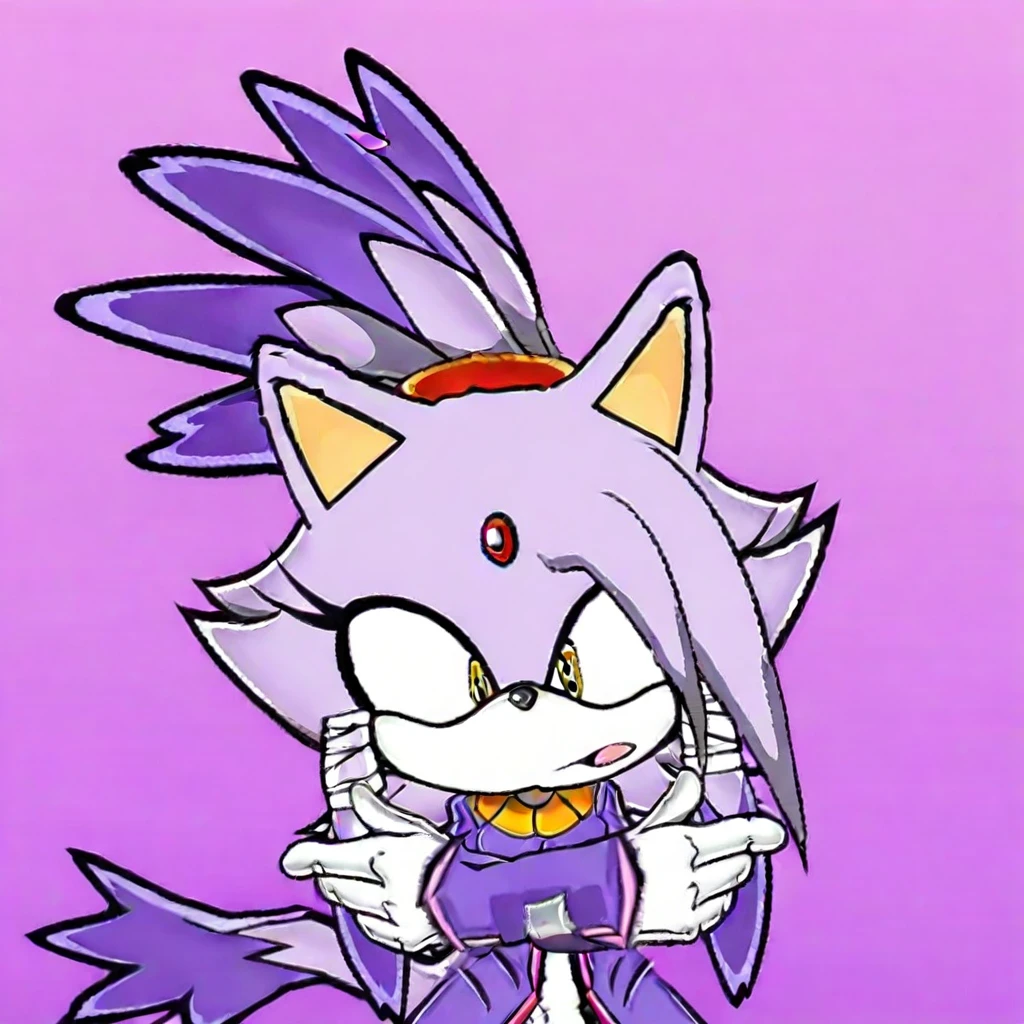 ssxublaze, blaze the cat, 1girl, solo, sonic (series), female focus, furry, furry female, feline, purple hair, gloves, tail, white gloves, cat ears, forehead jewel, topknot, cat girl, cat tail, coat, yellow eyes, purple fur, two-tone fur