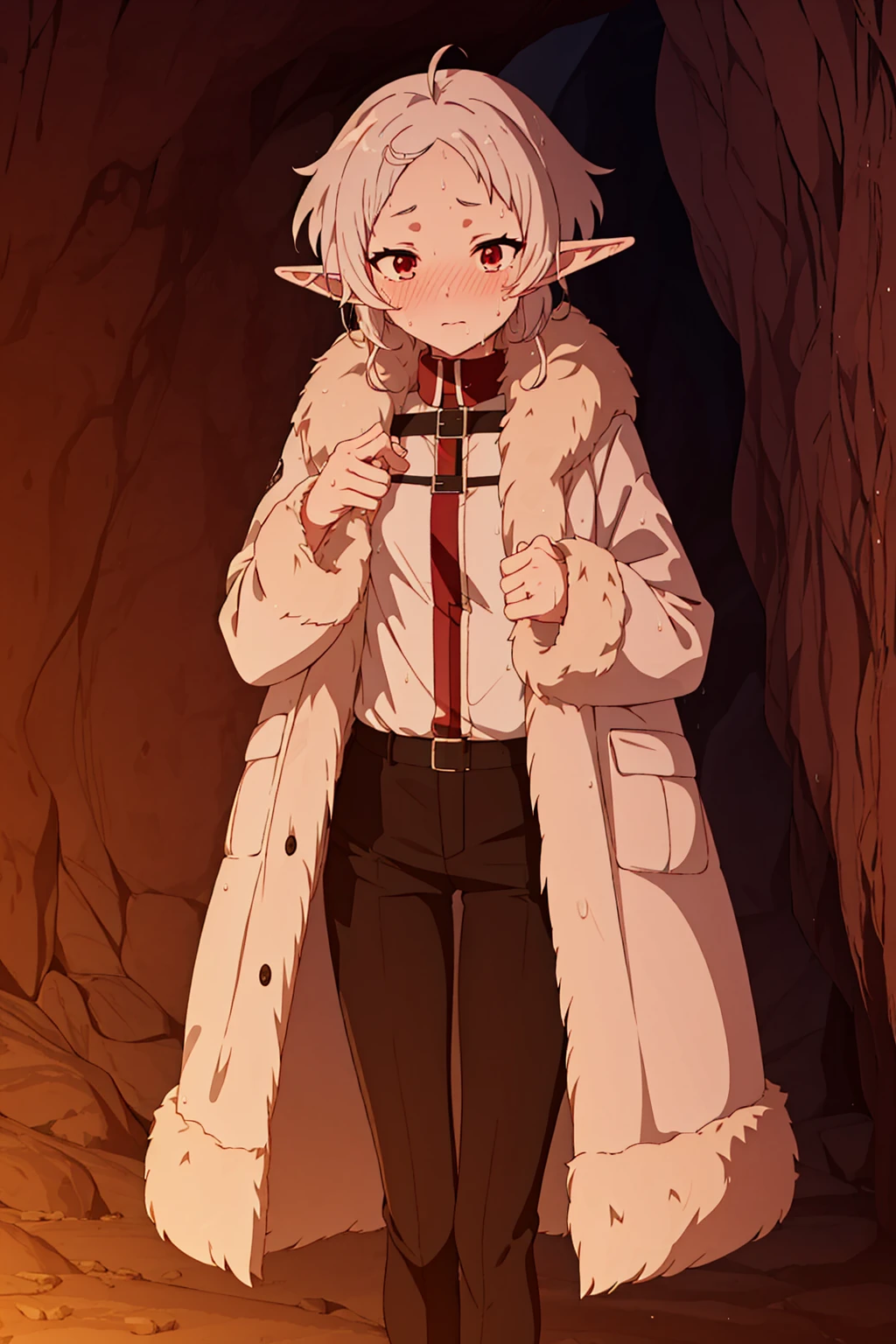 诱拐鲁迪去涩涩前的冬衣:sylphiettedy,pointy ears,short hair,white hair,forehead,ahoge,red eyes,||fur trim brown long coat,red choker,white red shirt under coat,white red shirt under coat,black pants,brown boots,
