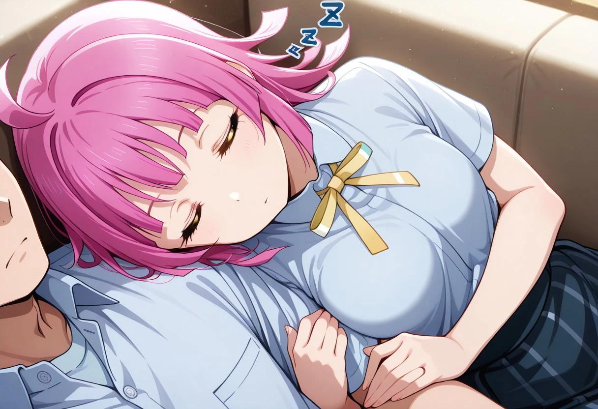 bangs, yellow eyes, pink hair, ahoge, blunt bangs, medium hair, blunt ends, mature female
