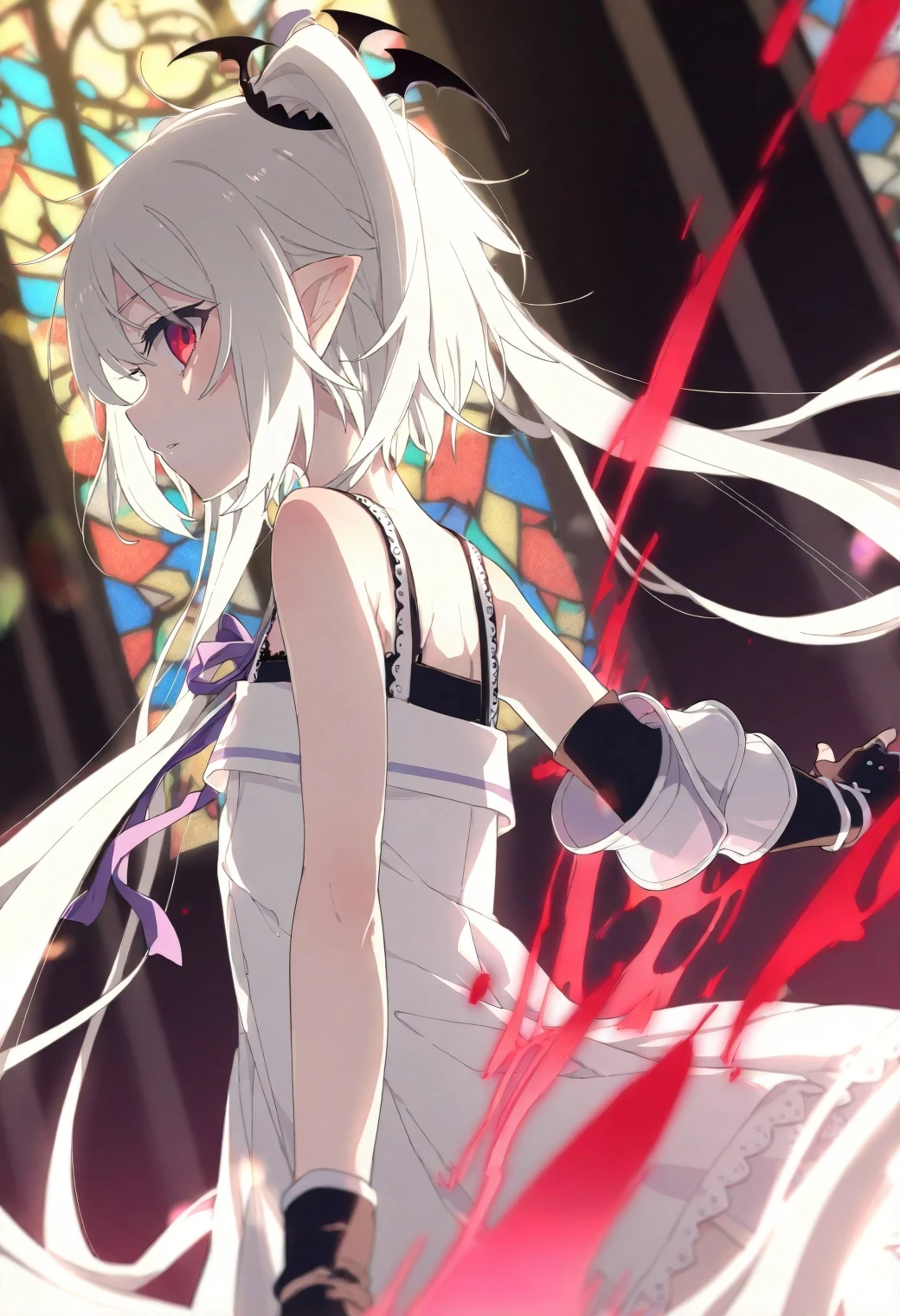 vampire, white hair, red eyes, pointy ears, twintails, very long hair,
