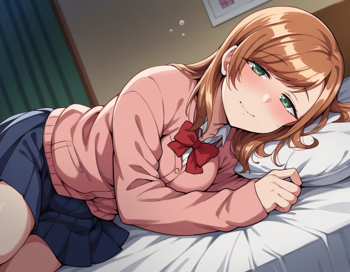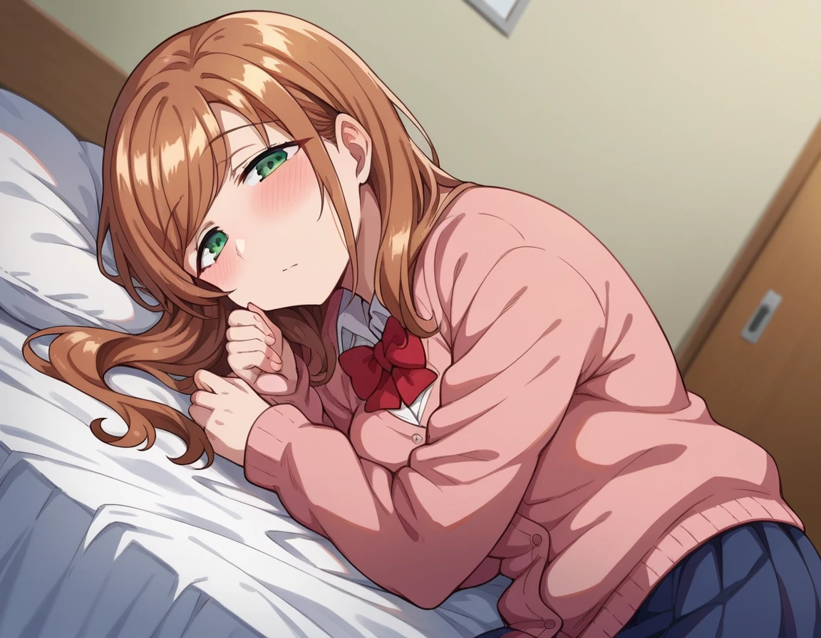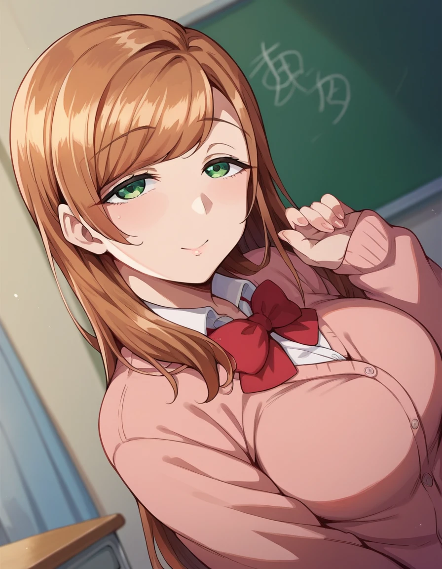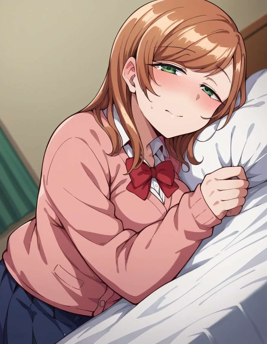 long sleeves, bow, school uniform, bowtie, red bow, cardigan, pink cardigan,