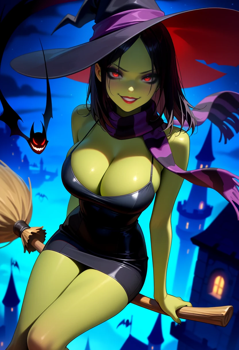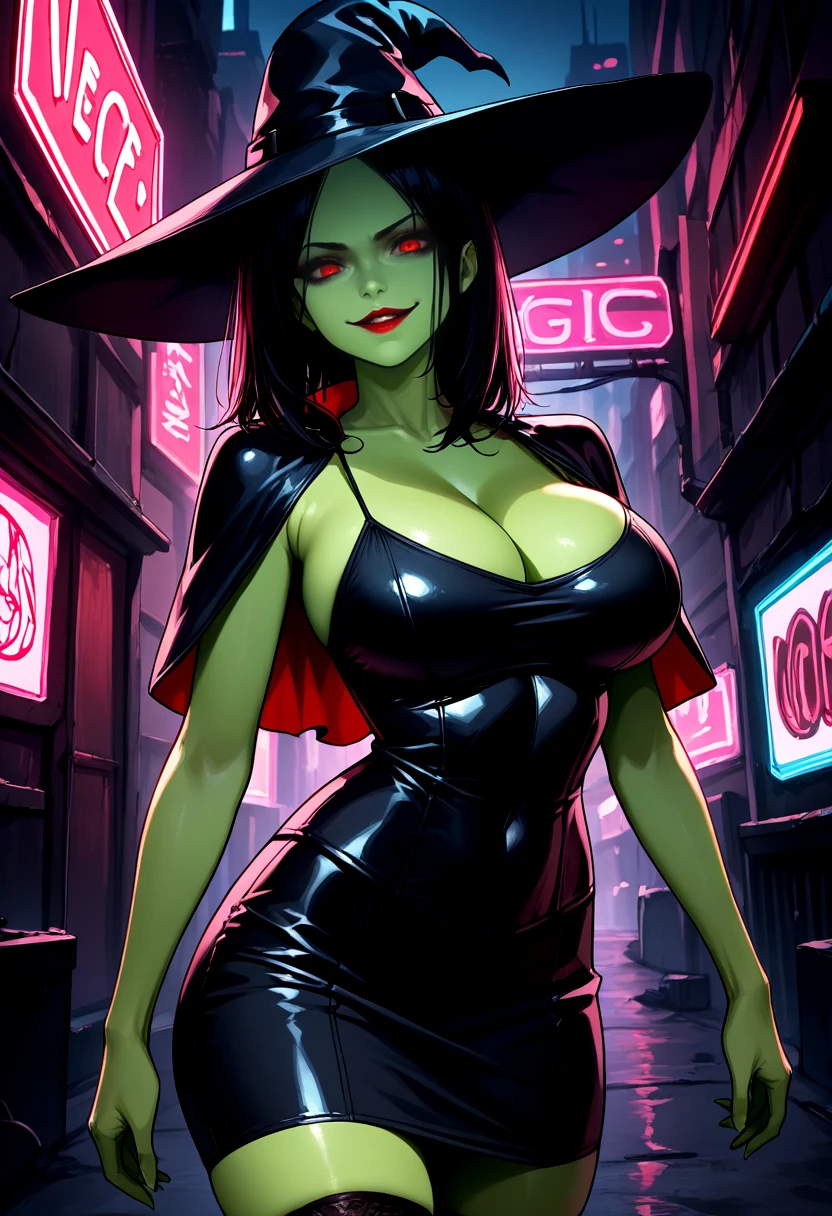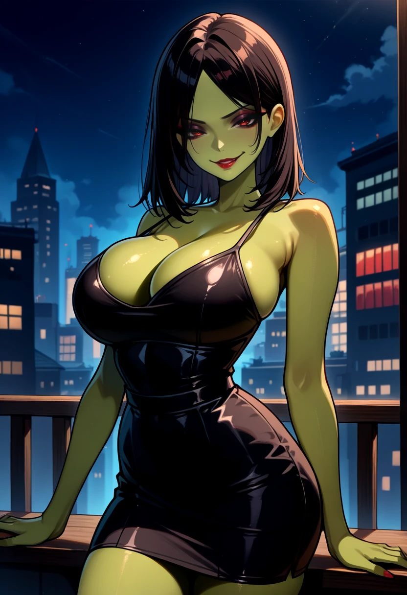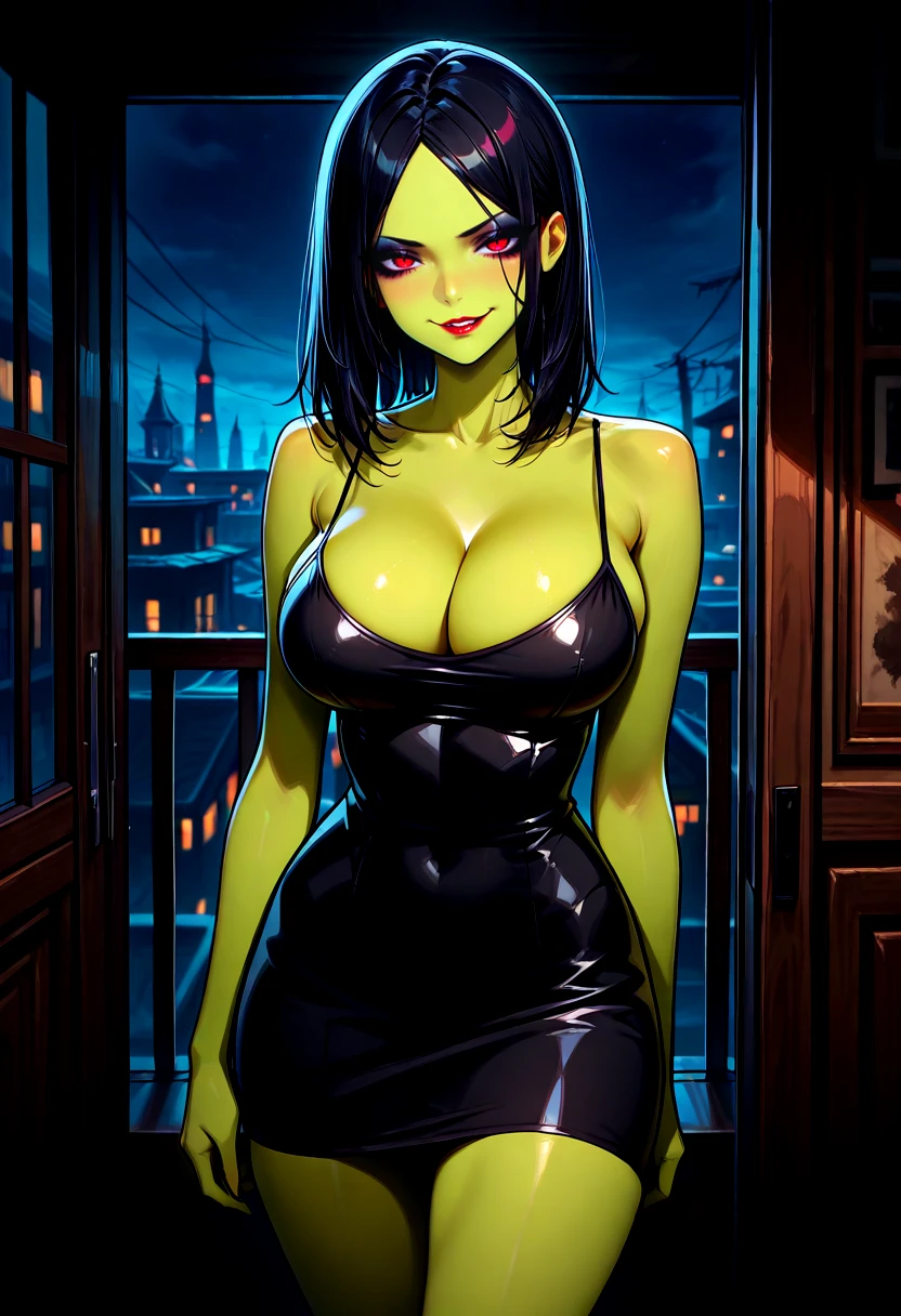 Prompts: GruntyPDXL, black dress, black hair, eyeshadow, green skin, short dress, spaghetti strap, red eyes, red lips, black eyeshadow, cleavage, pencil skirt, skintight, parted bangs, medium hair, straight hair,