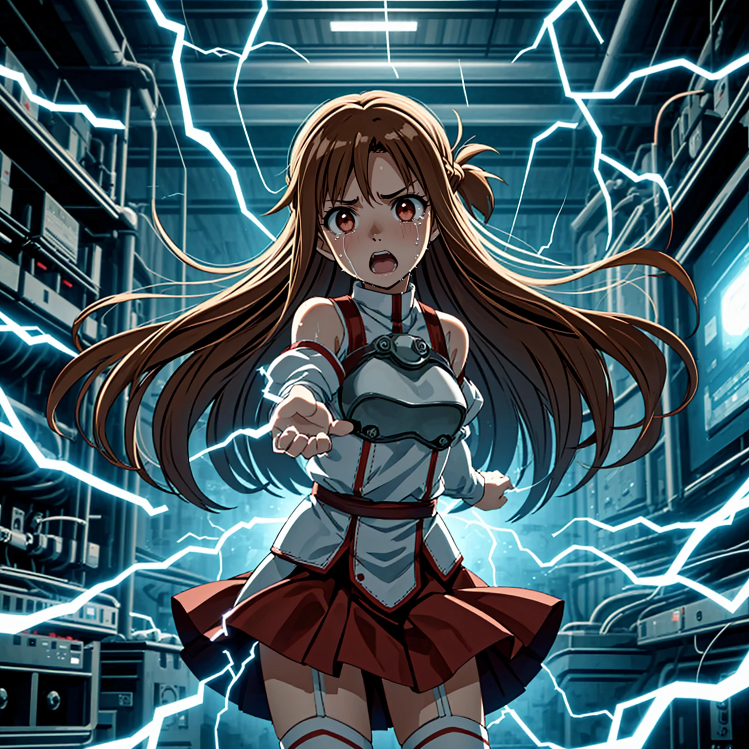 pain,power lines,(((electricity,electric shock,electrokinesis,light background))),electic aura,psychic,plasma,machinery,cable,red monitor,alert,industrial pipe,computer,electric plug,air conditioner,explosion,full body,kneeling,