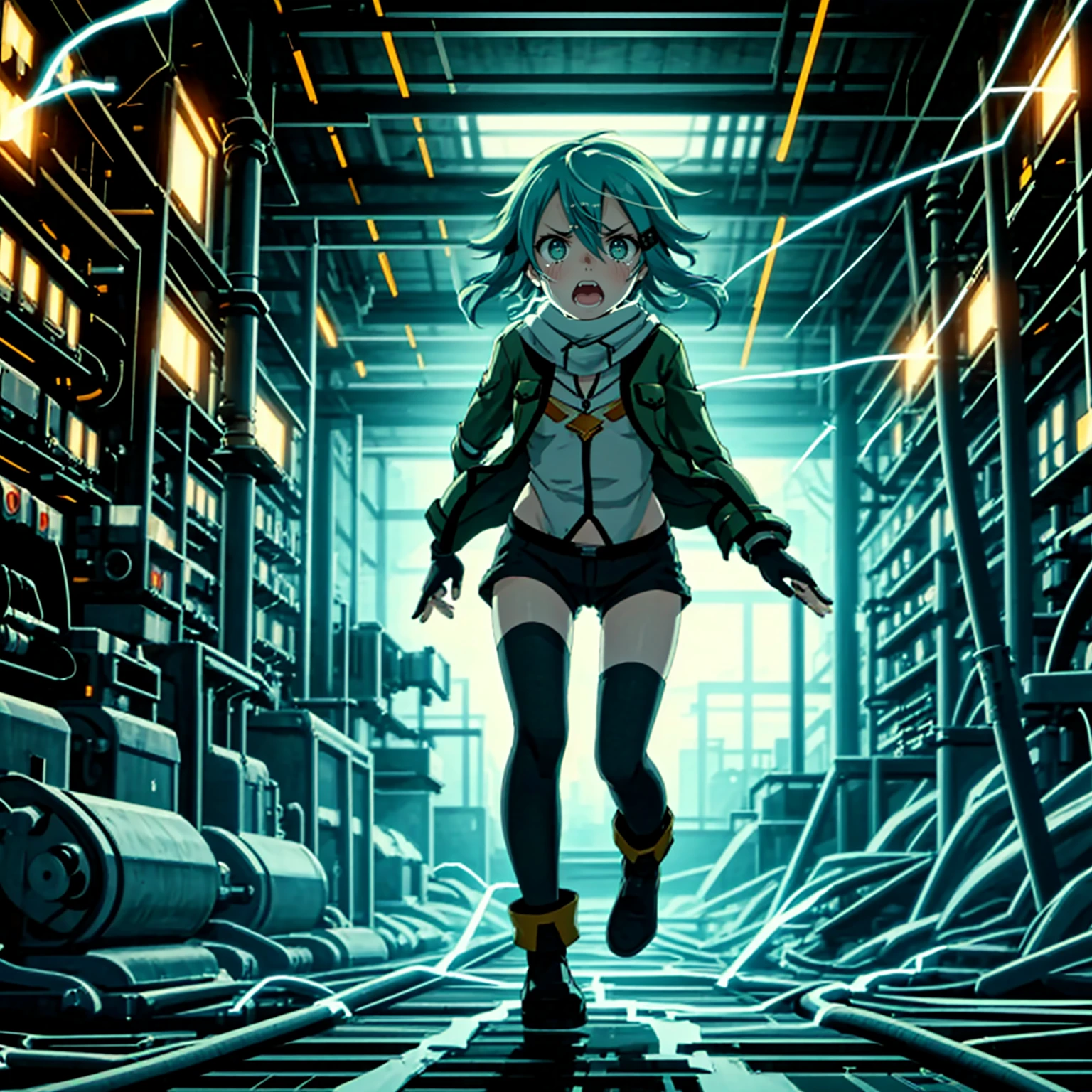 power lines,running,(((electricity))),machinery,cable,monitor,industrial pipe,computer,electric plug,air conditioner,explosion,hallway,full body,