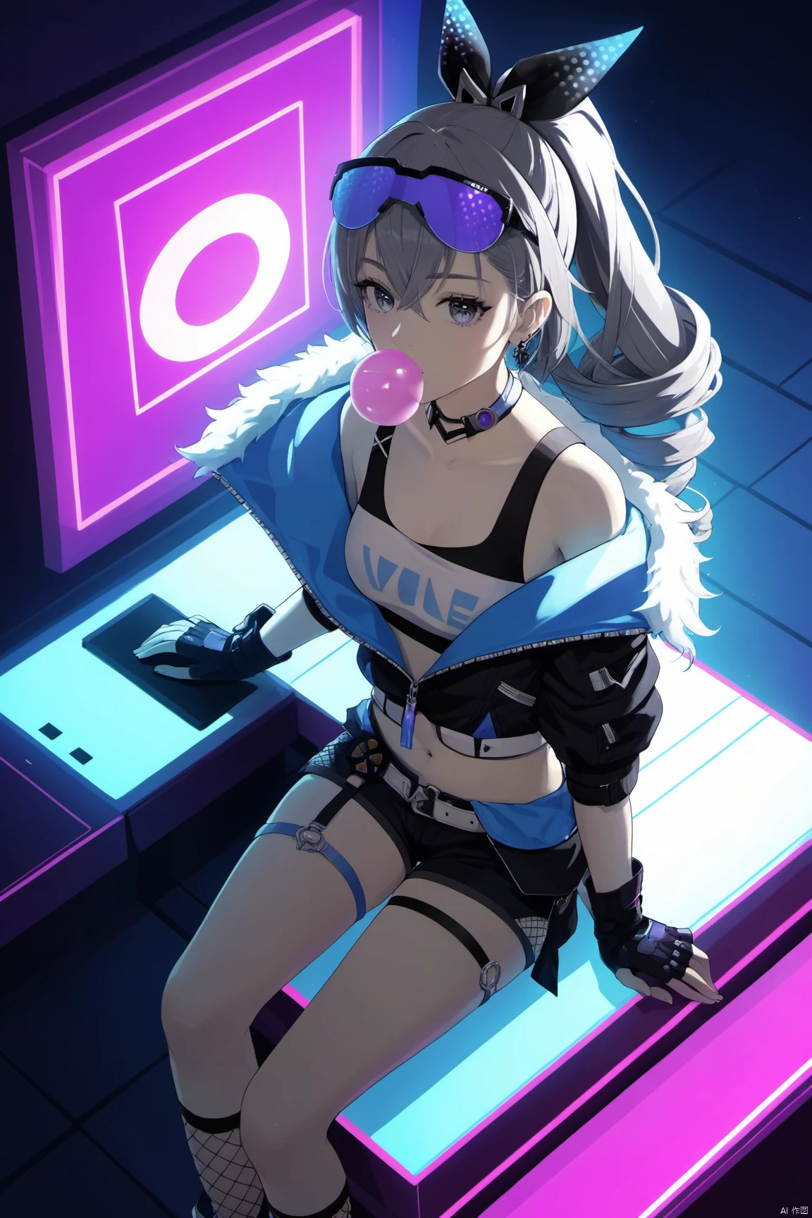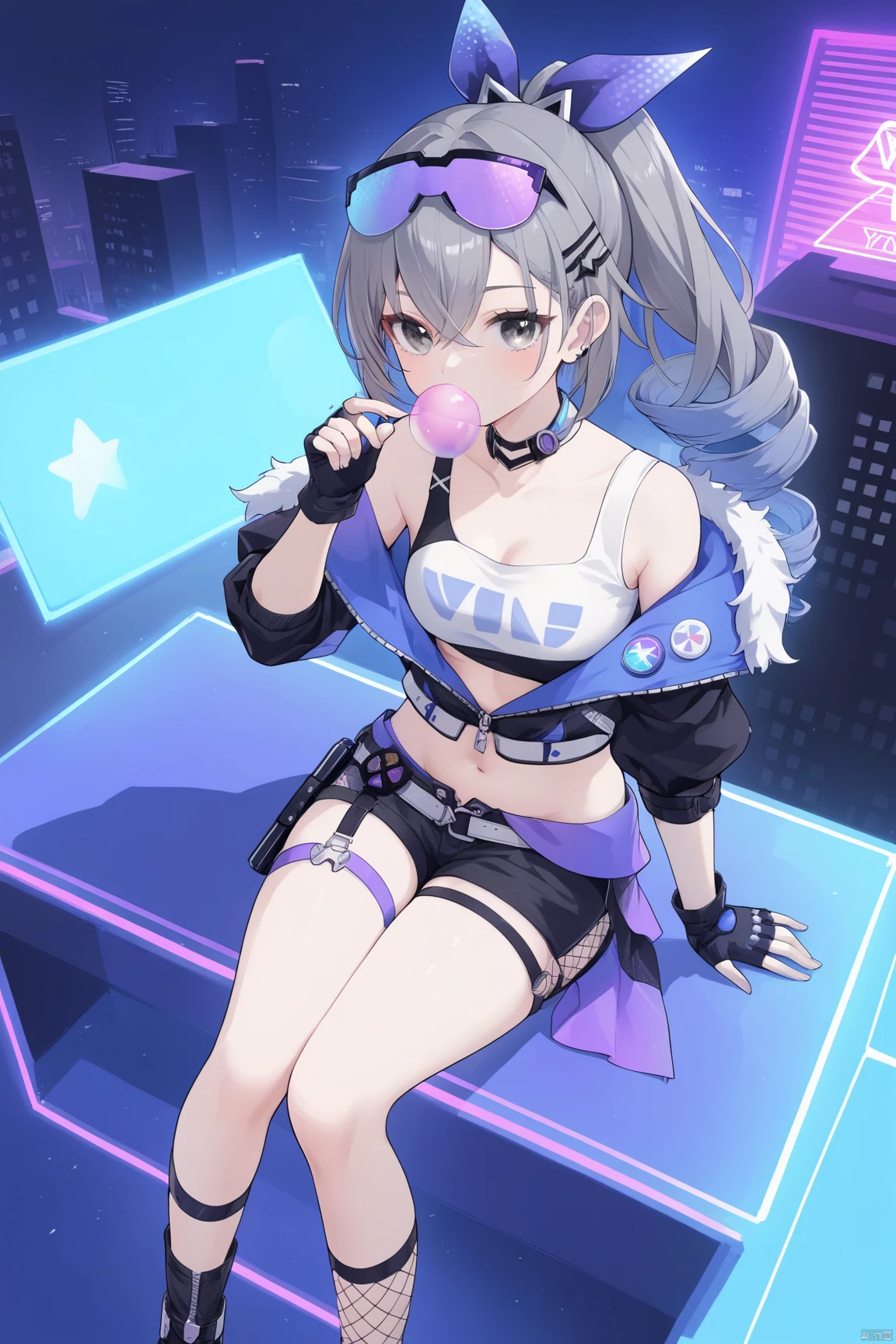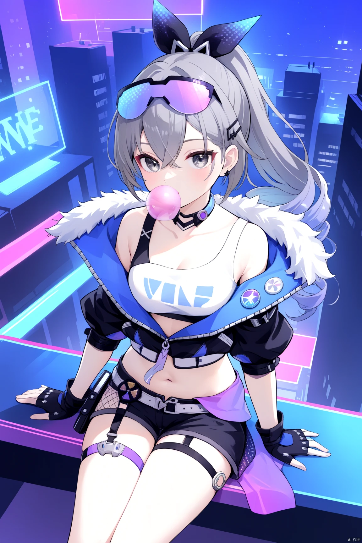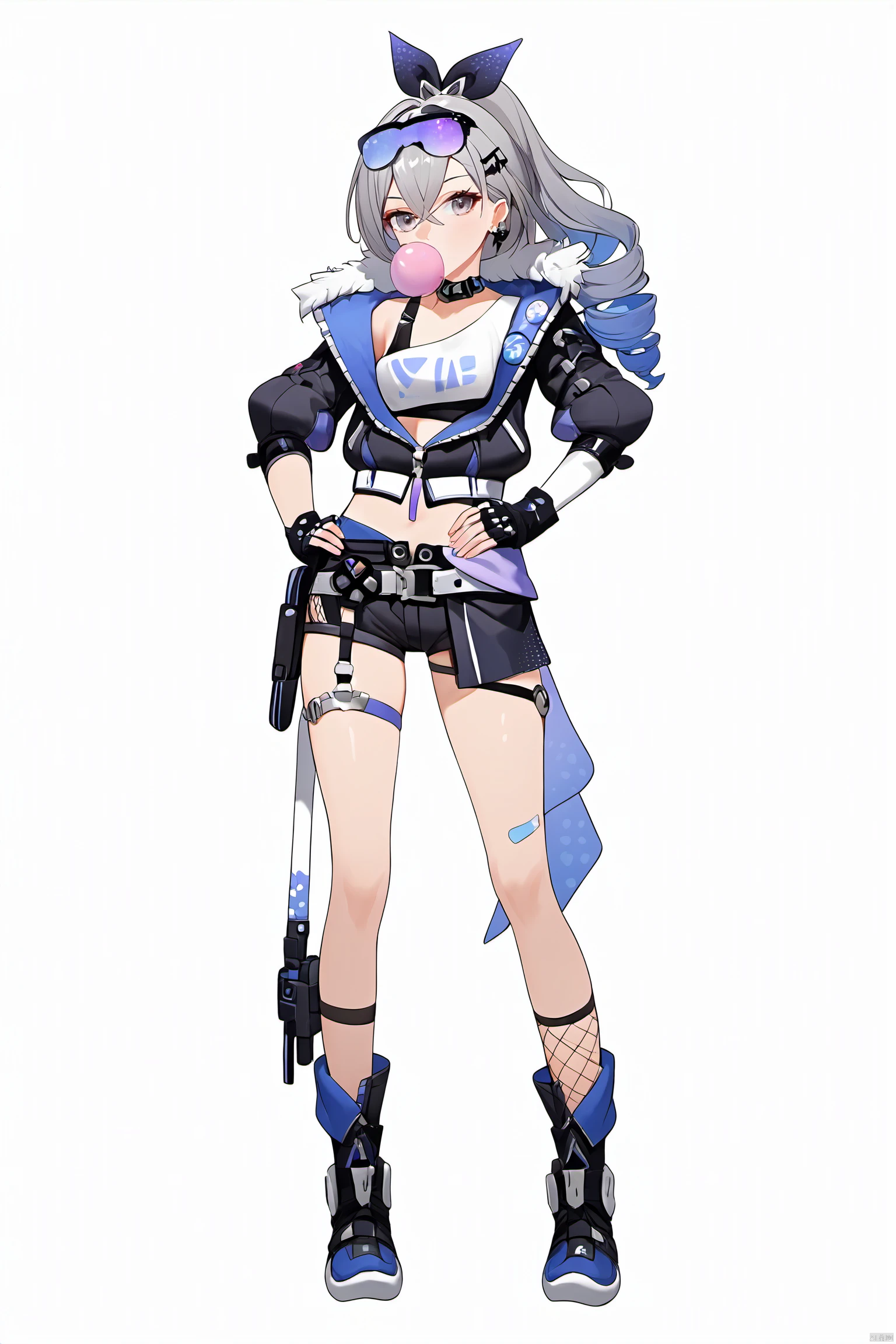 yinlang, bronya zaychik, eyewear on head, grey eyes, jacket, shorts, drill hair, fingerless gloves, navel, grey hair, long hair, mesh socks,bubble blowing, chewing gum,