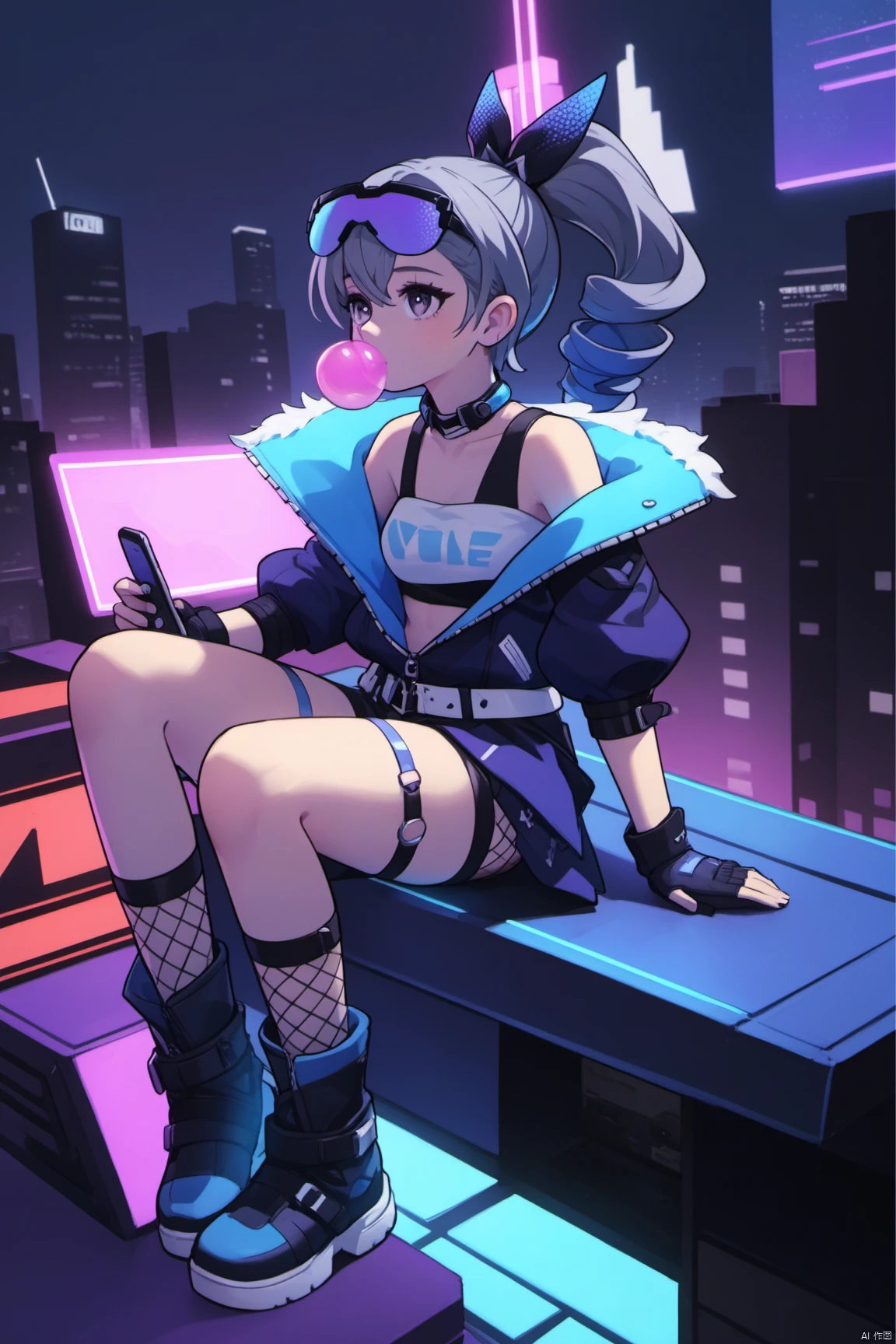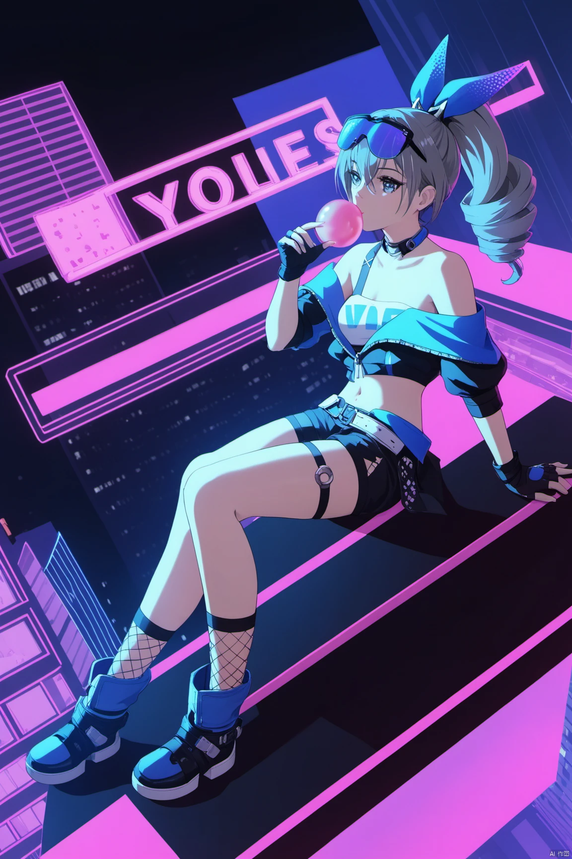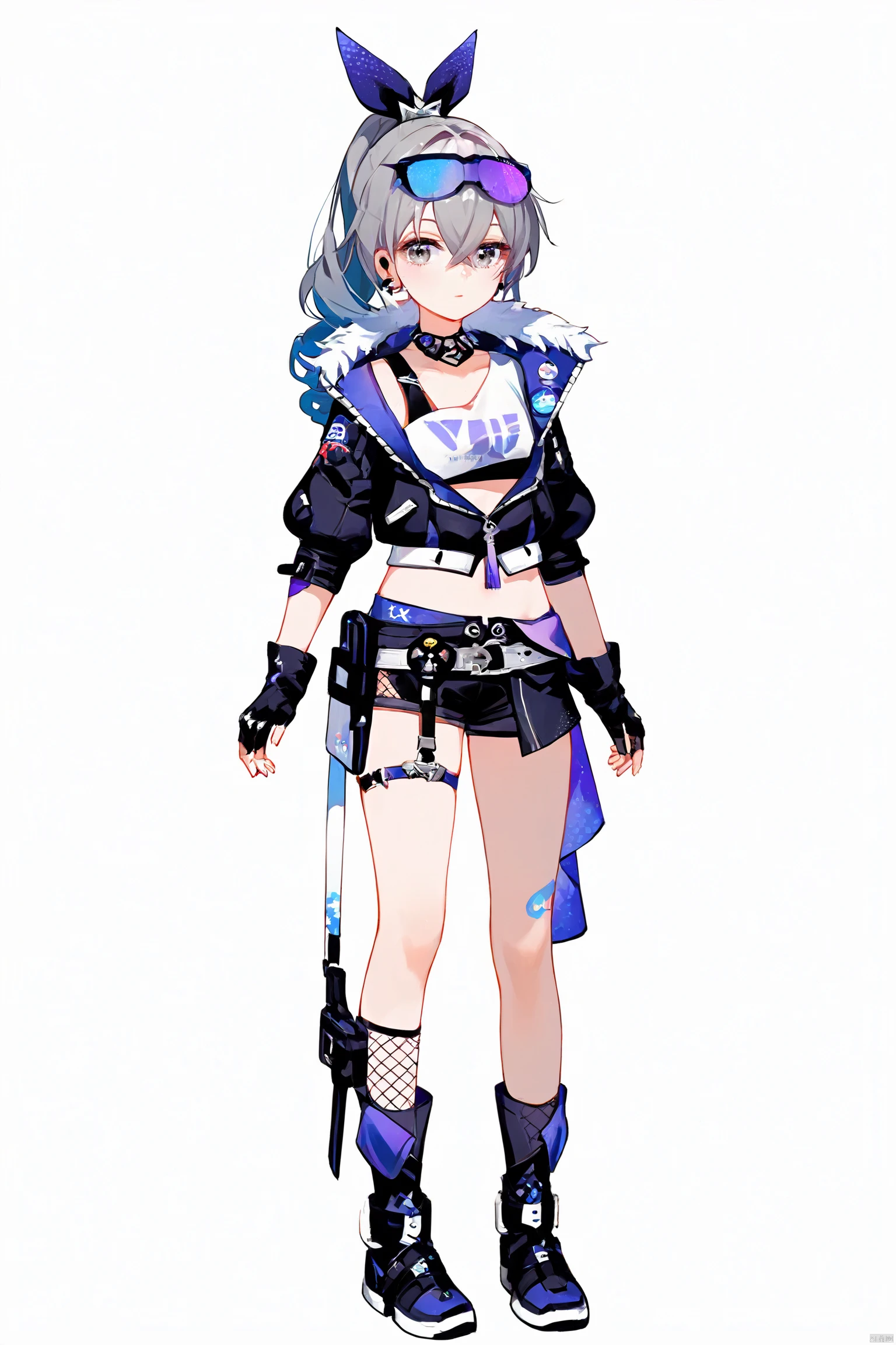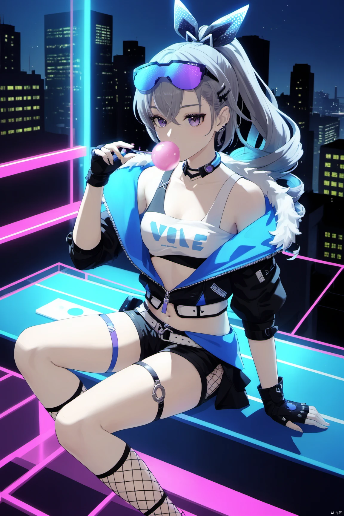 yinlang, bronya zaychik, eyewear on head, grey eyes, jacket, shorts, drill hair, fingerless gloves, navel, grey hair, long hair, mesh socks,bubble blowing, chewing gum,