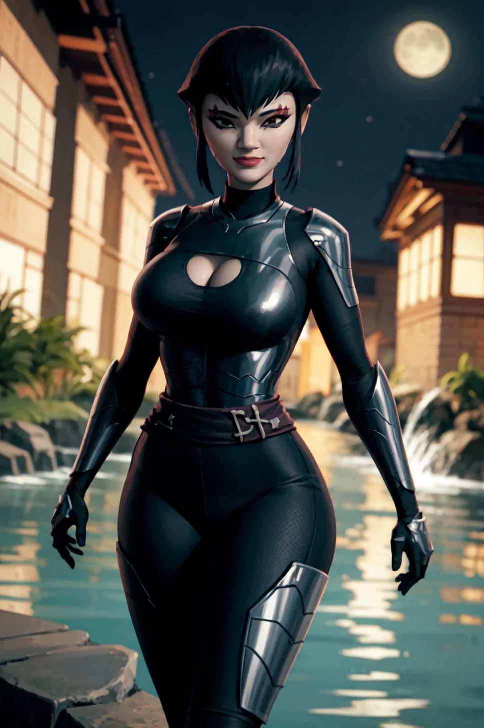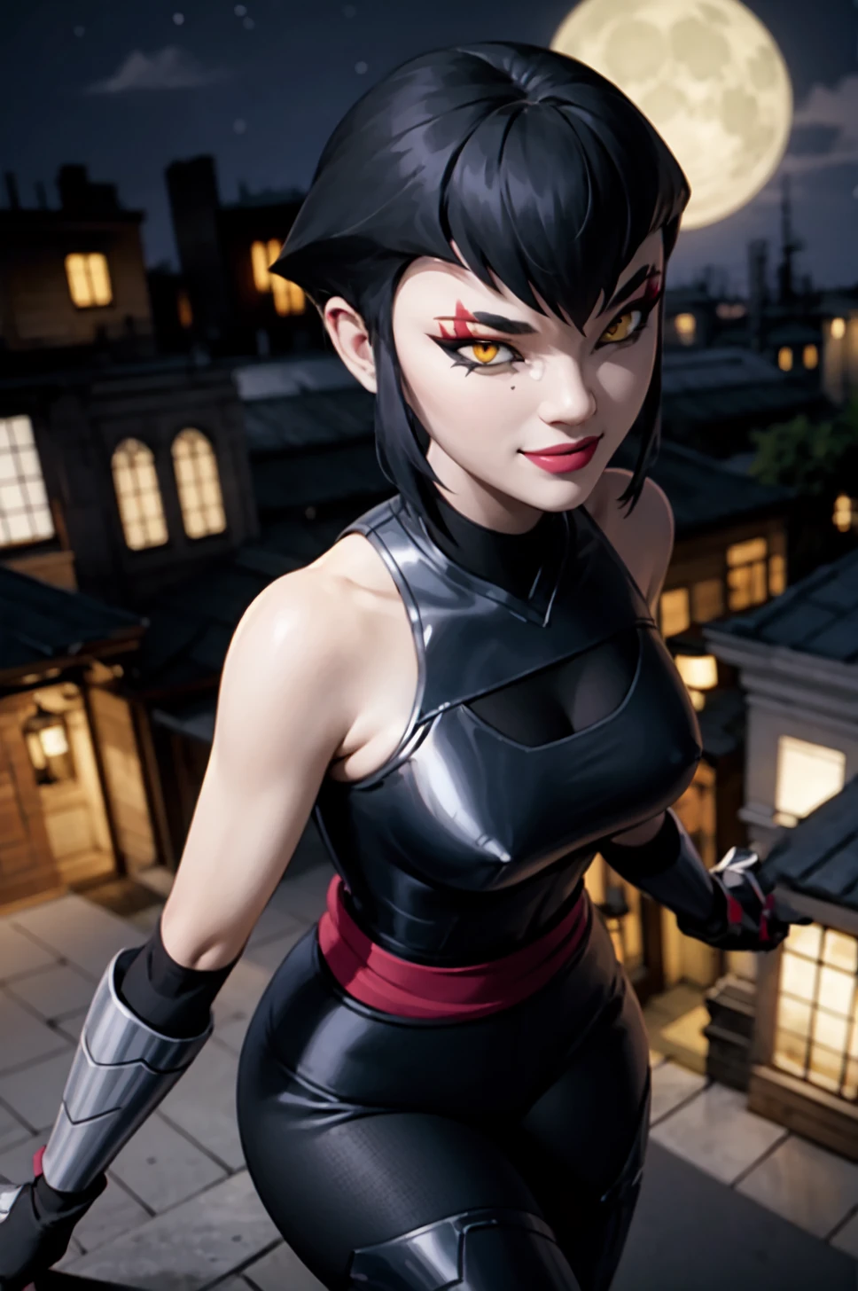 karai, yellow eyes, short hair, black hair, two-tone hair, makeup, 1girl, solo