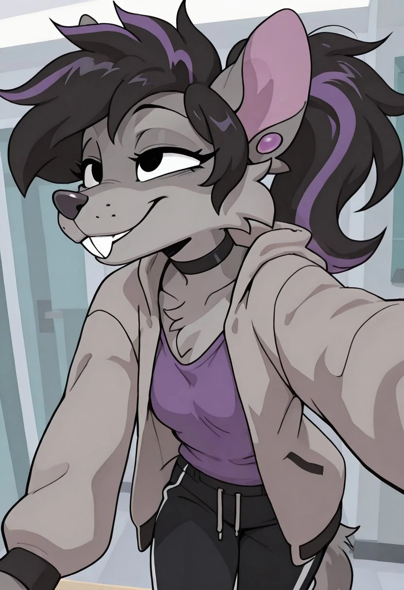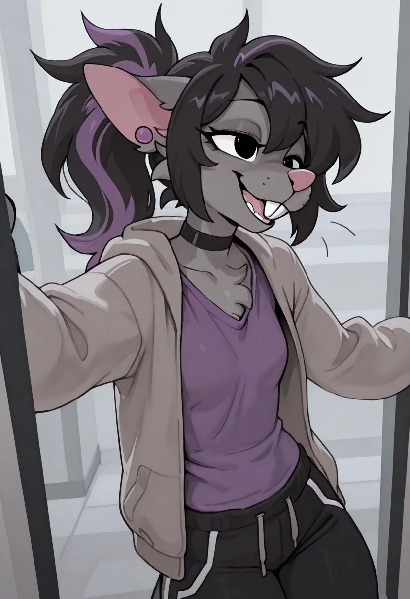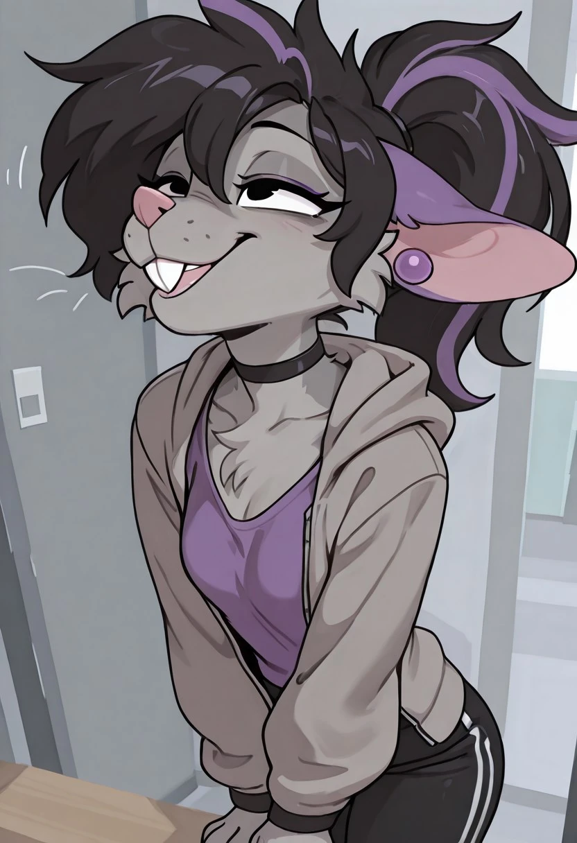 Mollyratv1, 1girl,black eyes,furry, buckteeth, ponytail, grey body, black hair, purple highlights,Purple ear piercing,multicolored hair,