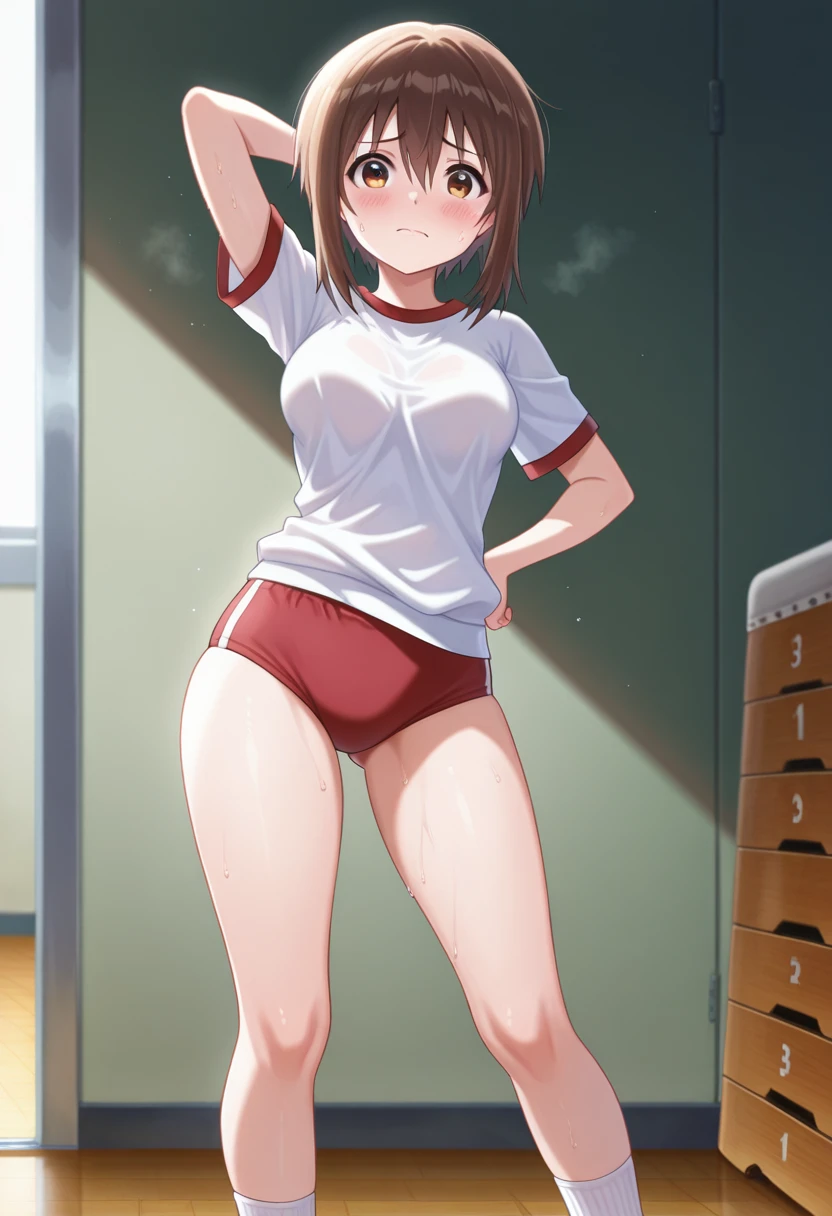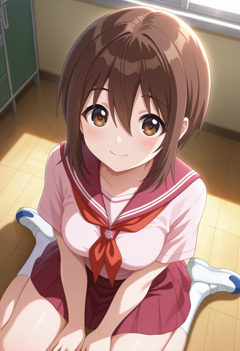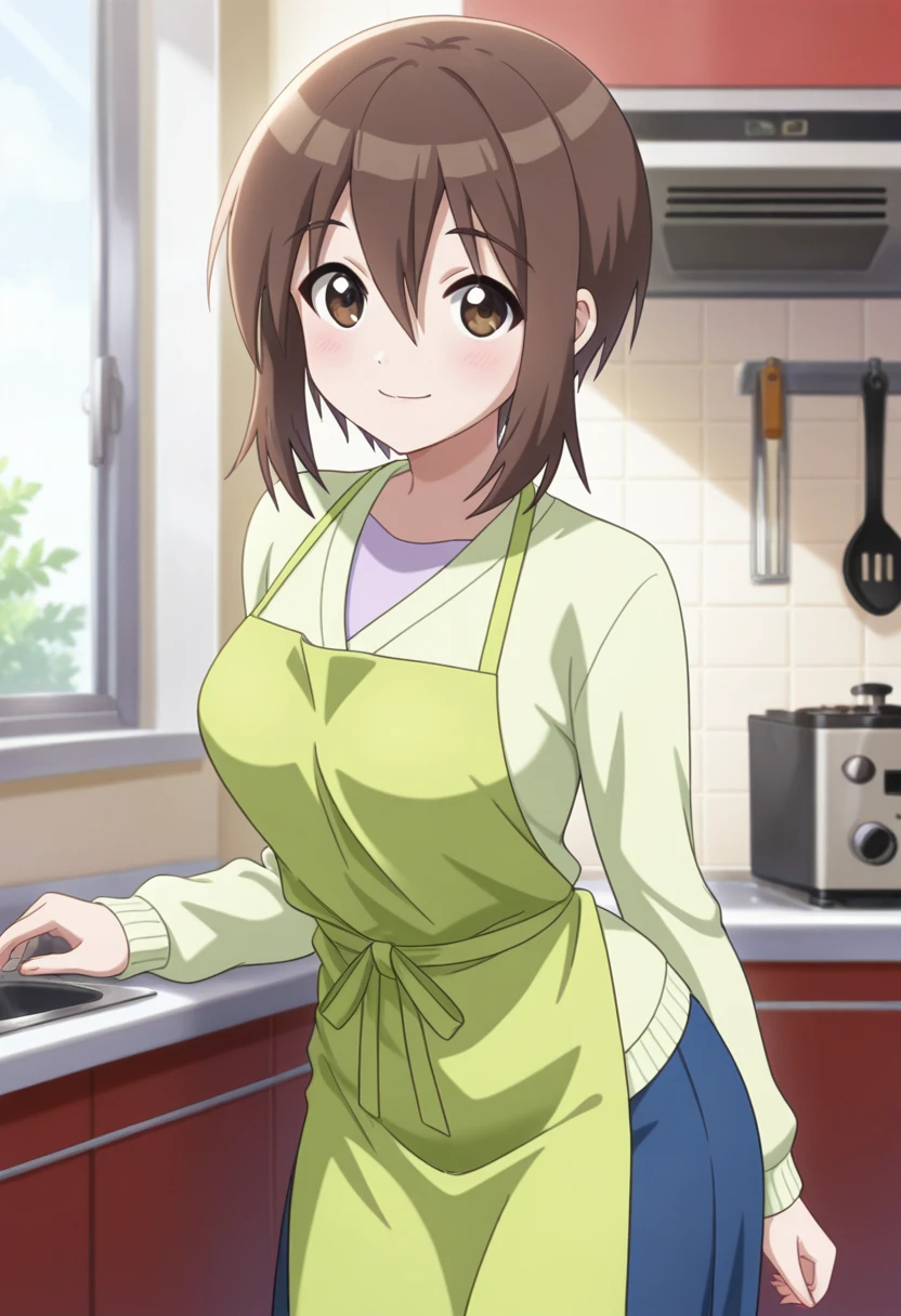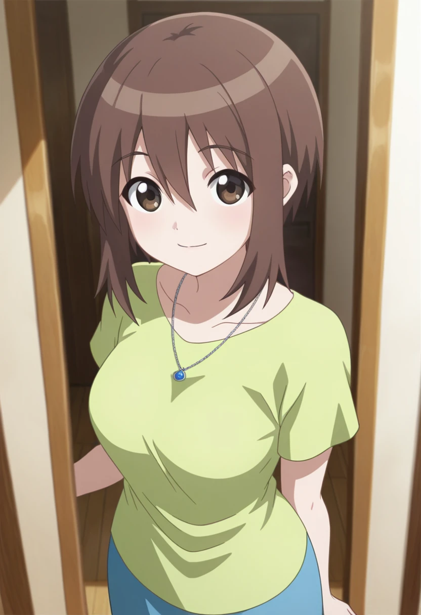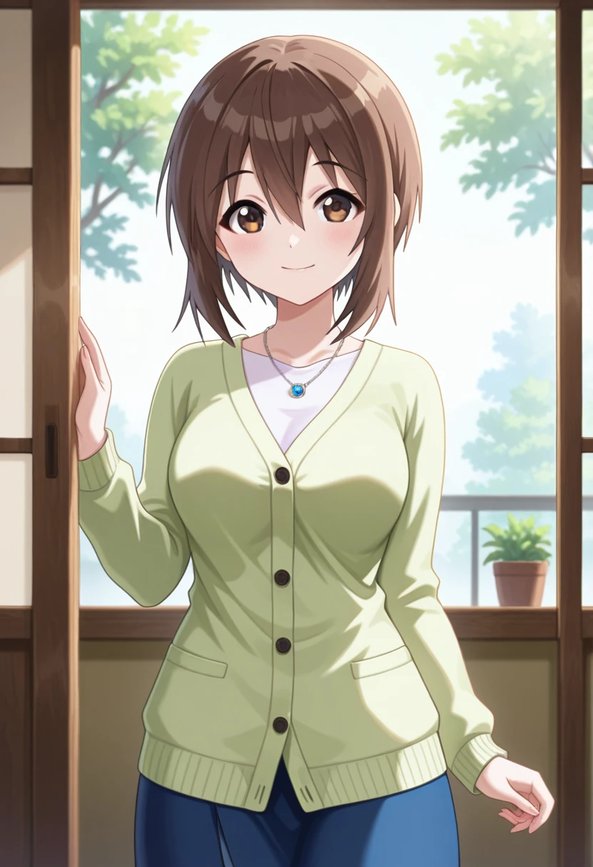 n-motherww, brown eyes, brown hair, short hair, bangs, hair between eyes, sidelocks, medium breasts,