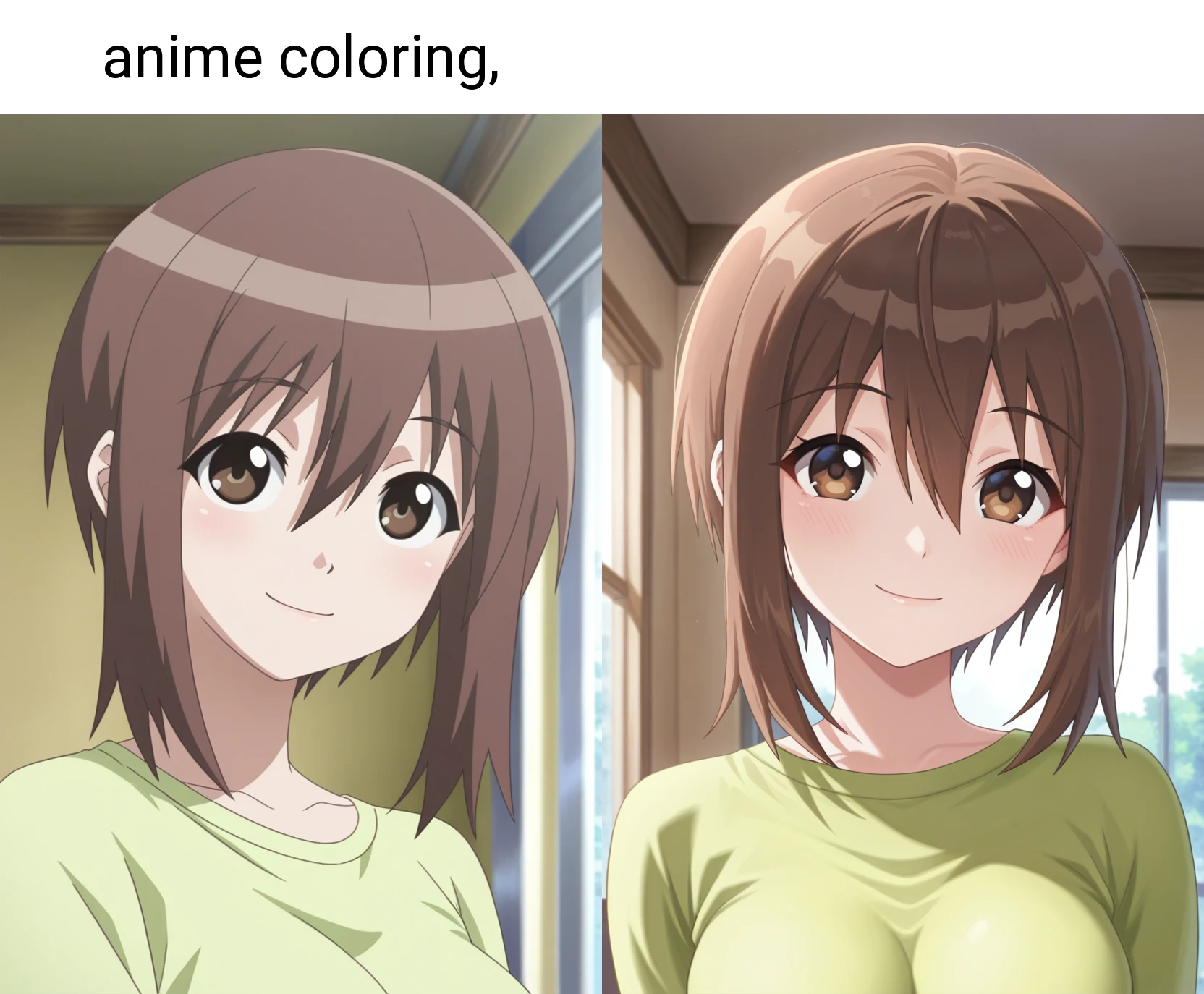 Using 'anime coloring' in the prompt will make the illustration look closer to an anime style.
